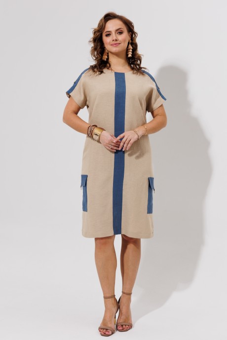 Платье женское прямого силуэта слегка приталенное по линии талии, выполнено из льна двух цветов. По переду расположена вертикальная вставка из другого цвета ткани. Накладные карманы с клапаном и и полукольцом расположены на боковых швах. На переде имеется вытачка идущая из бокового шва. Спинка со средним швом в котором расположена застежка горловины на одну пуговицу и внизу имеется разрез. Платье с рукавами покроя ""реглан"", на котором расположена вставка из другого цвета ткани. По плечевому шву идёт полоска заканчивающаяся полукольцом. Горловина "лодочка".