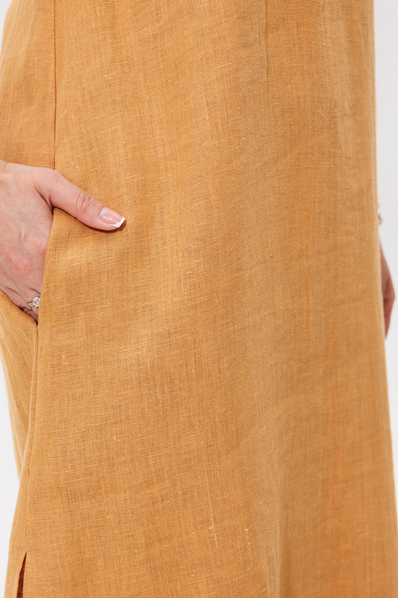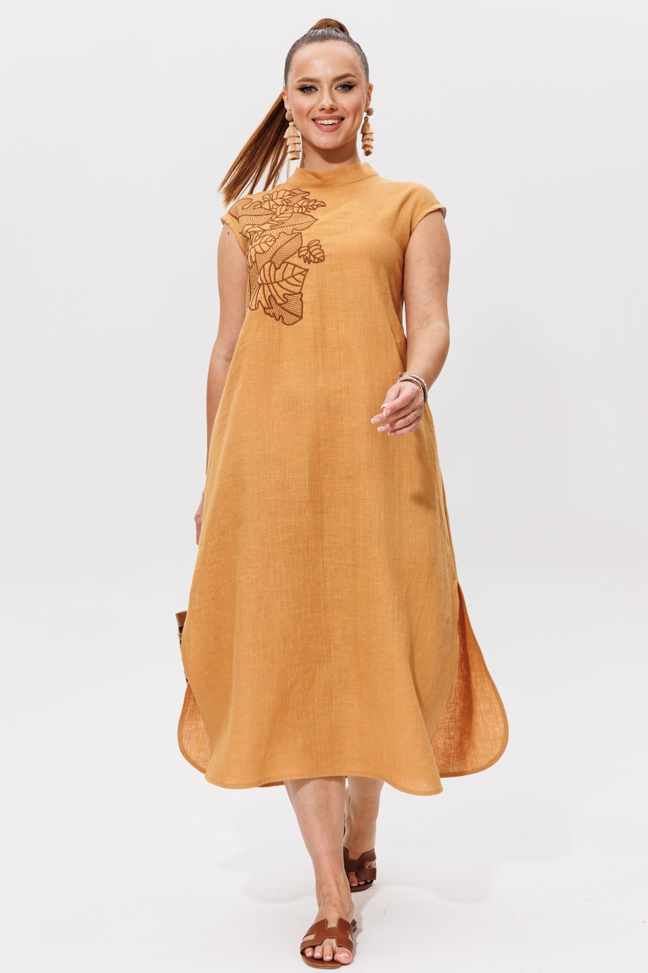 Это стильное летнее платье- сарафан с карманами идеально подходит для тёплых дней. Лёгкий, воздухопроницаемый лен обеспечит вам комфорт даже в самый жаркую погоду. Платье А силуэта идеально сидит на фигуре, подчёркивая её достоинства и создавая элегантный силуэт. Длина платья макси придает образу утончённость а наличие удобных карманов и высоких разрезов по бокам, добавляет практичность. Платье подходит для беременных женщин, а также для женщин с особенностями фигуры. Платье со стойкой по горловине и застёжкой сзади на потайную молнию. Изюминкой этого платья является дизайнерская вышивка. Это платье станет отличным выбором, как для повседневных выходов так и для вечерних прогулок.