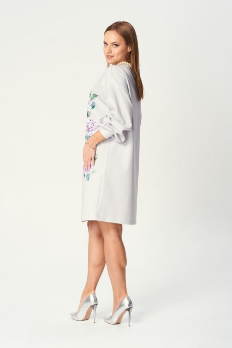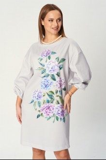 Платье свободного силуэта из трикотажной ткани с принтом. Рукав втачной одношовный со складками по низу и манжетой. Горловина обработана планкой в форме лодочки.