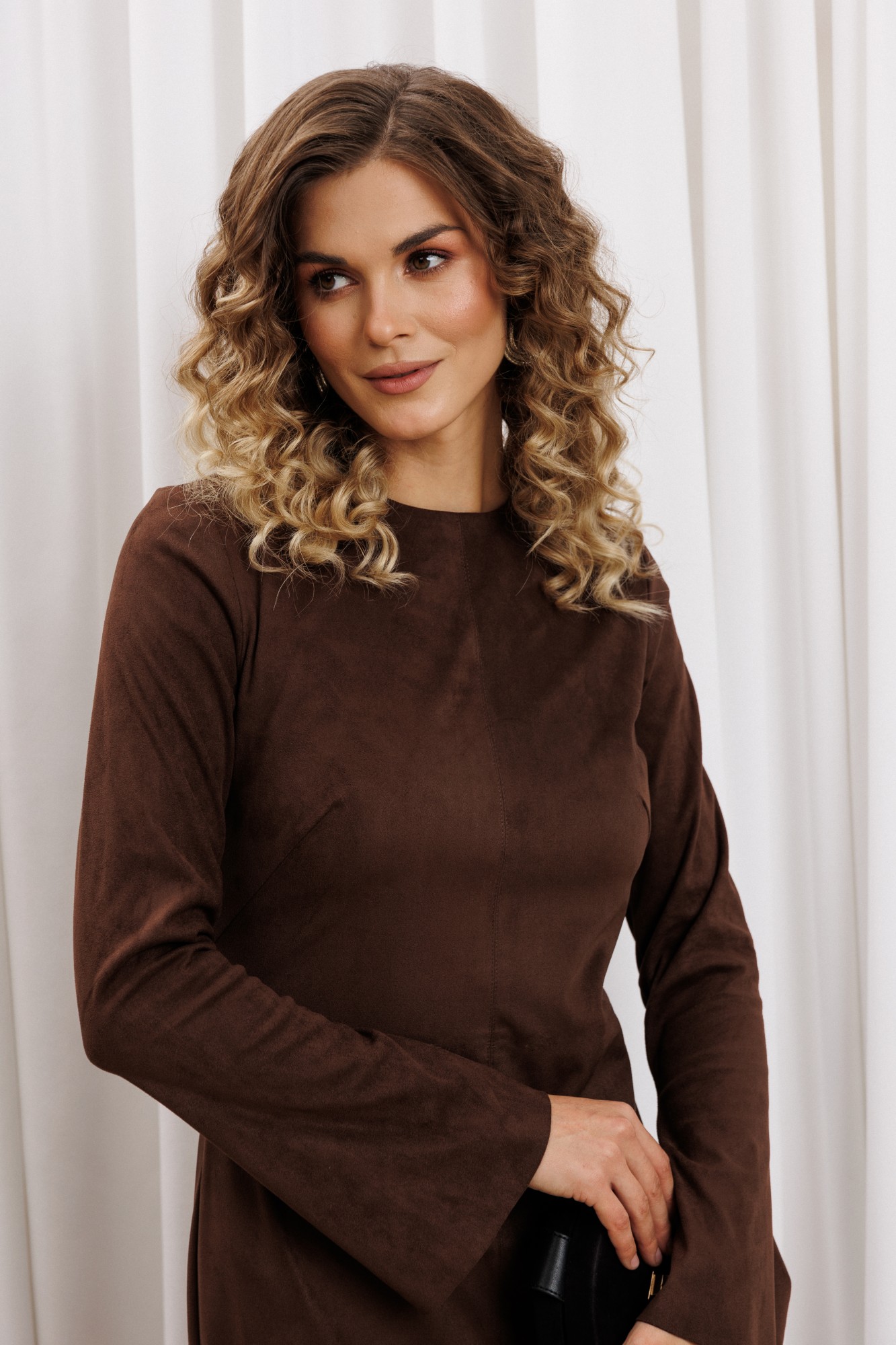 Платье приталенного силуэта отрезное по линии талии из мягкой замшевой ткани. Перед со средним швом и нагрудной вытачкой. Спинка с таллиевыми вытачками, средним швом и потайной молнией. Рукав втачной слегка расширенный книзу. По низу изделия ассиметричный волан. Средний шов и шов вдоль талии отстрочен отделочной нитью.