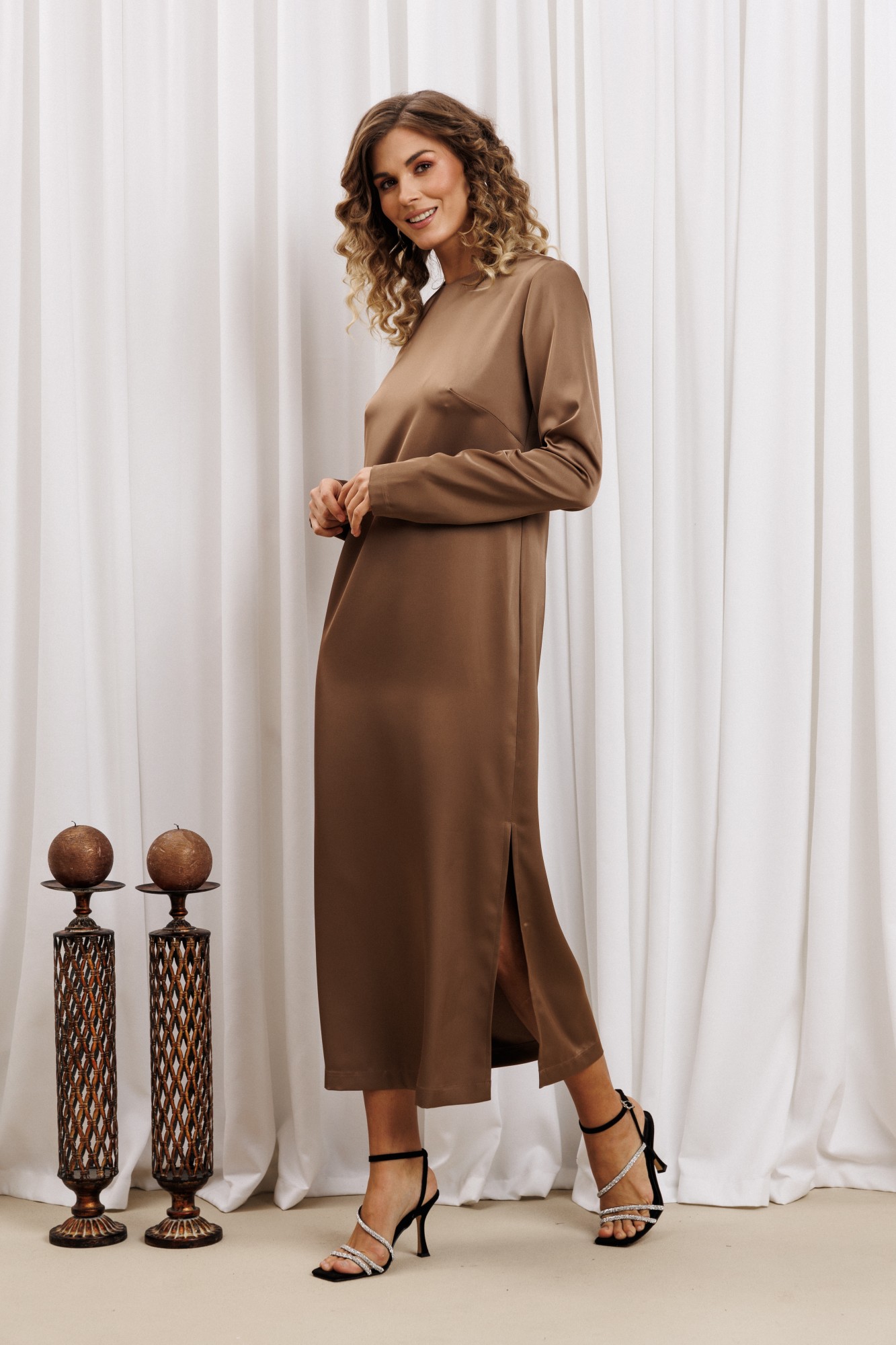 Платье прямого силуэта выполнено из атласной ткани. Перед с нагрудной вытачкой. Спинка с застежкой "капелькой" на петлю и пуговицу сверху. В боковом шве разрез. Рукав втачной одношовный. К платью прилагается пояс из основной ткани.