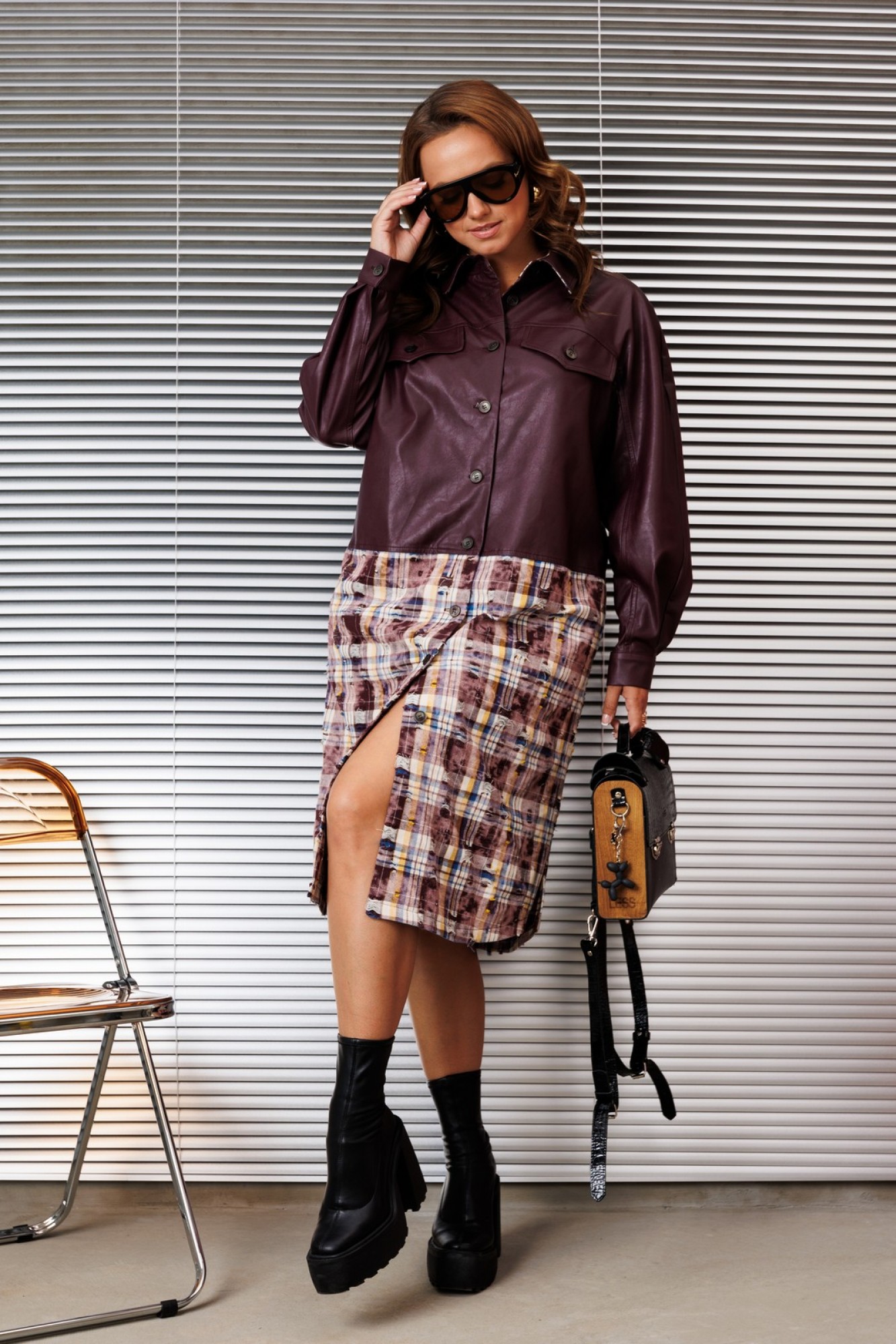 Платье- рубашка свободного силуэта, комбинированно из двух тканей. Вырез горловины рубашечного типа , застежка на петли и пуговицы по переду. В боковых швах карманы, по переду кокетка и клапаны. В комплекте ремень из основной ткани. Рукав длинный на манжете внизу.