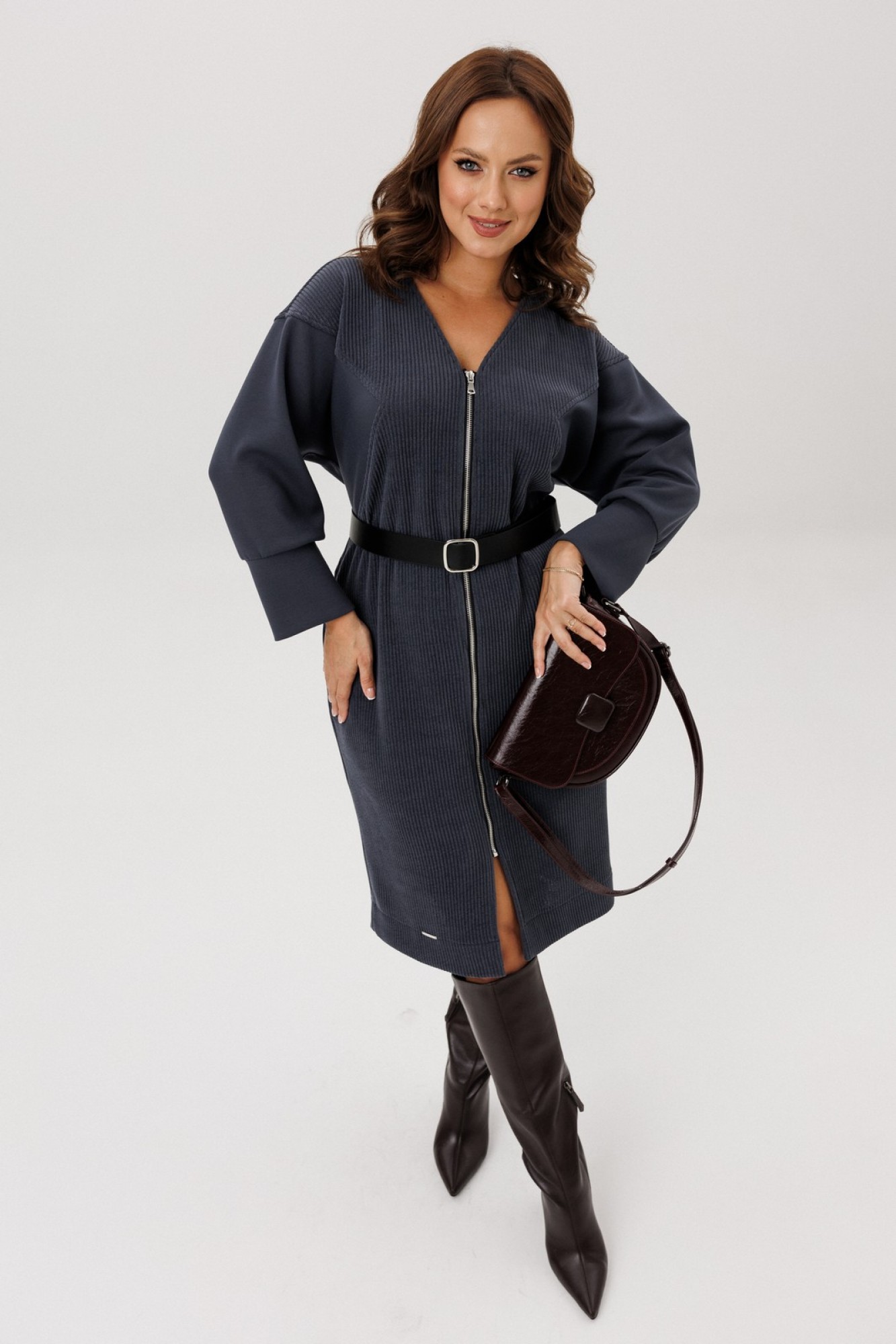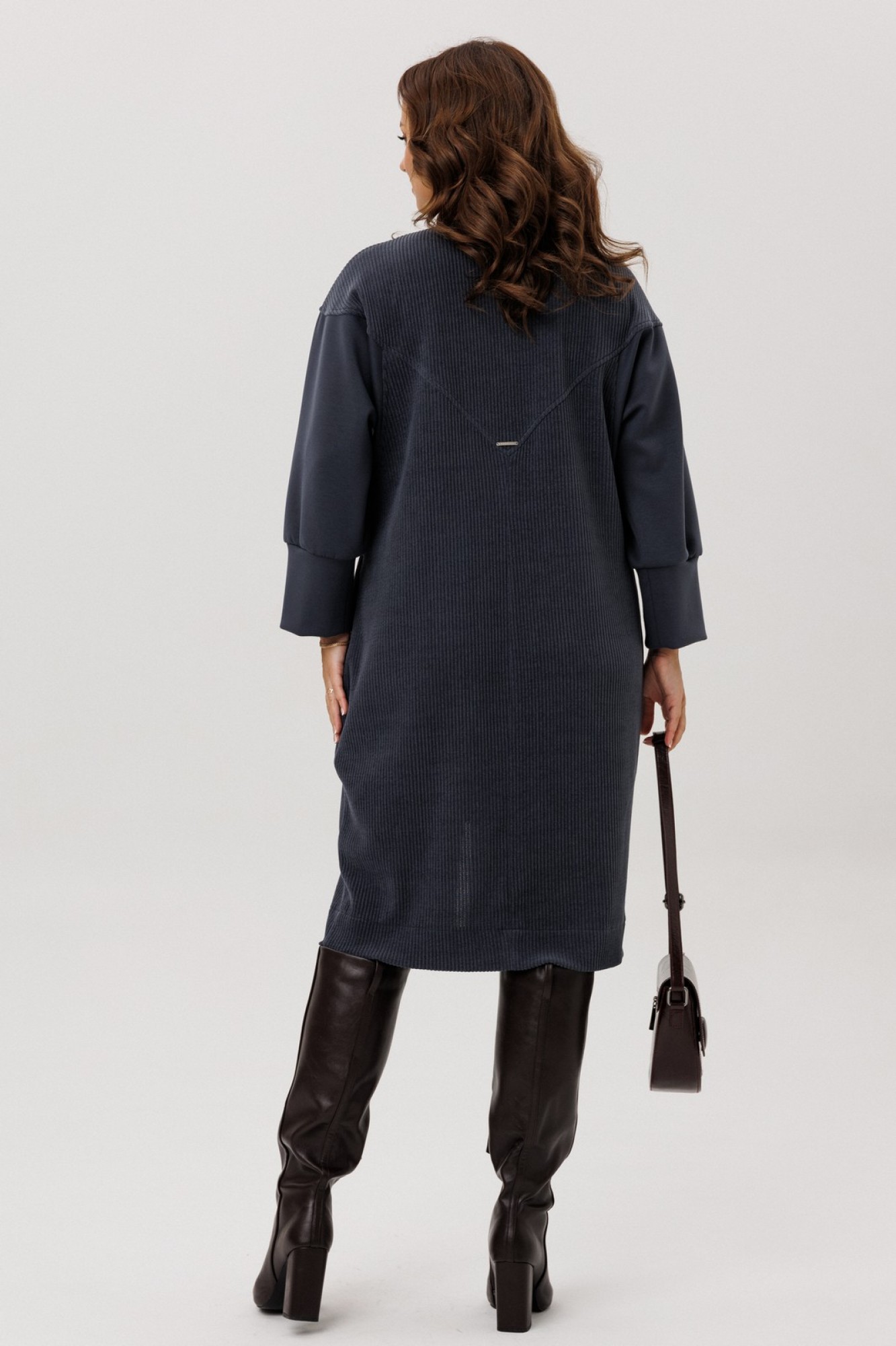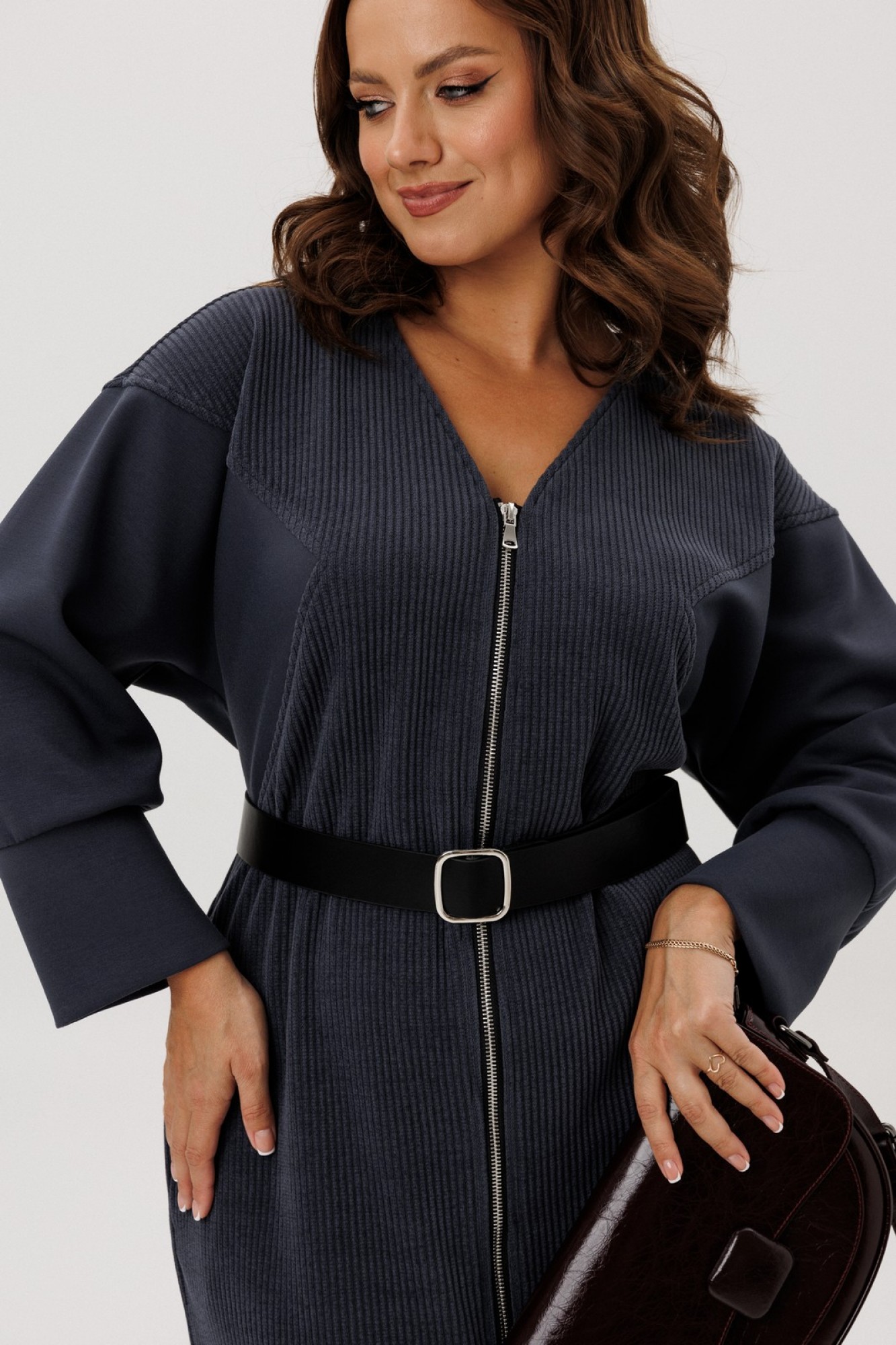 Платье полуприлегающего силуэта, вырез горловины V – образный, рукав цельнокроеный спущенный со вставками из кожи и на манжете внизу. По спинке кокетка, в боковых швах функциональные карманы. Застежка на тесьму-молнию. В комплекте ремень из экокожи.