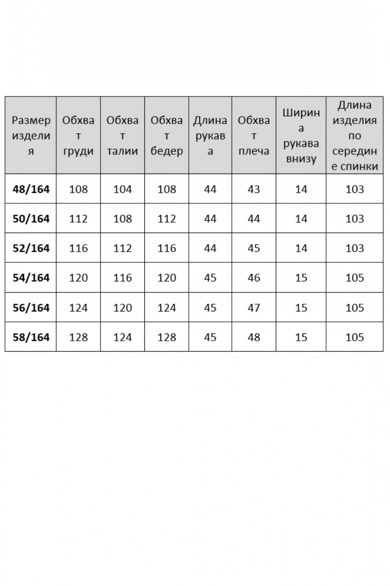 Длина рукава в 48-52рр – 43см, в 54-58рр – 44см, ширина плеча – 20см, длина изделия в 48-52рр– 103см, в 54-58рр – 108см.