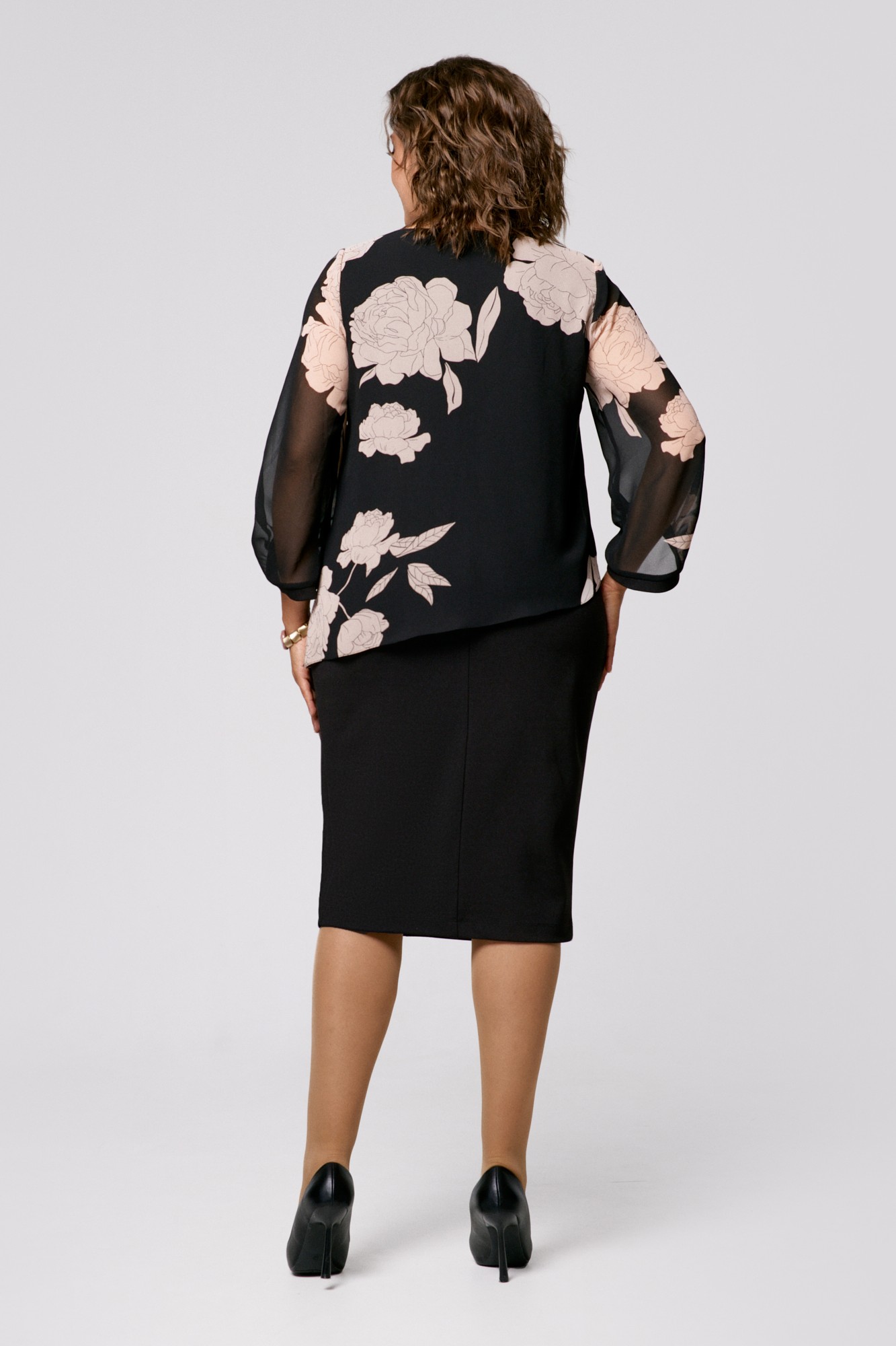 Нижнее платье: плательная ткань полиэстер 70%, вискоза 25%, эластан 5%; накидка: шифон 100%.