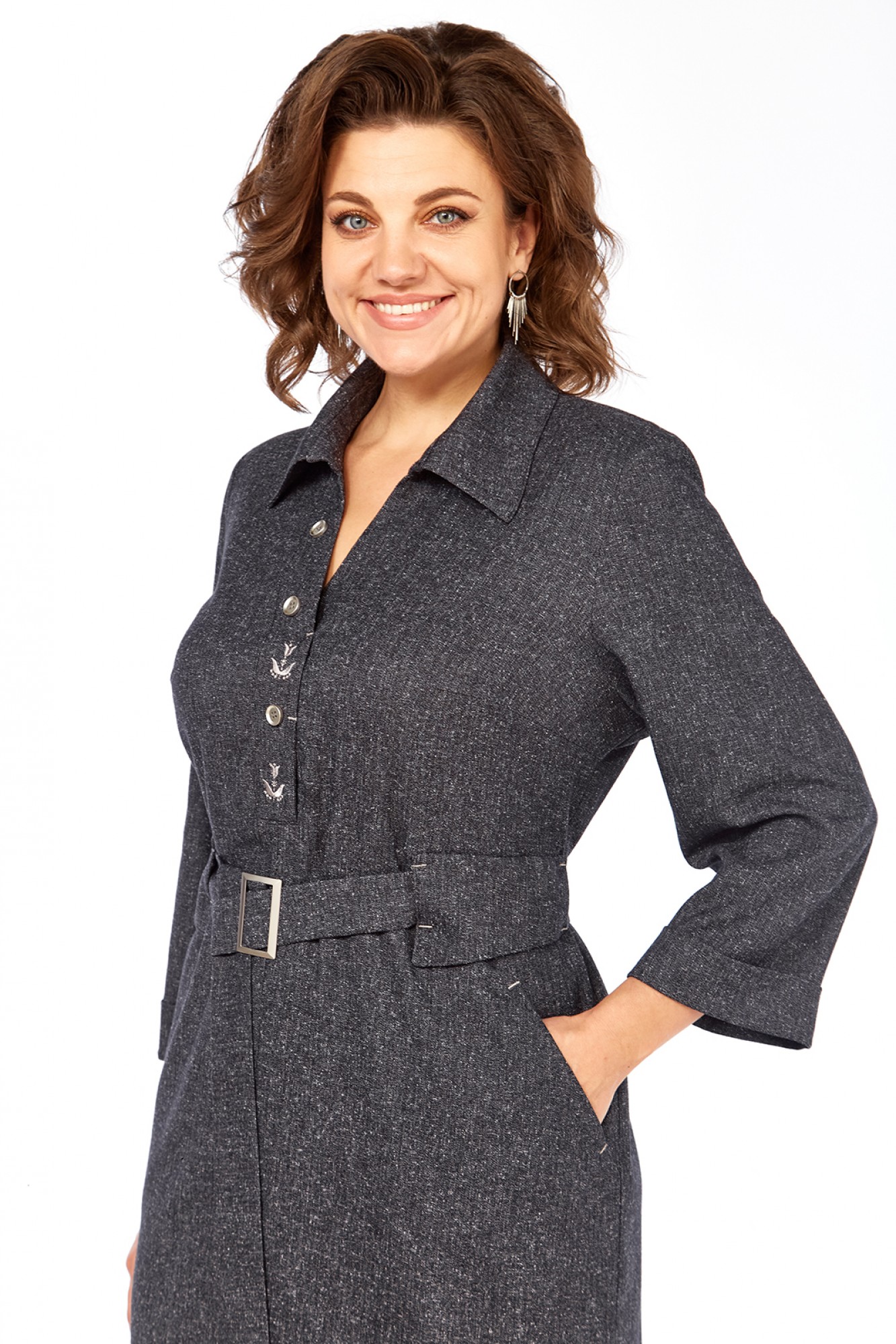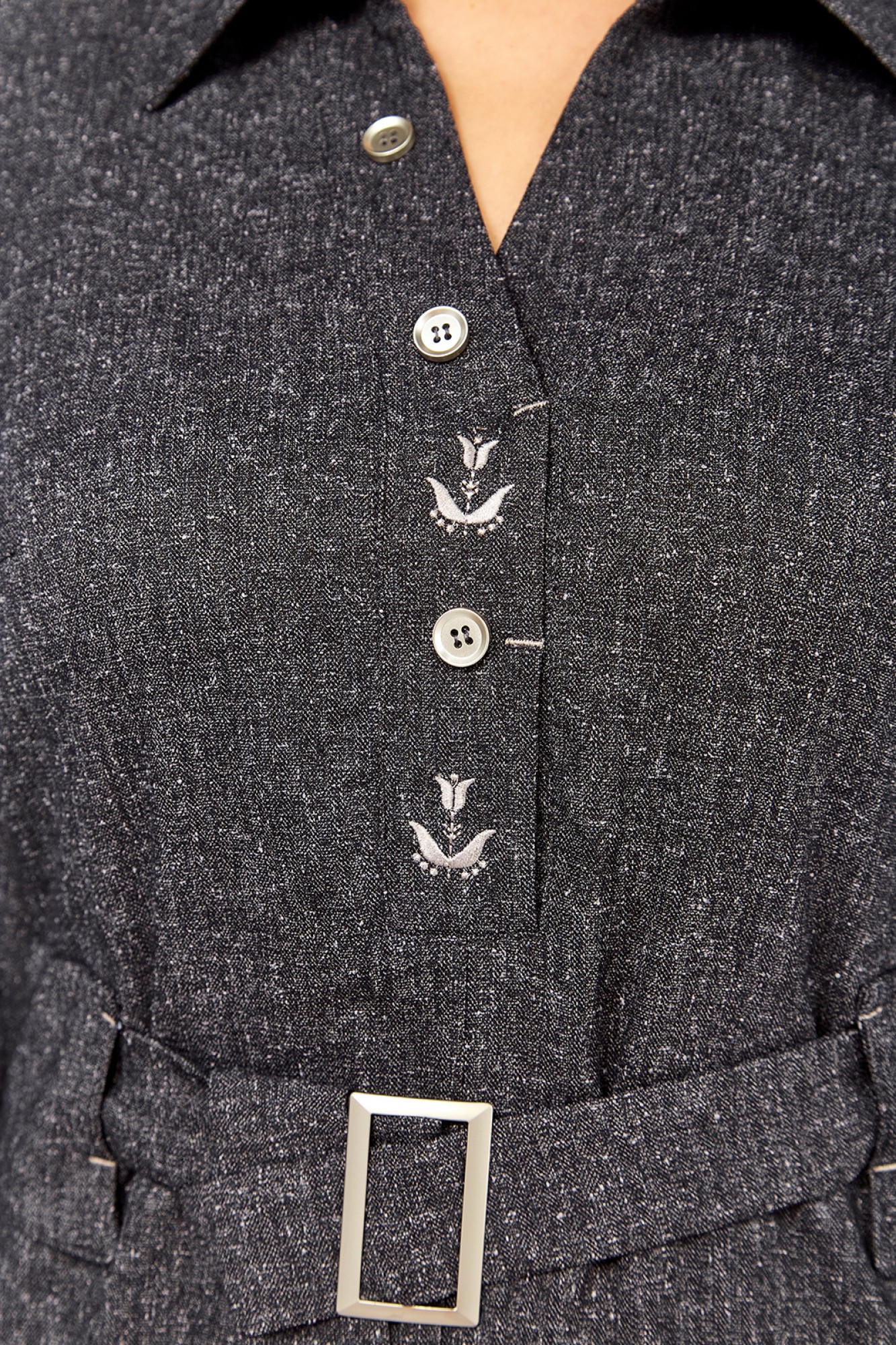 Платье женское прямого силуэта, изготовлено из плательной ткани. По переду нагрудные вытачки и фигурные подрезы с карманами в швах. Горловина оформлена планками с декоративной вышивкой и пуговицами, воротник стояче-отложной. На талии декоративные шлевки и съемный пояс с пряжкой. По спинке кокетка и средний шов. В боковых швах внизу обработаны шлицы декорированы пуговицами.