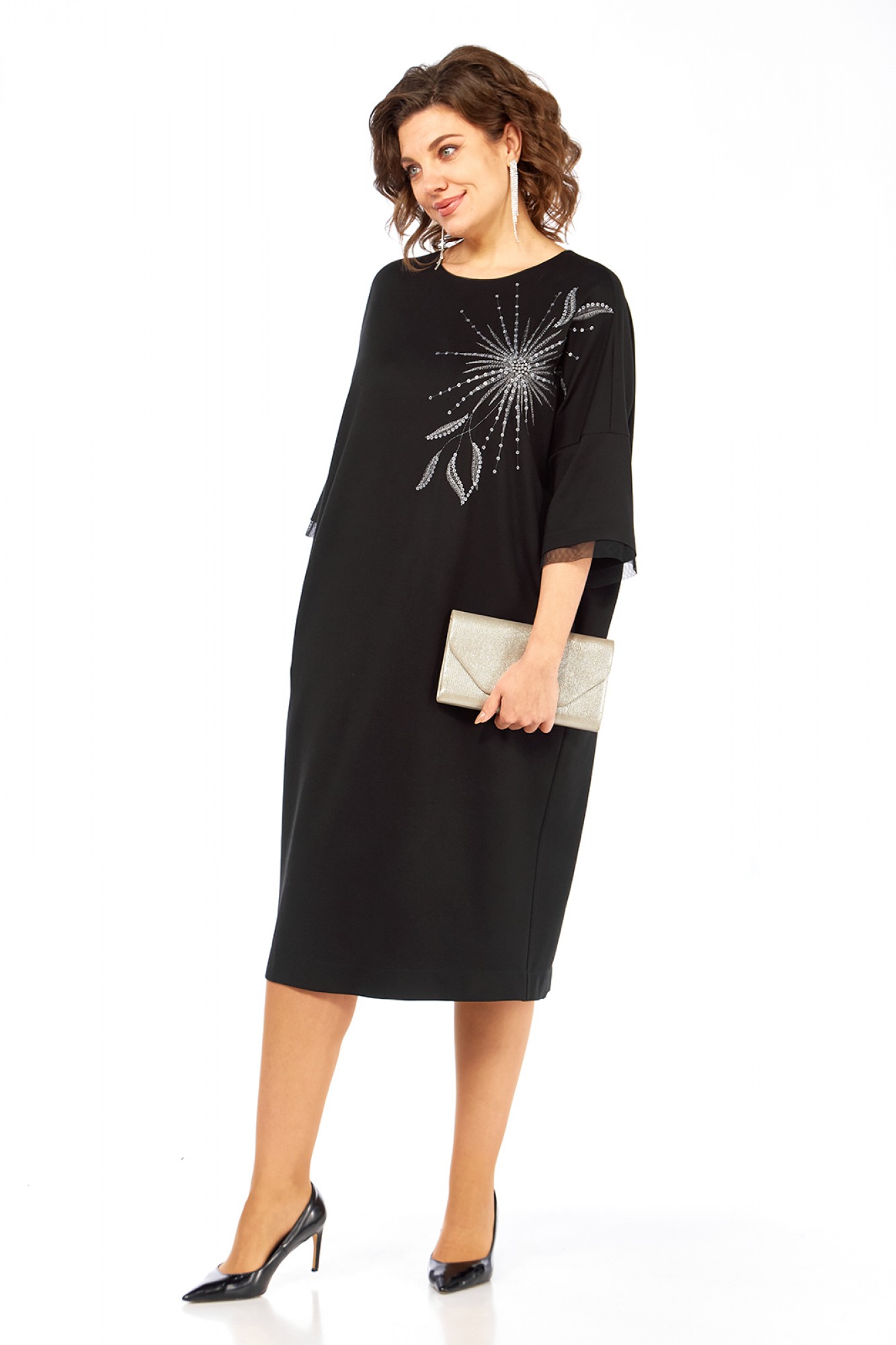Платье женское, нарядное, изготовлено из трикотажного полотна. Горловина круглой формы, с кантом. На полочке дизайнерская вышивка. Спинка со средним швом и декоративной застежкой вверху. Рукава спущенные, длиной ¾, с сеткой по низу.