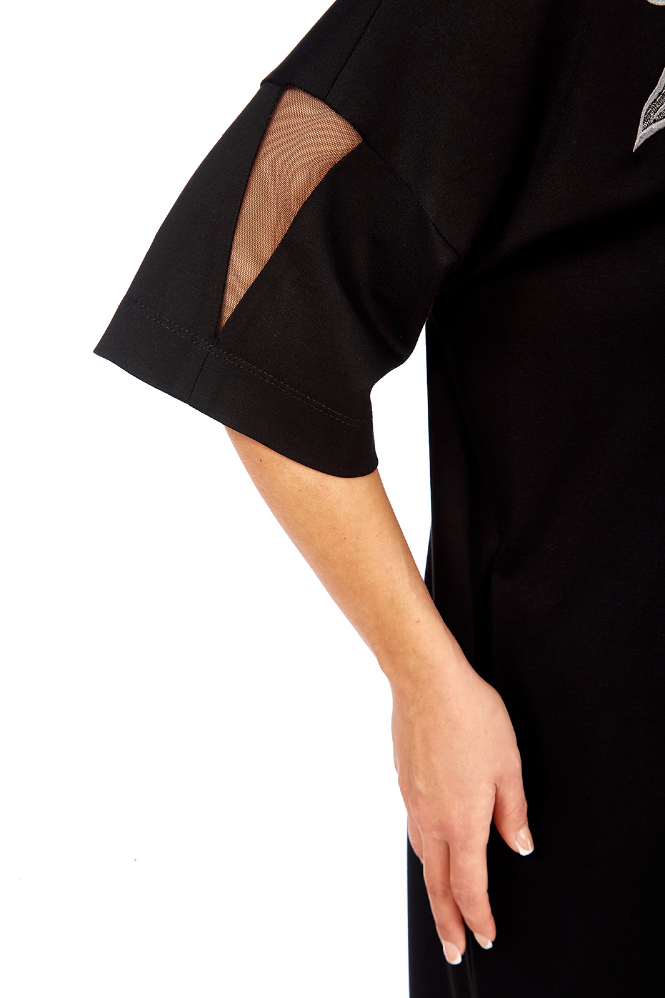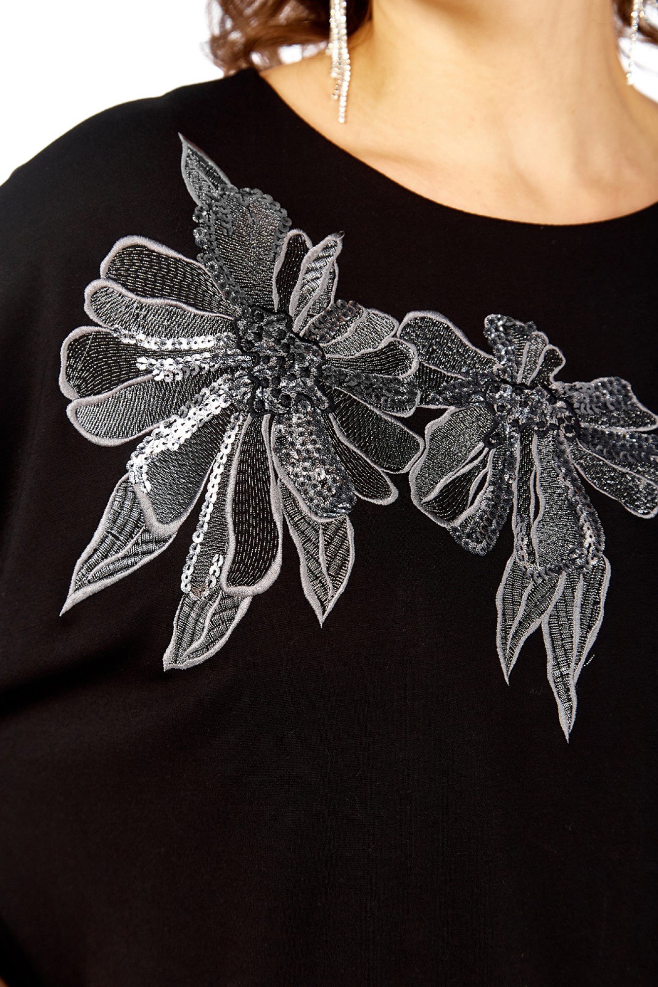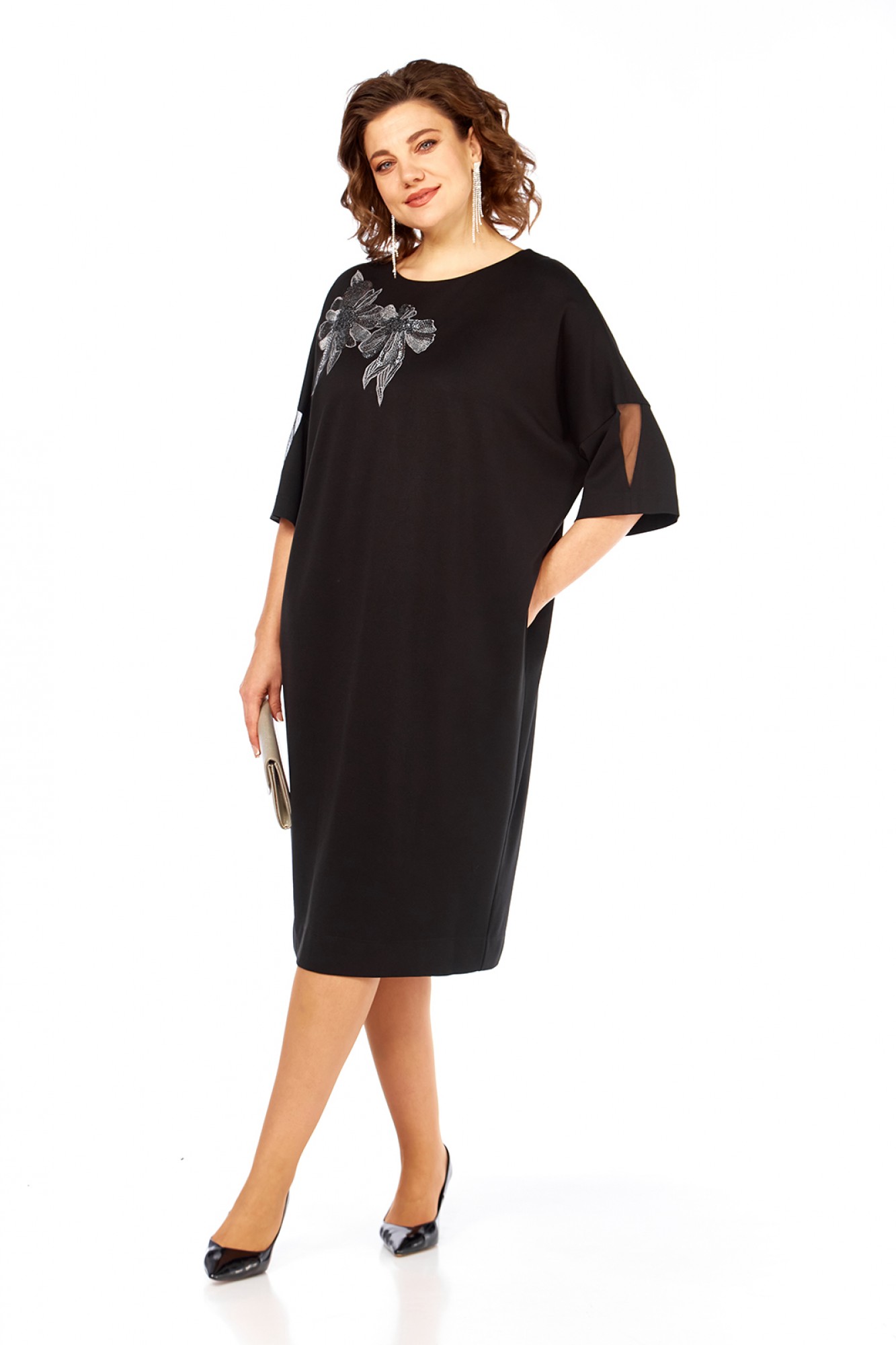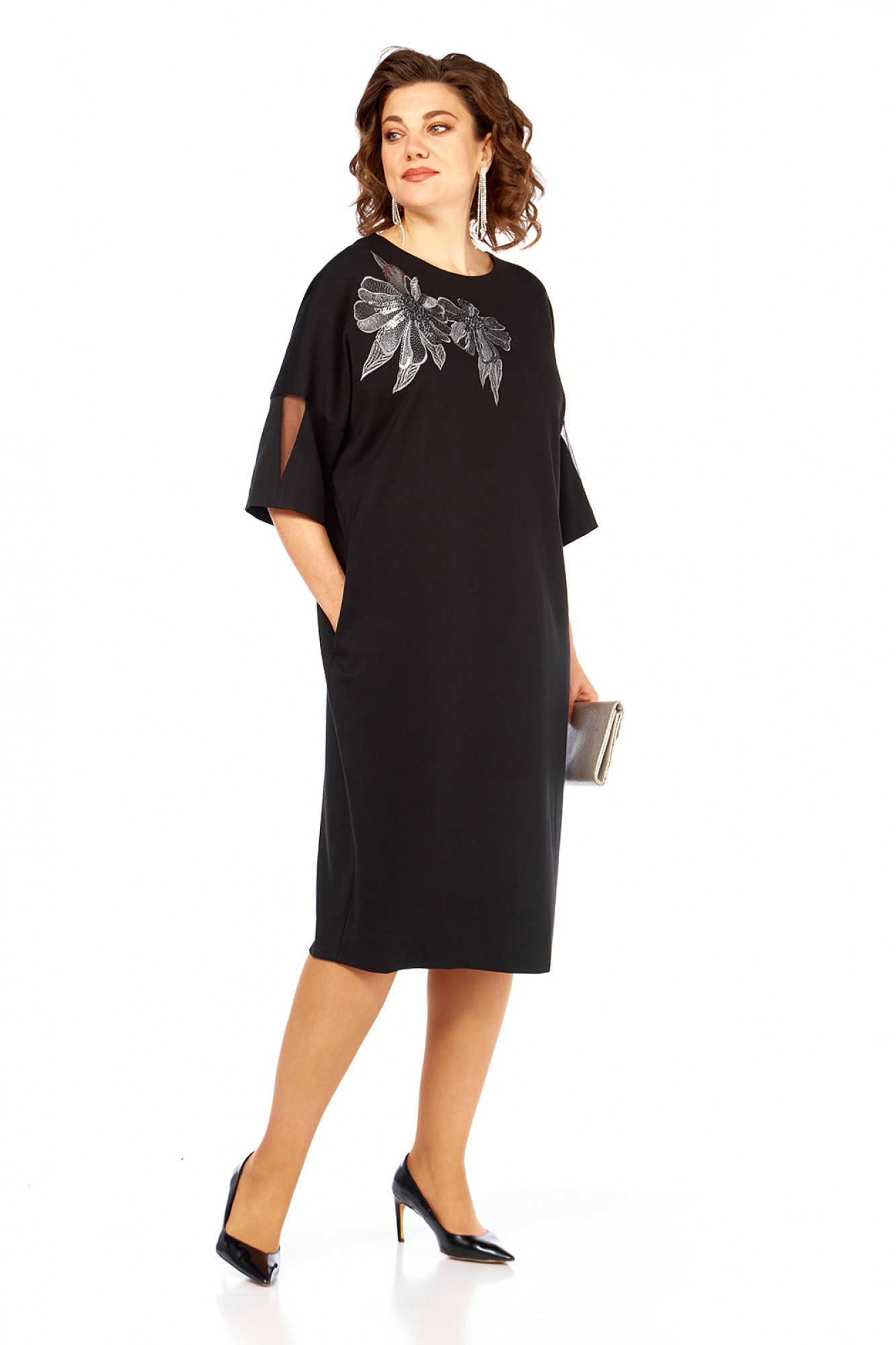 Платье женское нарядное, изготовлено из трикотажного полотна. Горловина круглой формы с кантом. На полочке дизайнерская вышивка. Спинка со средним швом и декоративной застежкой вверху. Рукава спущенные с кантом по низу.