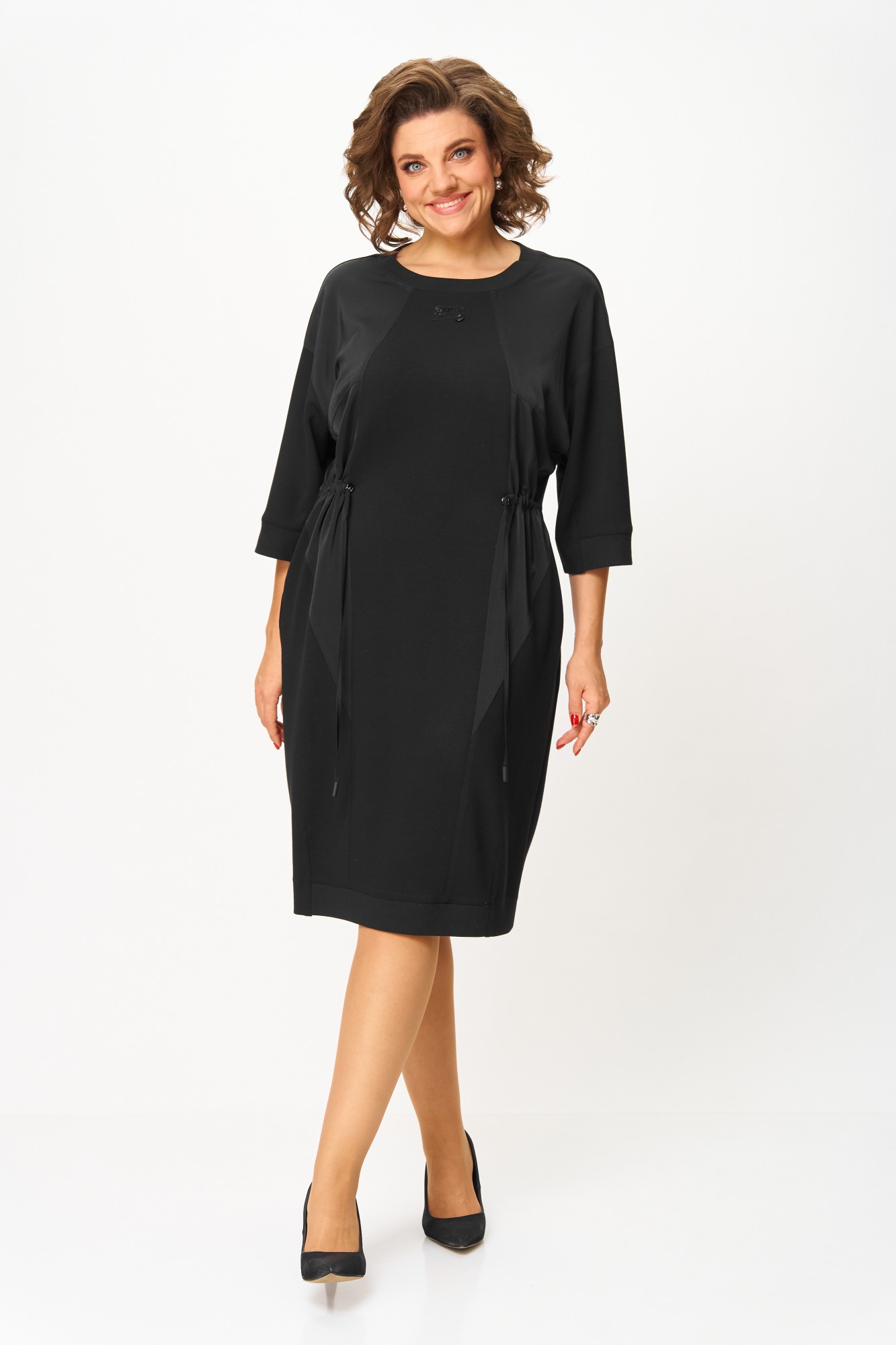 Платье женское, выполнено из трикотажного полотна с декоративными вставками из сатина в цвет основного полотна. Силуэт прямой, приталенный за счёт кулисы по передней части платья.