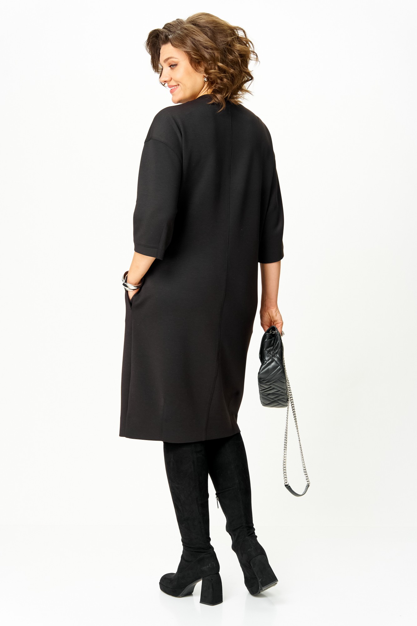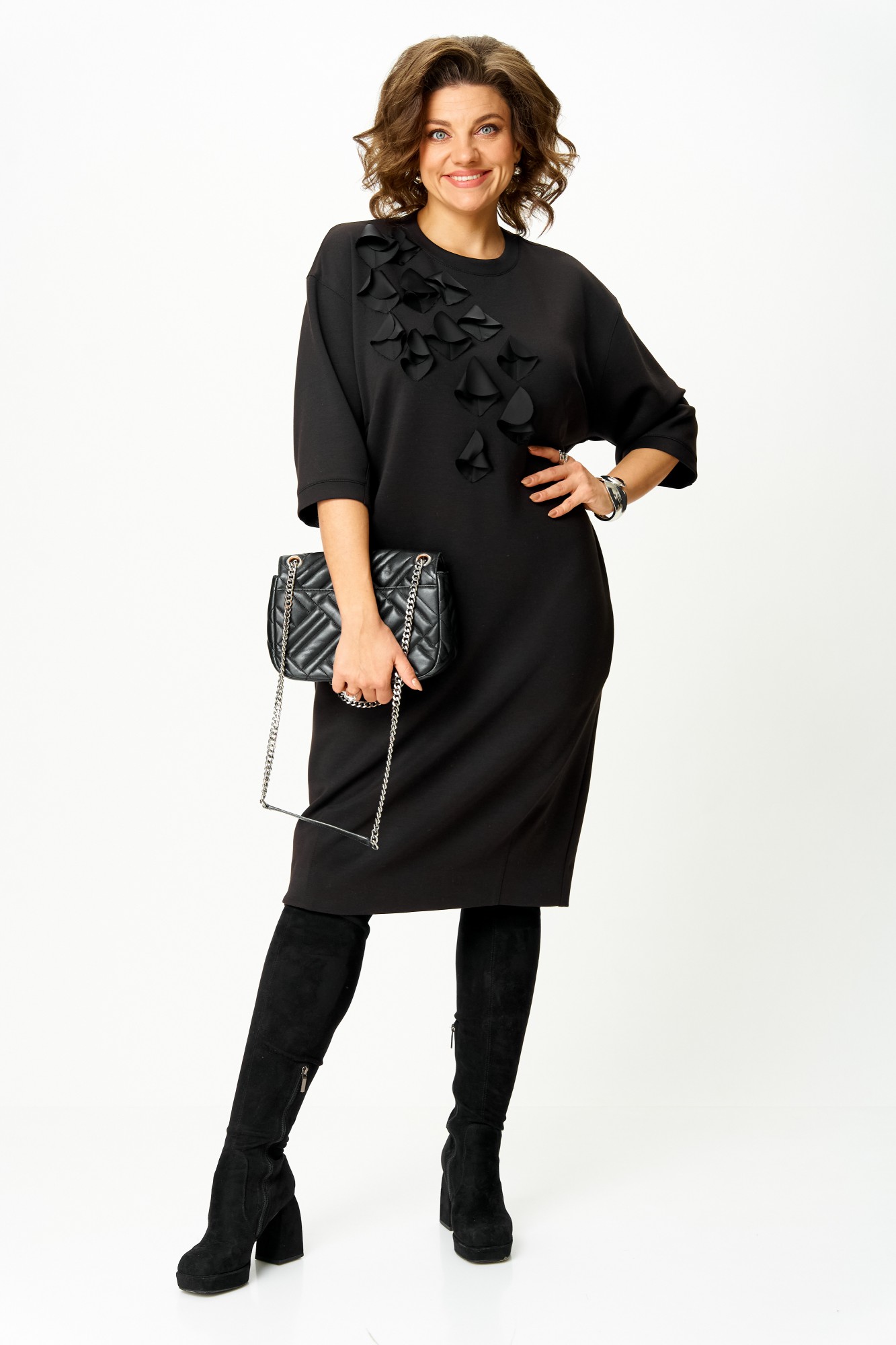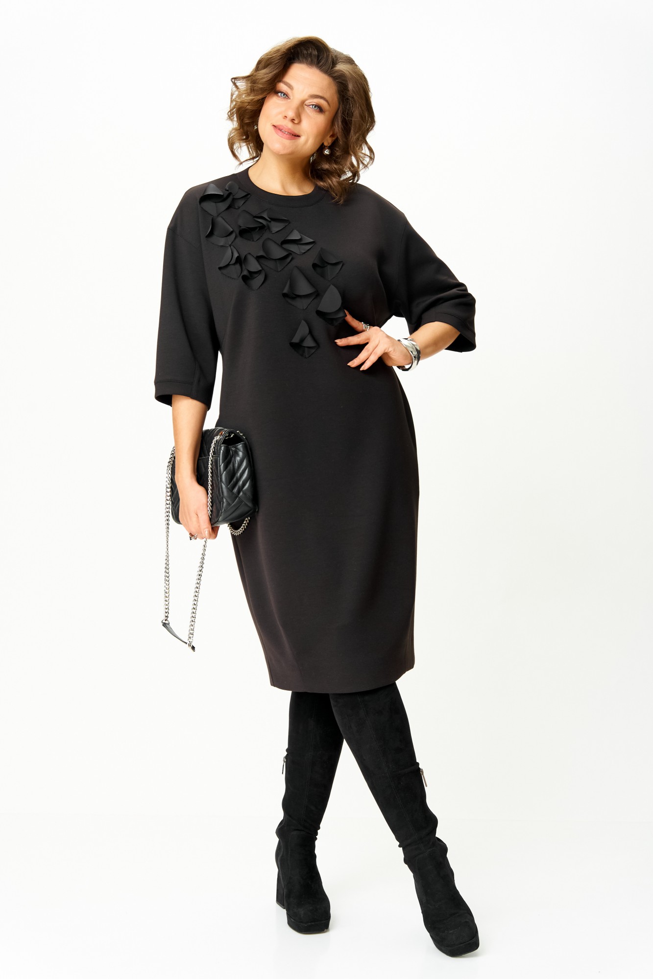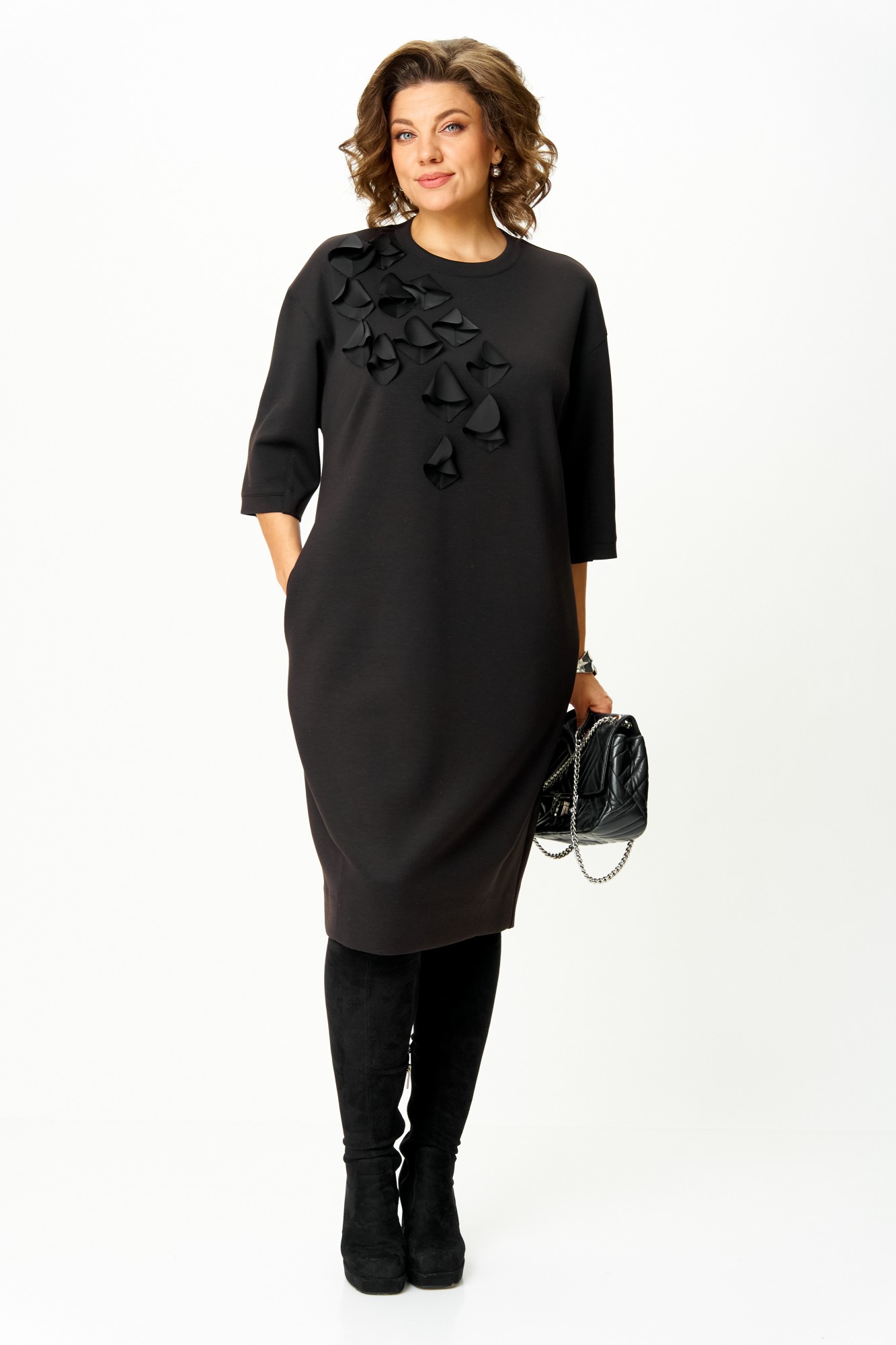 Платье выполнено из высококачественного гладкого трикотажного полотна с декоративной аппликацией из сатина в тон основной ткани. Силуэт прямой, к низу слегка заужено; линия плеча спущена. Горловина овальная, обработана декоративной бейкой. По переду настроена аппликация в виде лепестков. Карманы в боковых швах. Рукав длиной 3/4, прямой , низ обработан бейкой. Спинка со средним швом. Платье без застёжки, без подкладки.