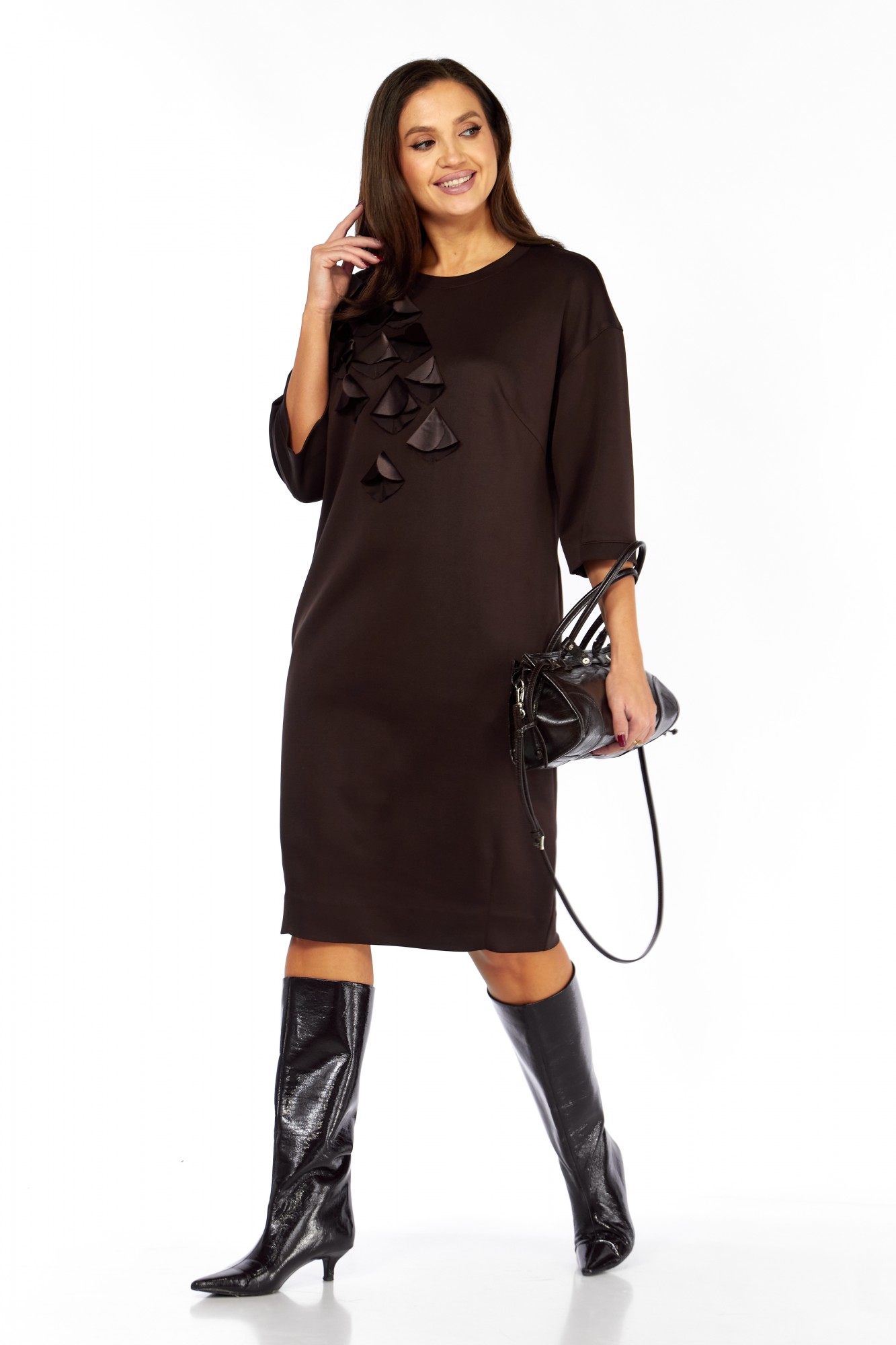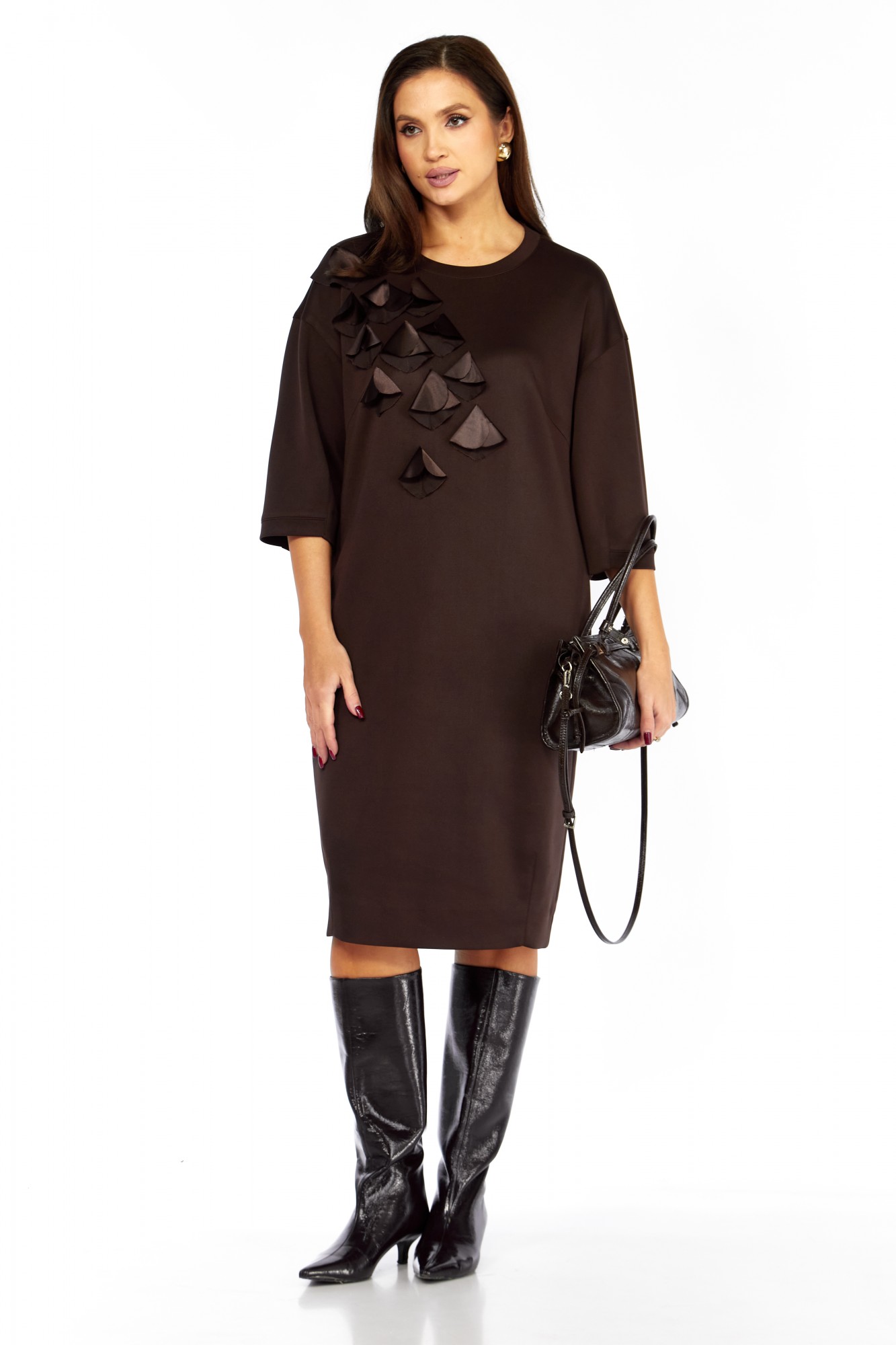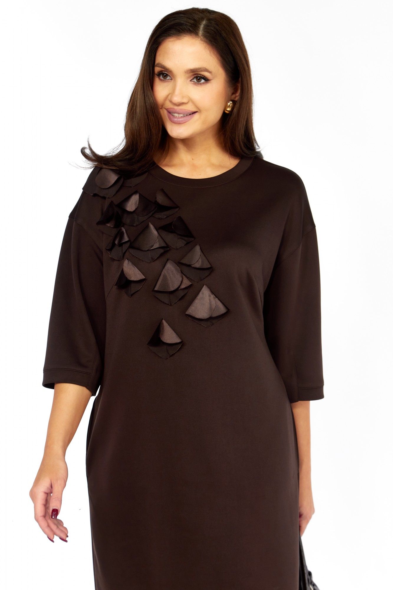 Платье выполнено из высококачественного гладкого трикотажного полотна с декоративной аппликацией из сатина в тон основной ткани. Силуэт прямой, к низу слегка заужено; линия плеча спущена. Горловина овальная, обработана декоративной бейкой. По переду настроена аппликация в виде лепестков. Карманы в боковых швах. Рукав длиной 3/4, прямой , низ обработан бейкой. Спинка со средним швом. Платье без застёжки, без подкладки.