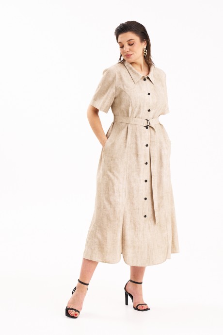 Платье-рубашка А-образного силуэта длиной миди с рукавом до локтя, рубашечным воротником и центральной застёжкой на контрастные пуговицы. По переду изделия идут рельефы переходящие в фигурные разрезы снизу. В боковых швах карманы. Комплектуется текстильным ремнём с пряжкой.