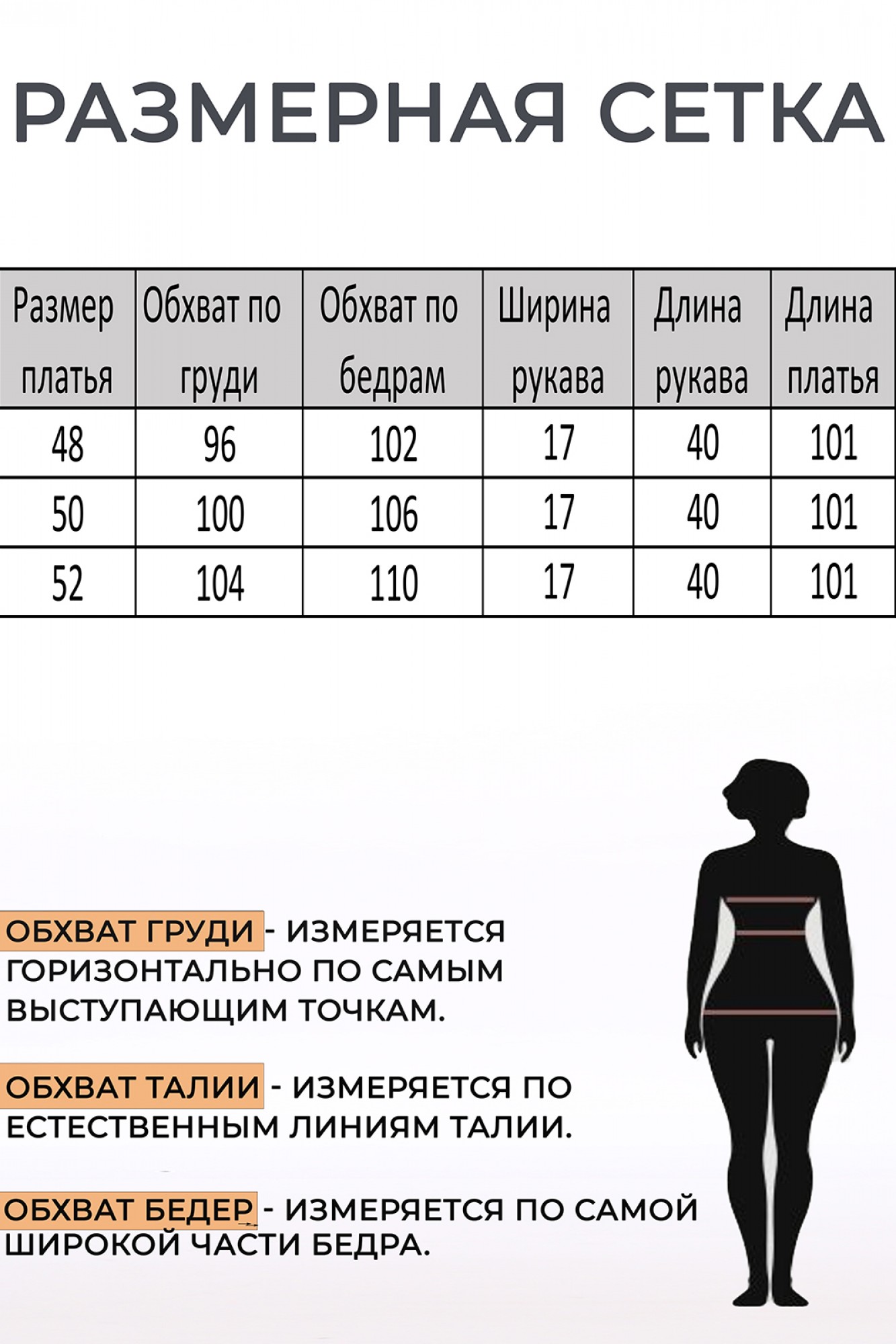 Размеры 48-52: длина платья 101 см, длина рукава 17 см.