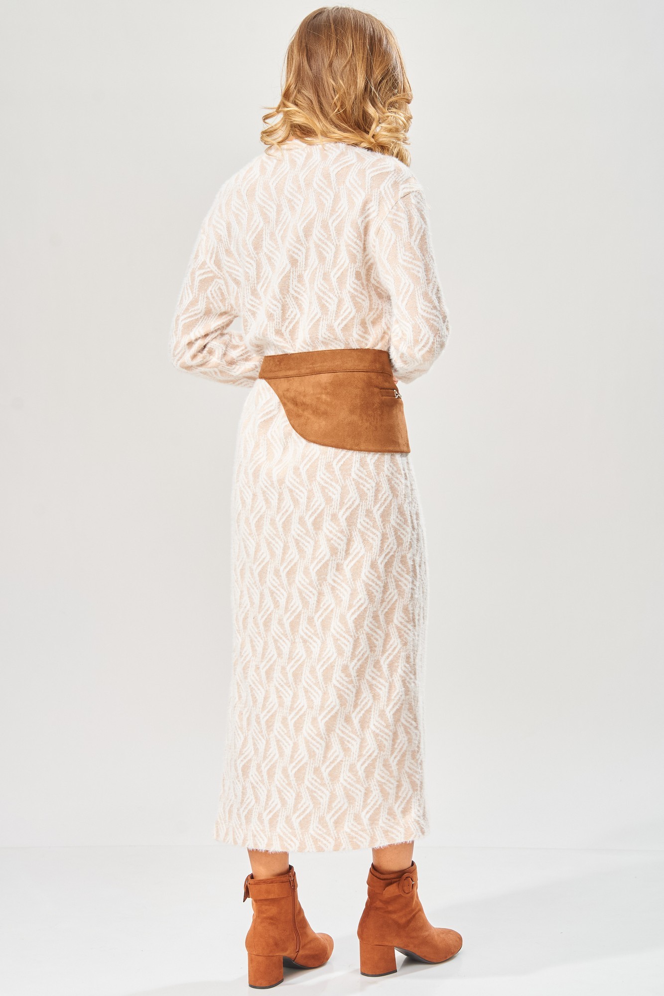 Трикотажное платье от LAIKONY прямого силуэта длиной макси со съемным поясом-карманом. Вырез горловины округлой формы с втачной бейкой. Перед и спинка цельные. Рукава втачные одношовные длинные, линия плеча спущена. В левом боковом шве обработан разрез. В комплекте съемный пояс с застежкой на пряжку. На съемном поясе обработан карман с листочкой с втачными концами. Трикотаж средней плотности, хорошо тянется. Декор может отличаться от представленного на фотографии. Уютное стильное повседневное платье длиной "в пол" с оригинальным поясом для осенне-зимнего сезона.