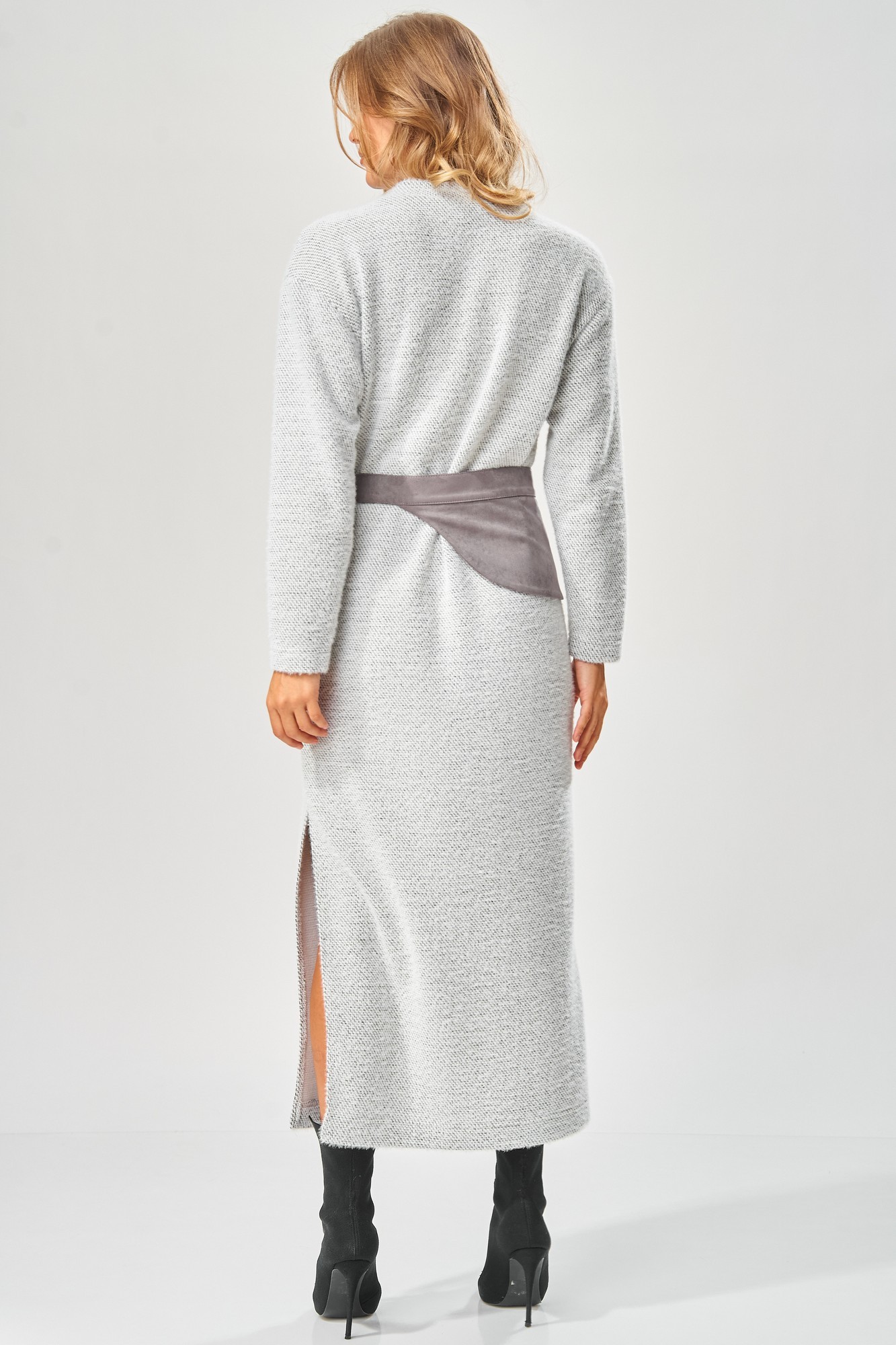 Трикотажное платье от LAIKONY прямого силуэта длиной макси. Вырез горловины округлой формы с втачной бейкой. Перед и спинка цельные. Рукава втачные одношовные длинные, линия плеча спущена. В левом боковом шве обработан разрез. В комплекте съемный пояс с застежкой на пряжку. На съемном поясе обработан карман с листочкой с втачными концами. Трикотаж средней плотности, хорошо тянется. Декор может отличаться от представленного на фотографии. Уютное стильное повседневное платье длиной ""в пол"" с оригинальным поясом для осенне-зимнего сезона.