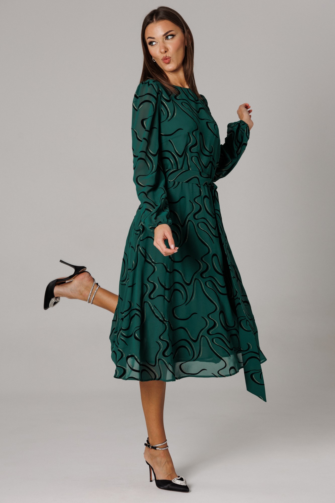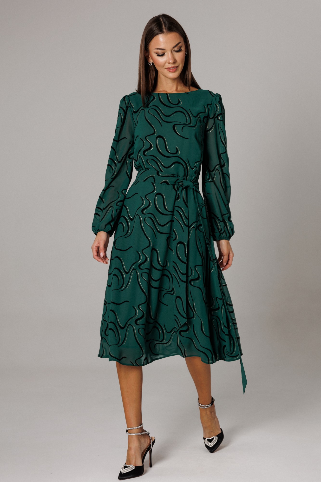 Элегантное платье, отрезное по линии талии из воздушного шифона на подкладке. В верхней части изделия расположены нагрудные горизонтальные вытачки, по спинке и полочке: вертикальные таллиевые. Линия горловины оформлена в форме «лодочка». Нижняя часть платья по крою: «полусолнце». В среднем шве спинке потайная застежка-молния. Рукав втачной, одношовный. По окату и низу рукава-сборка. Чтобы подчеркнуть изящество талии: платье дополнено съемным текстильным поясом, который может быть завязан на бант или классический узел. (фурнитура может отличаться от представленной на рекламном фотоматериале). Особые рекомендации: рекомендуется холодная деликатная ручная стирка, без использования отбеливающих СМС, без интенсивного трения. Сушка в вертикальном положении. ВТО с минимальным паром.