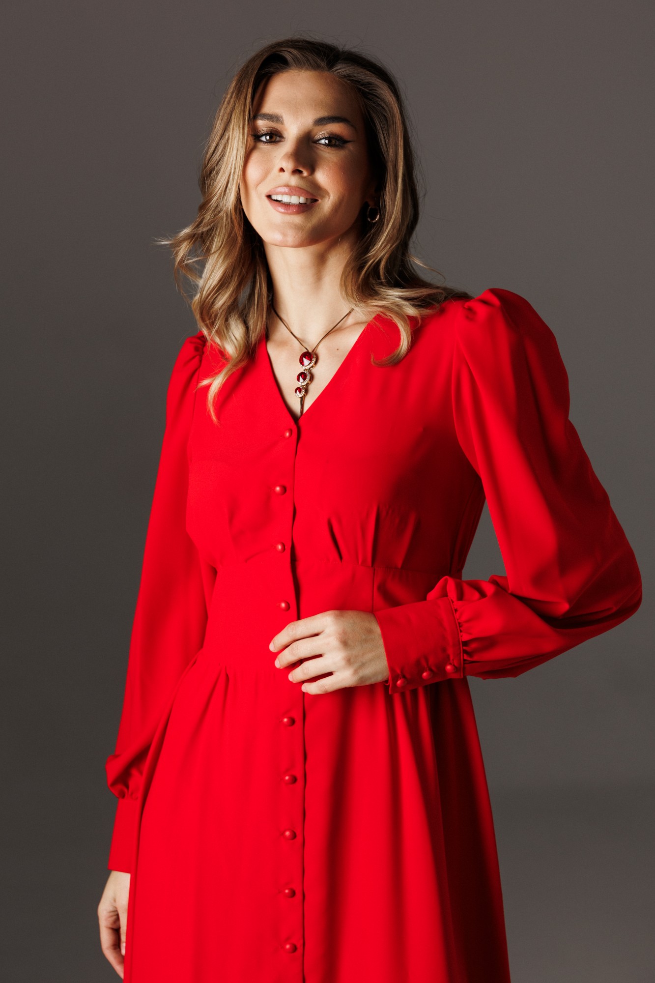 Воздушное элегантное платье. Изделие состоит из отрезного лифа, спереди со складками по линии груди, по спинке - сборка. Юбка изделия имеет расклешение к низу, по талии фрагментами сборка. Лиф и юбку соединяют облегающие рельефные детали, имитирующие фигурный корсет, высотой от 7,5-12 см. Спереди платье на застежке: петли-пуговицы. Горловина имеет V-образный вырез. Рукав втачной, одношовный, с притачной манжетой. Платье на трикотажной подкладке (лиф платья и юбка).