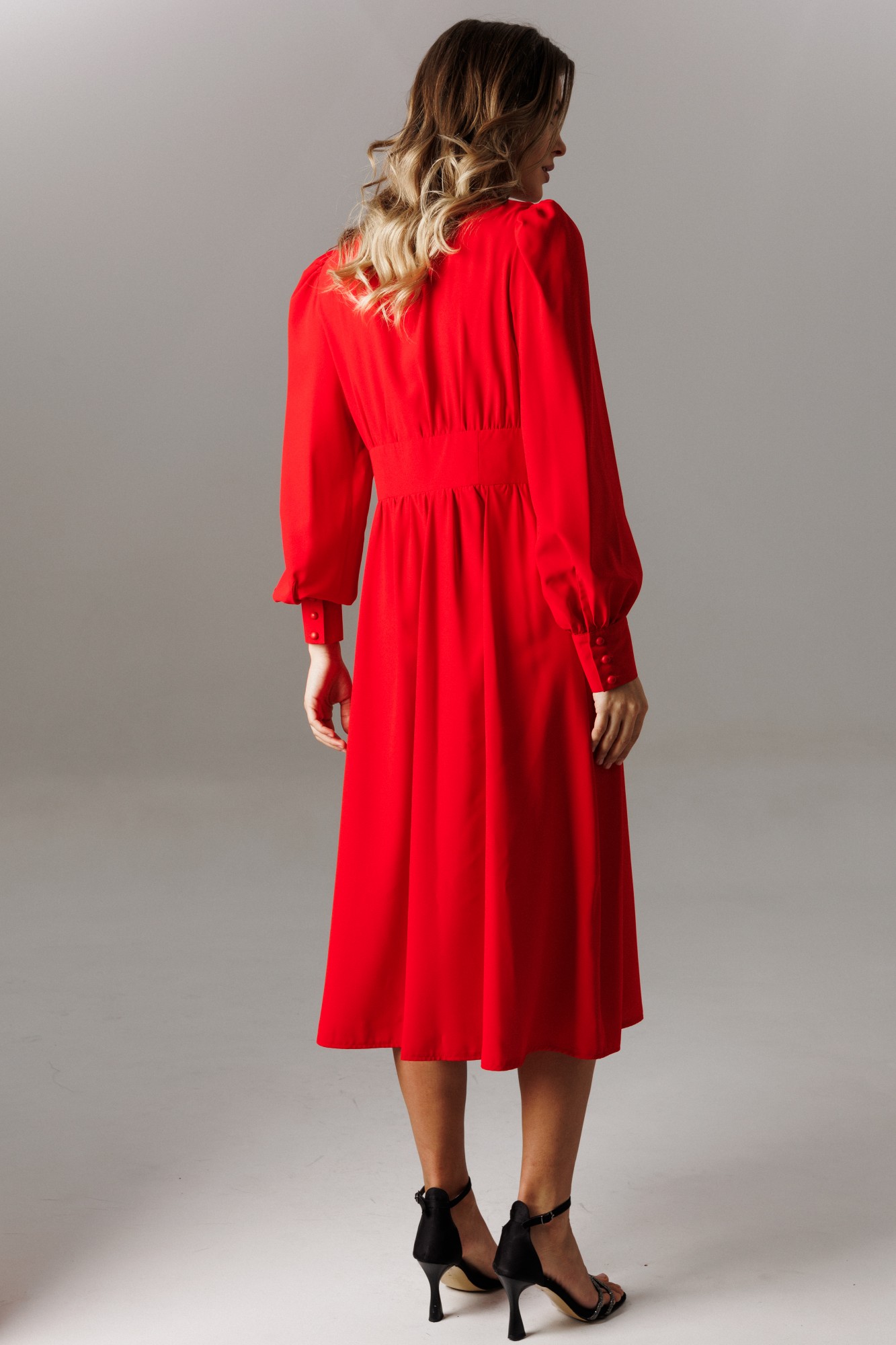 Длина рукава в готовом виде 65,5 см. По окату и низу рукава: сборка. Спереди платье имеет застежку на петли-пуговицы. Длина платья по спинке 112-115 см (согласно размерному ряду).