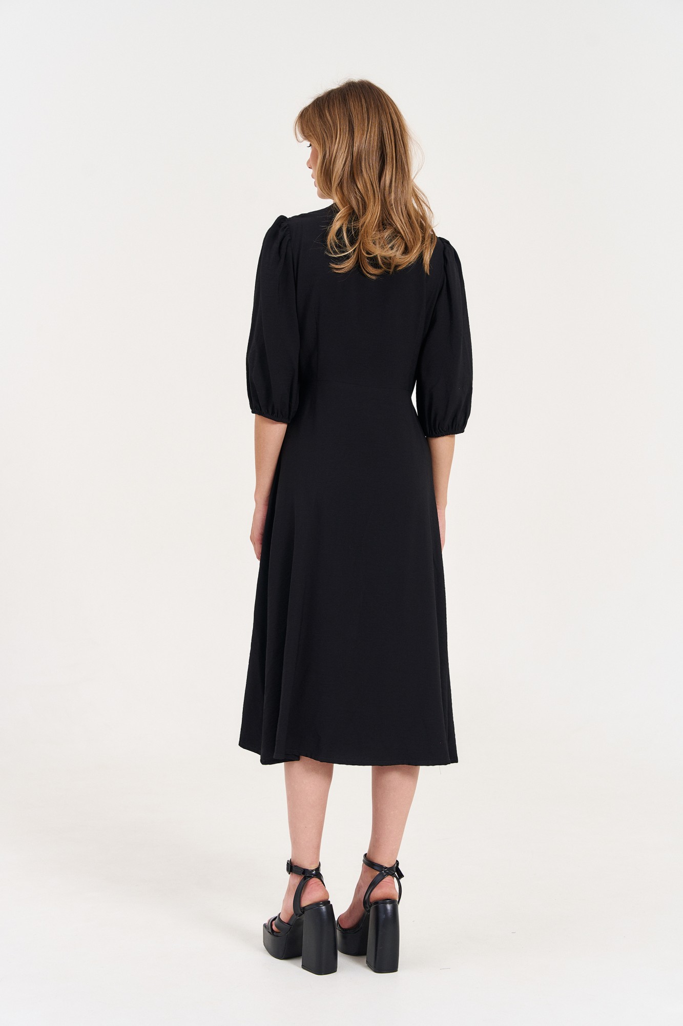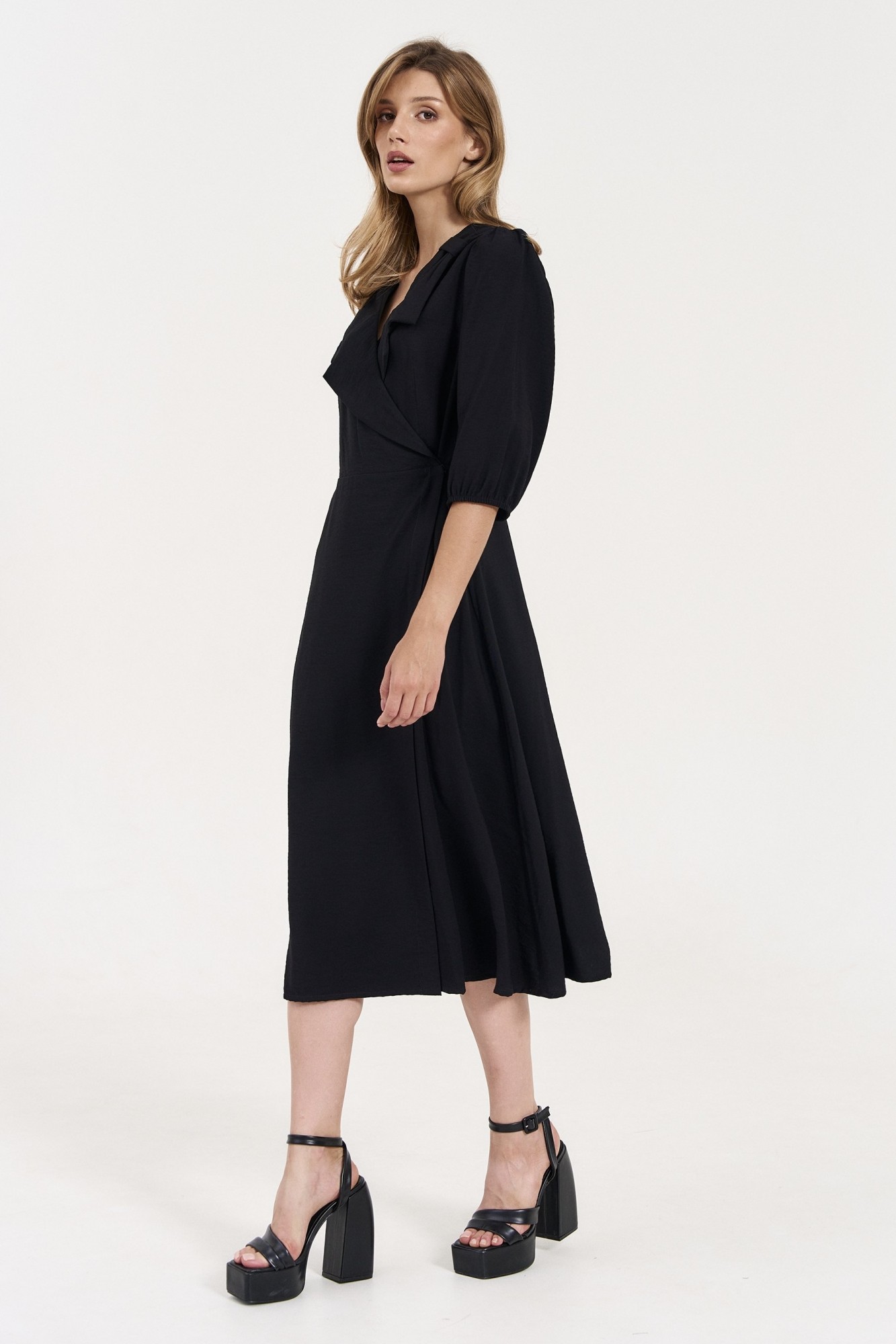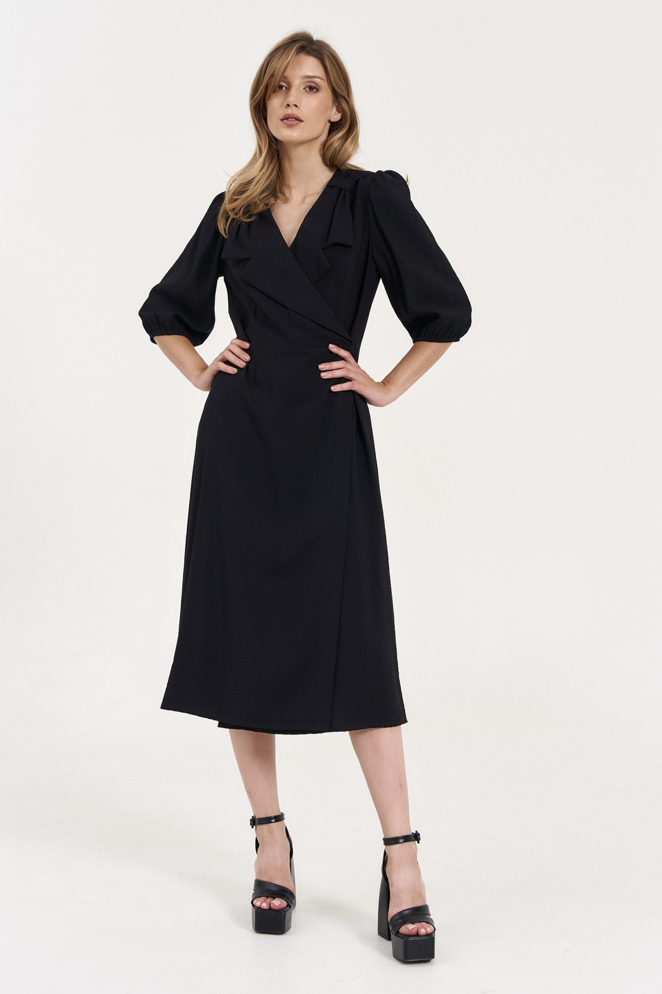 Платье лёгкое, струящееся на запахе. Отрезное по линии талии, расширенное к низу. Воротник выходящий из линии плеча, пиджачного типа, на участке воротника - декоративная перемычка создающая мягкую складку. Рукава одношовные с узкой резинкой по низу и сборкой по окату. Длина рукава до линии локтя. Застежка внешней части переда на потайную кнопку, внутренней части переда на завязку. В боковых швах карманы. Особенностью платья платья является обработка всех внутренних швов платья окантовкой, что придает изделию элитный вид.