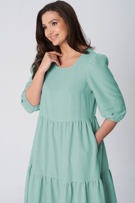Платье женское, отрезное по линии талии, со сборкой, без подкладки. Вырез горловины круглой формы. Рукав одношовный, укороченный, втачной со сборкой по окату. По низу рукава резинка. Нижняя часть платья расширенная с притачным воланом со сборкой, в боковых швах расположены функциональные карманы. По волану и рукаву выполнены две застрочные горизонтальные складки.