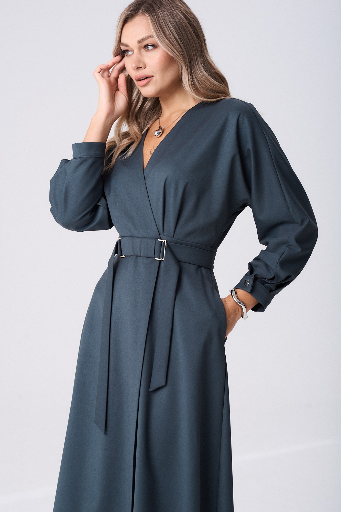 Платье женское полуприлегающего силуэта длинной миди. Платье отрезное по линии талии, на запах, с односторонними складками от пояса. Юбка платья по полочки ассиметричная, слегка расклешённая к низу. По талии приточной пояс, застегивающийся на пришивные кнопки, который дополнен отлетным поясом фиксирующийся рамками. В боковых швах обработаны карманы. Рукава цельнокроеные, по низу притачная манжета, застёгивающаяся на петлю и пуговицу.
