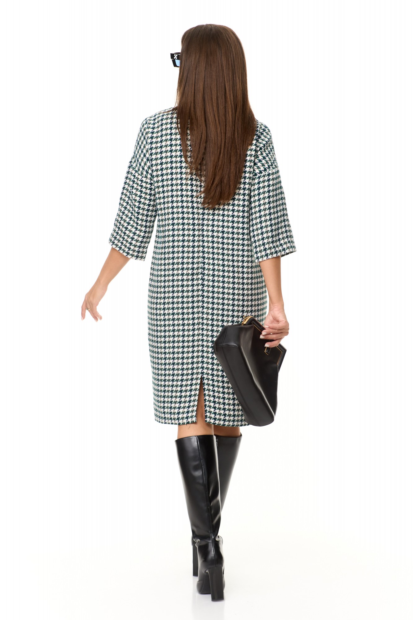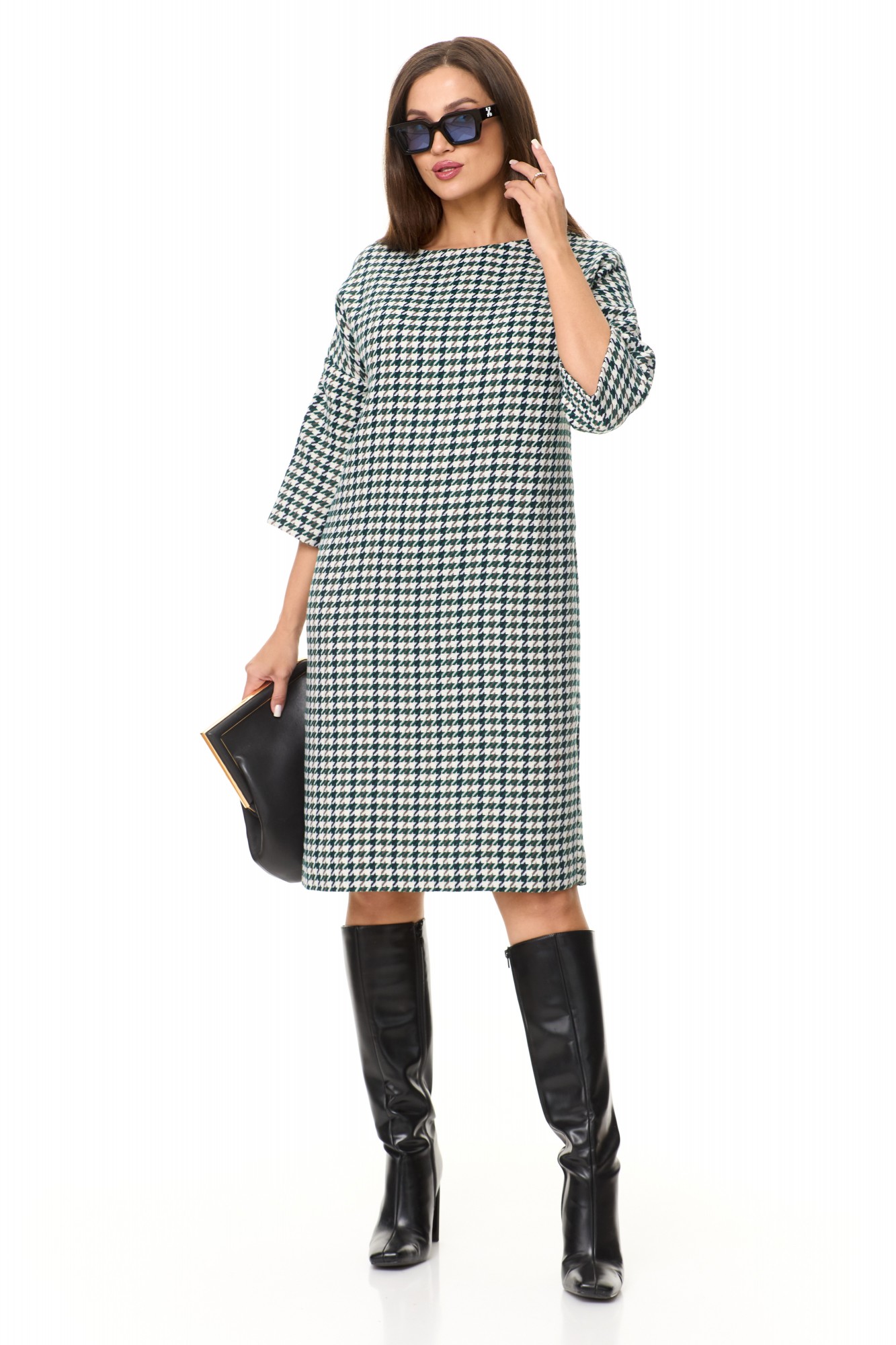 Платье женское из теплой, текстильной ткани гусиная лапка. Платье прямого силуэта длиной за колено. Перед цельный. Спинка со средним швом, застешка на потайную молнию, в низу разрез, горловина овальной формы. Рукав со спущенным плечом. Данная модель прекрасная покупка для осеннего сезона или холодной зимы.