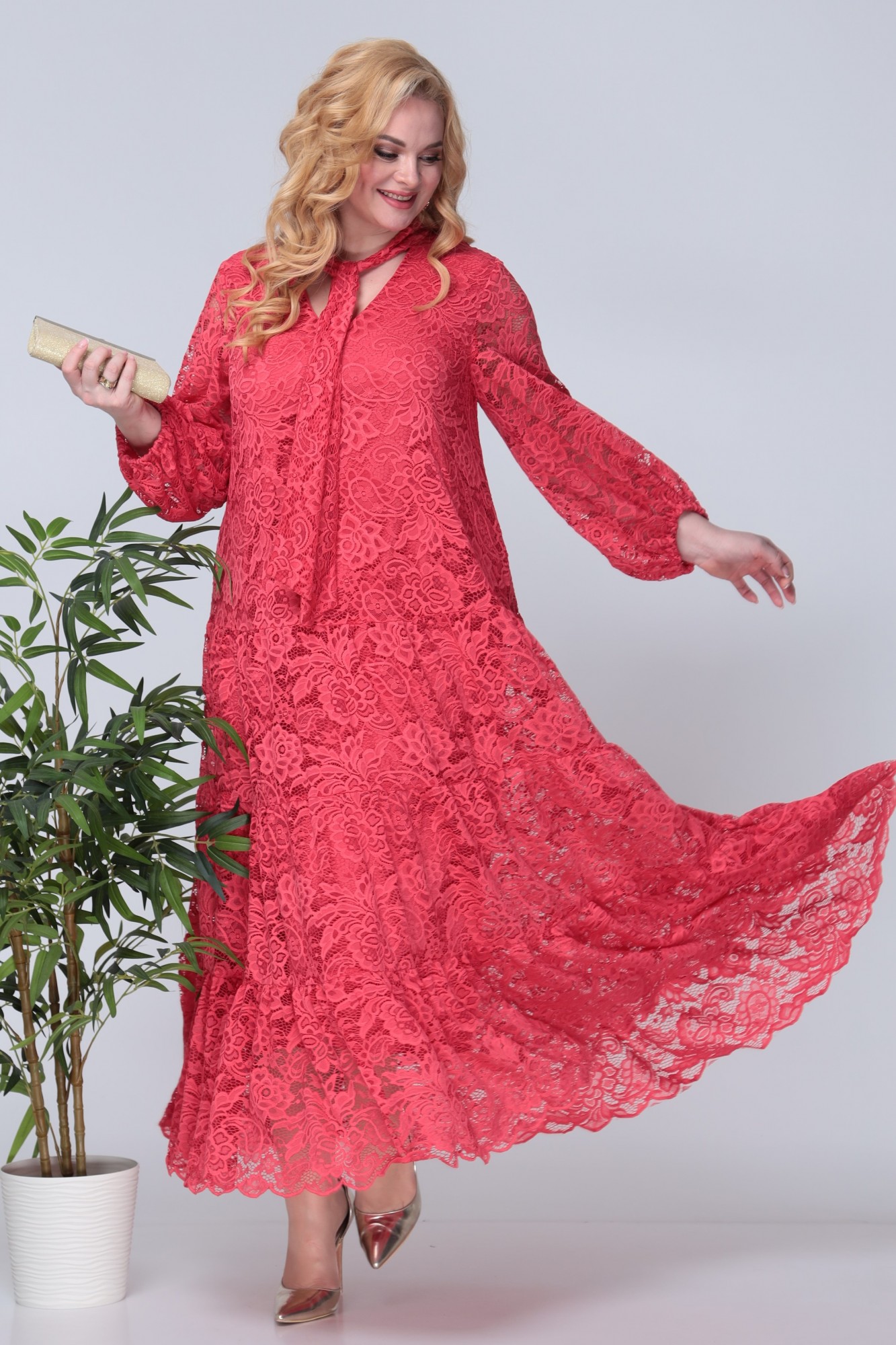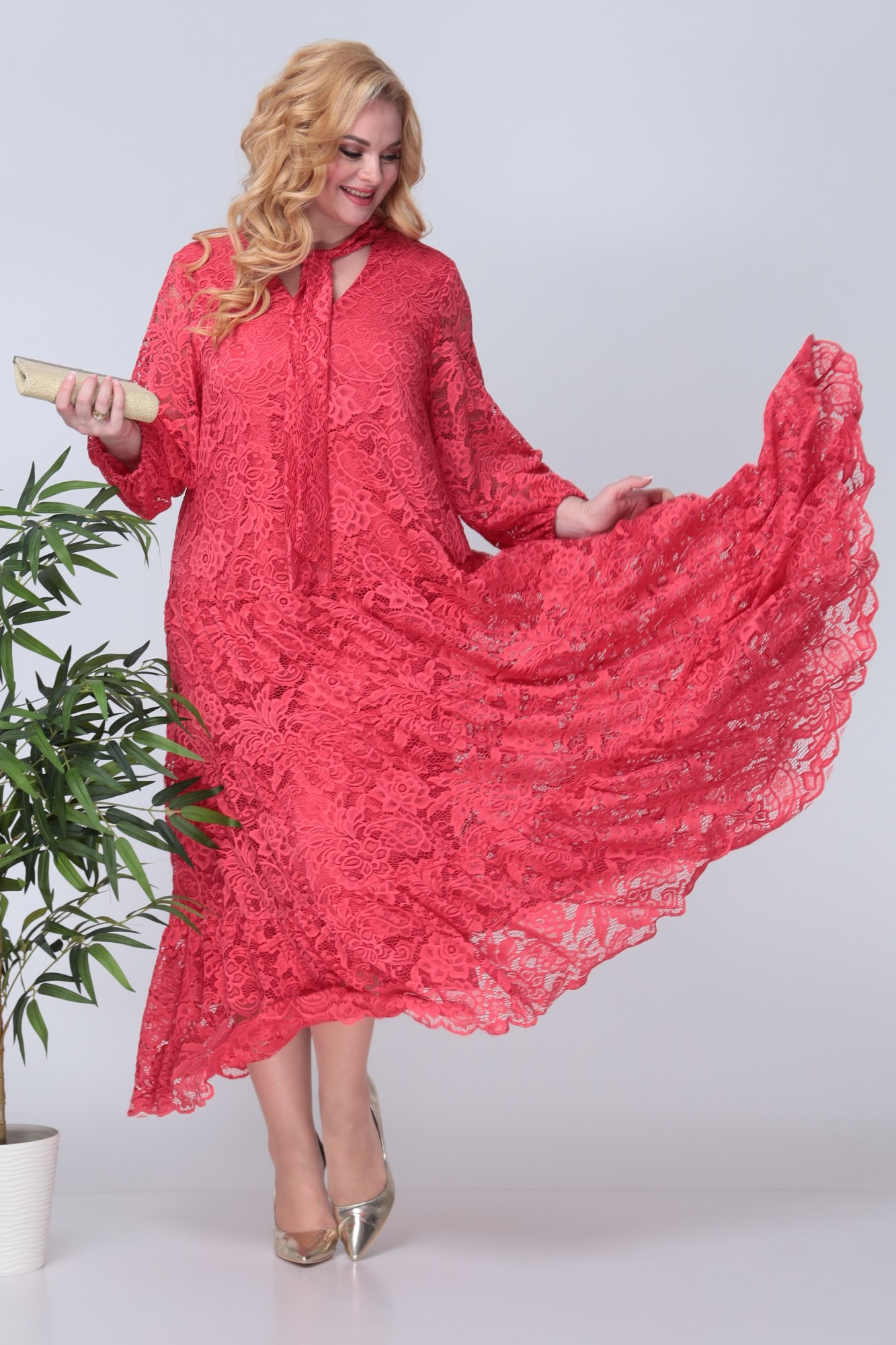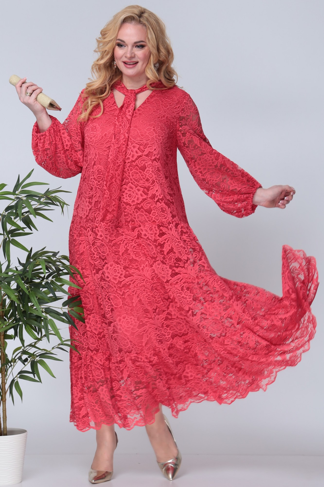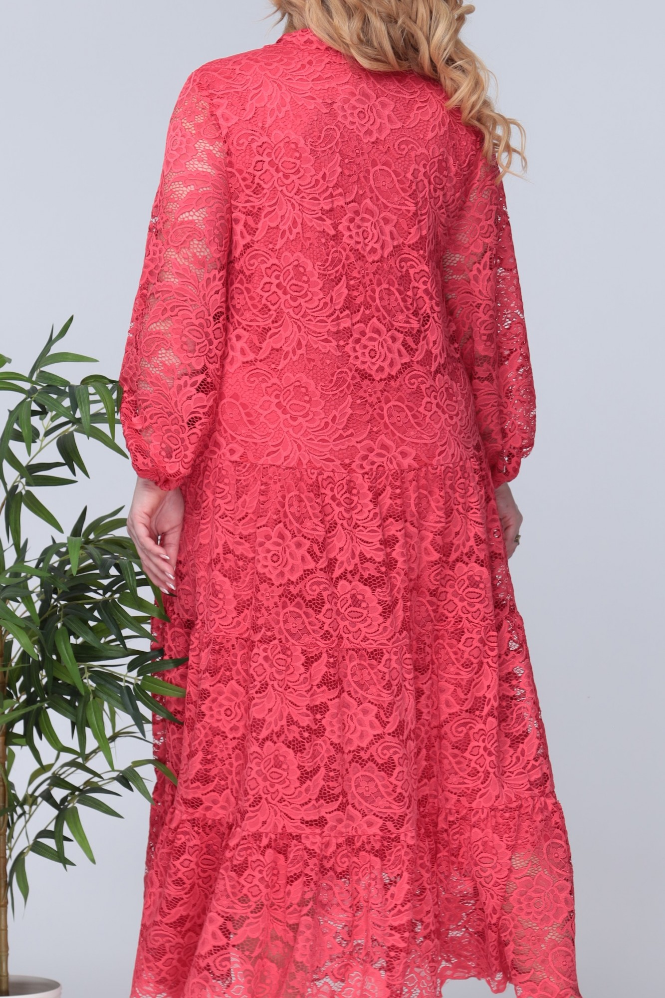 Вечернее платье макси из кружевного полотна, на подкладке, трапециевидного силуэта — дополнение любого образа. Отличный вариант на любое торжество. По горловине V-образный вырез и стойка переходящая в бант. Рукав расширенный к низу, на резинке, фигурный. По полочке и спинке идут 3 присобранных волана.