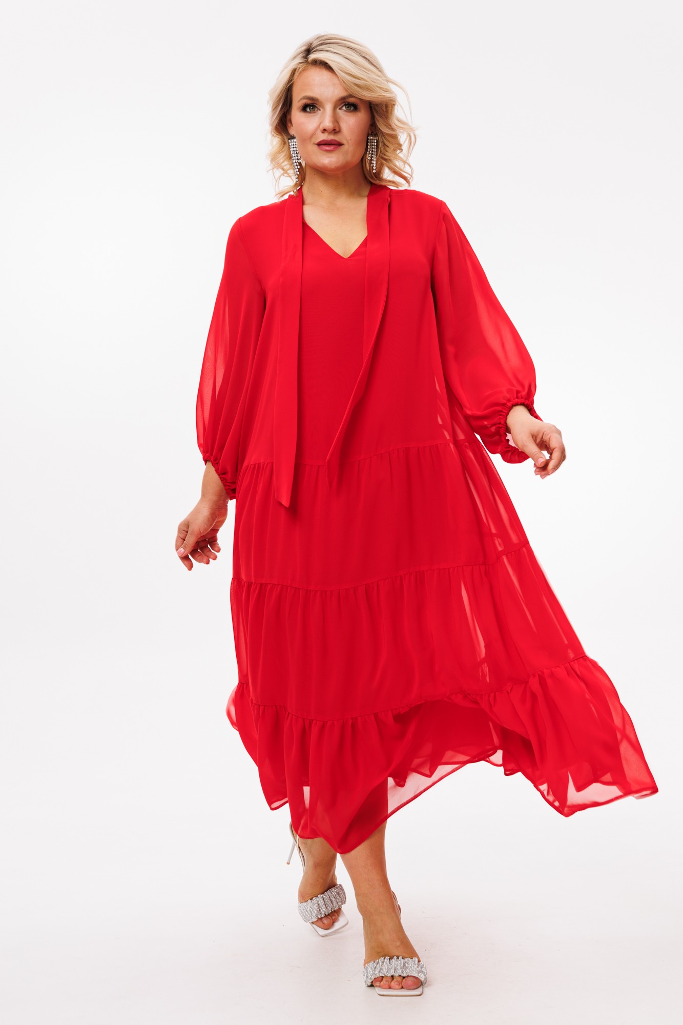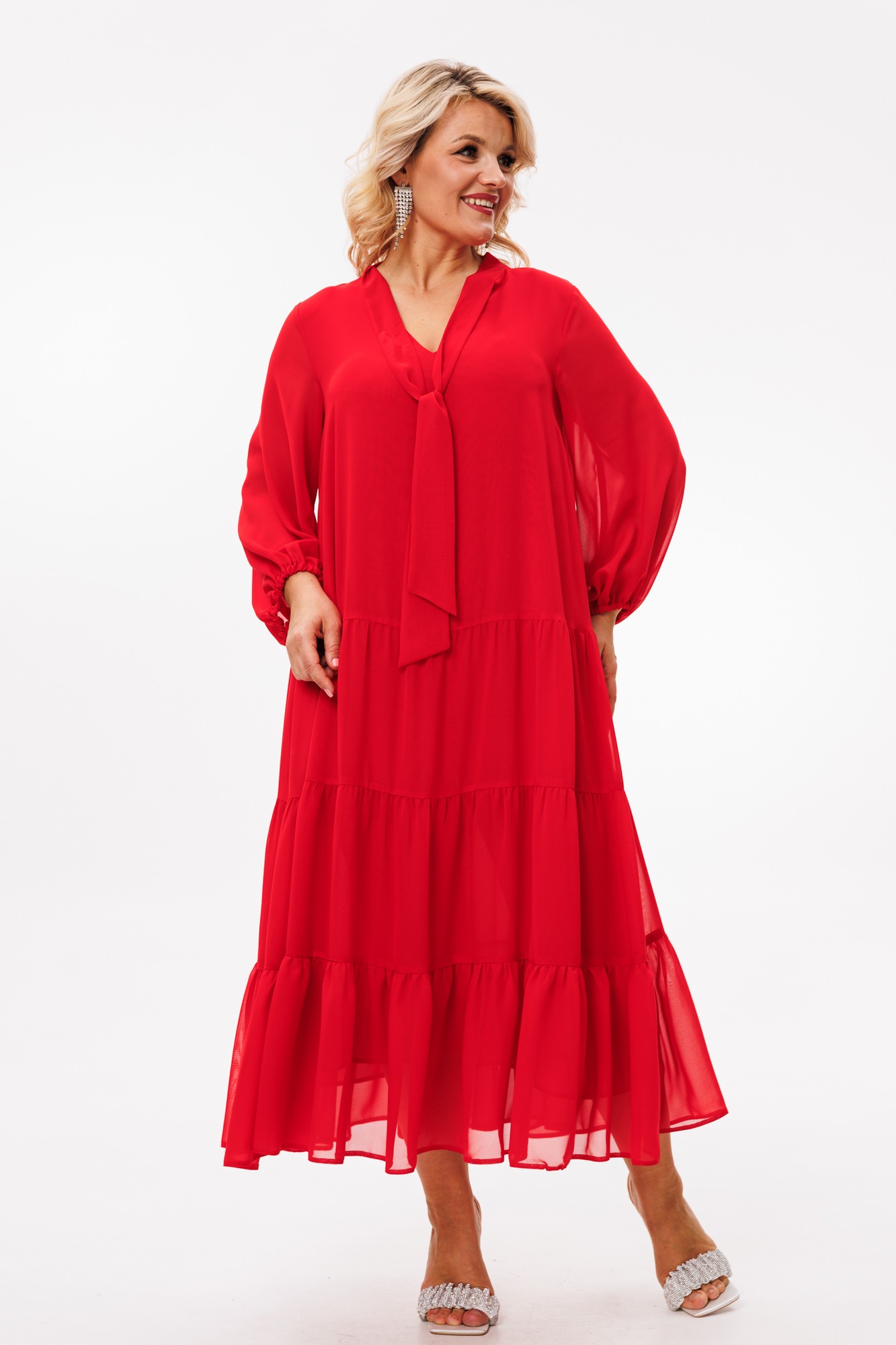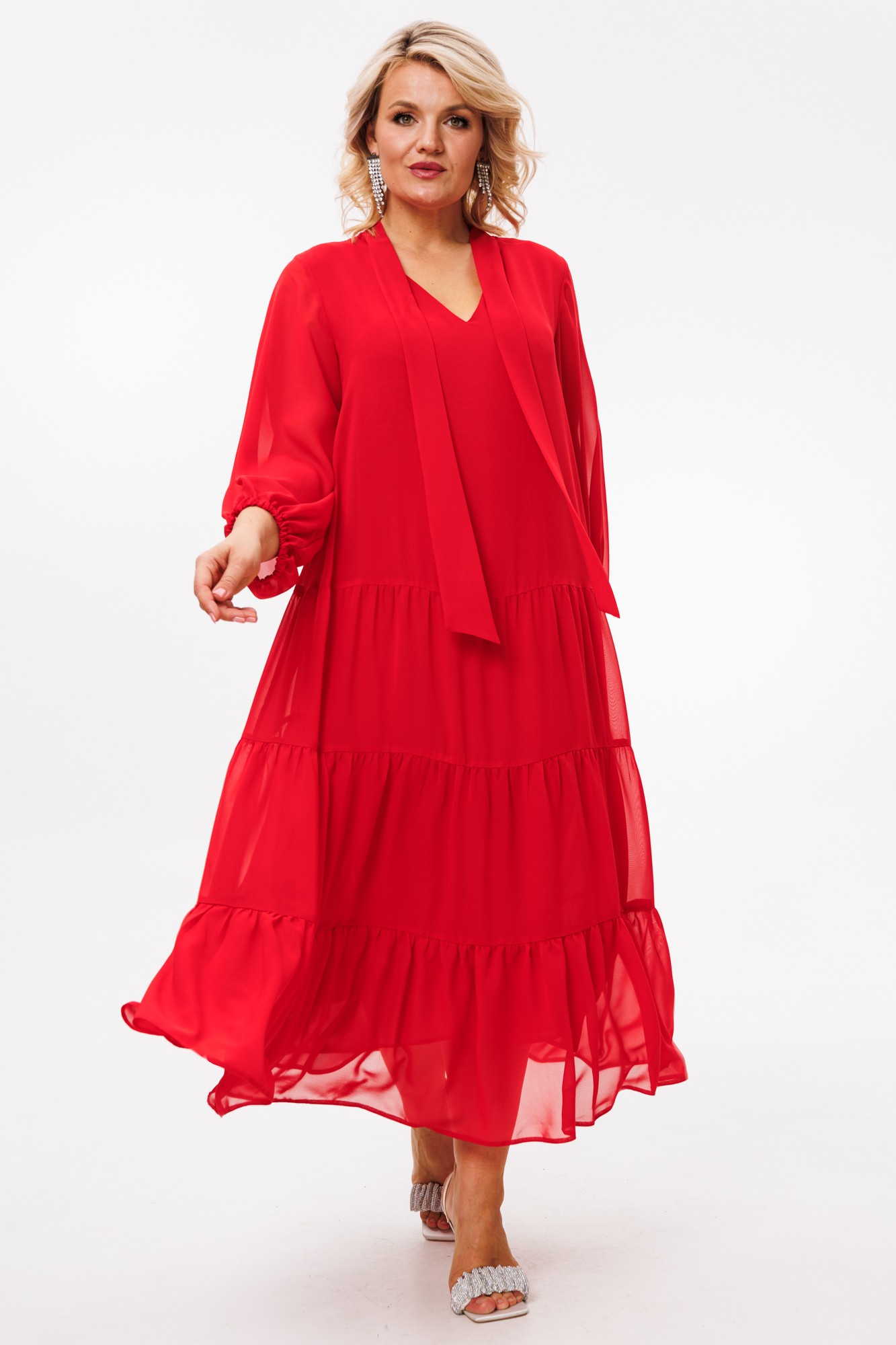 Платье макси из шифонового полотна на подкладке, трапециевидного силуэта — идеально для любого торжественного выхода и не только. Благодаря своей легкости и воздушности подойдет для разных образов. А благодаря своему крою идеально подойдет на любую фигуру. По горловине V-образный вырез и стойка переходящая в бант. Рукав расширенный к низу, на резинке, фигурный. По полочке и спинке идут 3 присобранных волана.