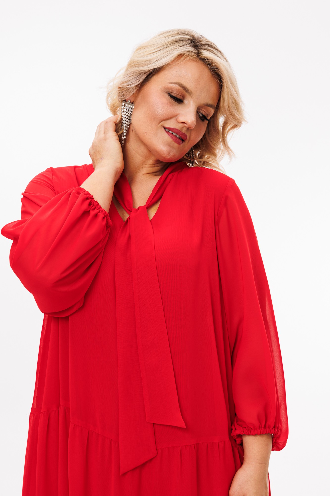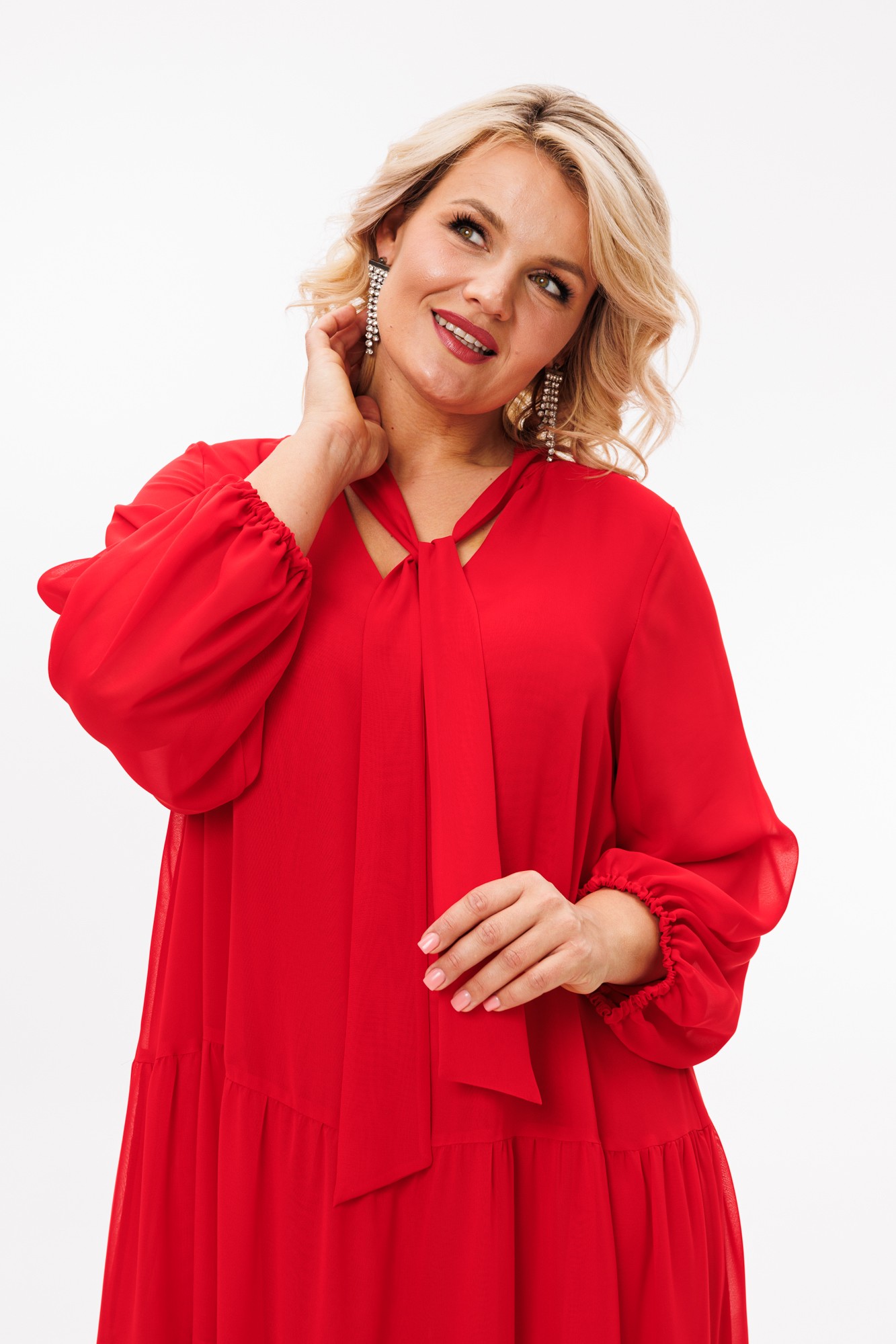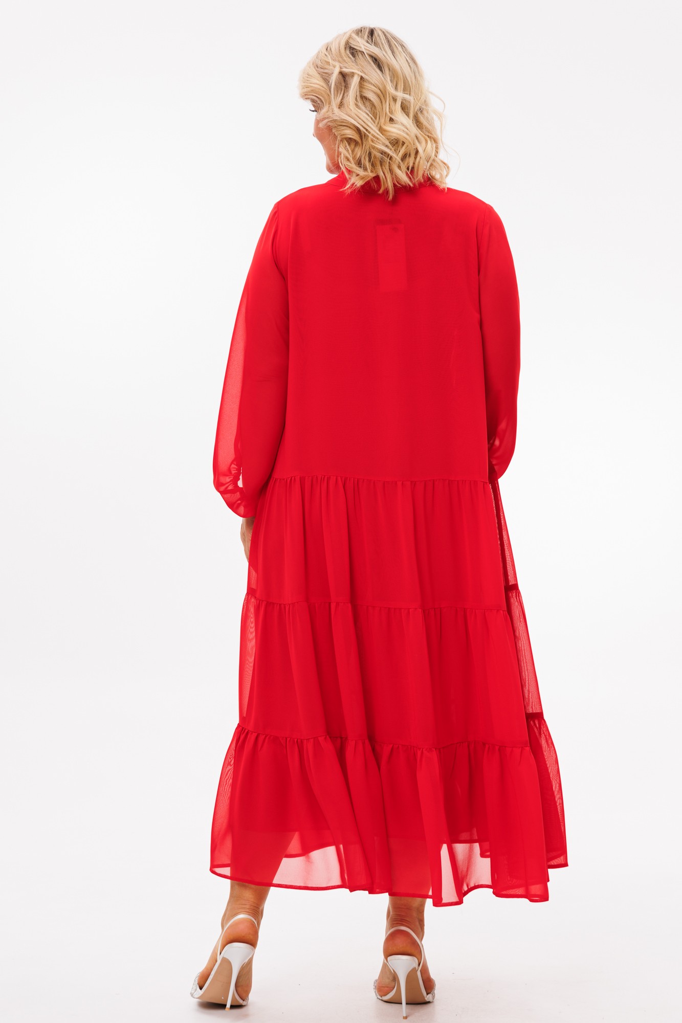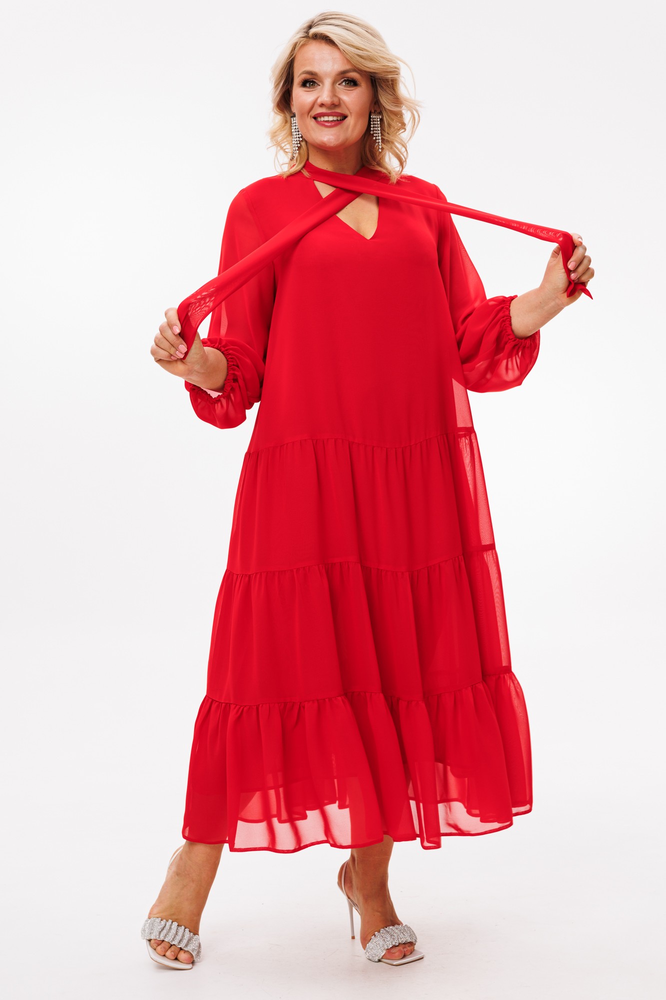 Платье макси из шифонового полотна на подкладке, трапециевидного силуэта — идеально для любого торжественного выхода и не только. Благодаря своей легкости и воздушности подойдет для разных образов. А благодаря своему крою идеально подойдет на любую фигуру. По горловине V-образный вырез и стойка переходящая в бант. Рукав расширенный к низу, на резинке, фигурный. По полочке и спинке идут 3 присобранных волана.