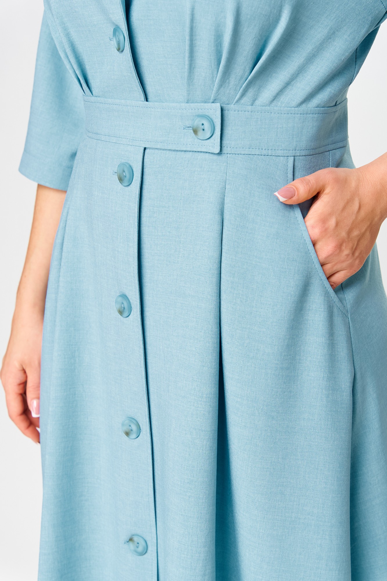 Платье А-образного силуэта, длиной ниже колена. Платье выполнено из однотонной ткани с эффектом льна. Верхняя часть платья – лиф отрезной по линии талии. Полочка лифа с горловиной V- образной формы, отложными лацканами и стояче-отложным воротником. По полочке лифа в области талии выполнены односторонние складки. Спинка лифа цельная. Рукав втачной, с углубленной формой проймы, одношовный, длиной немного ниже локтя. Юбка формы колокол, по передним половинкам юбки выполнены карманы и бантовые складки в области талии. Между лифом и юбкой втачан пояс, по задней части которого проложена эластичная тесьма, по передней части с правой стороны обработан уступ. Застежка центральная на петли и пуговицы.
