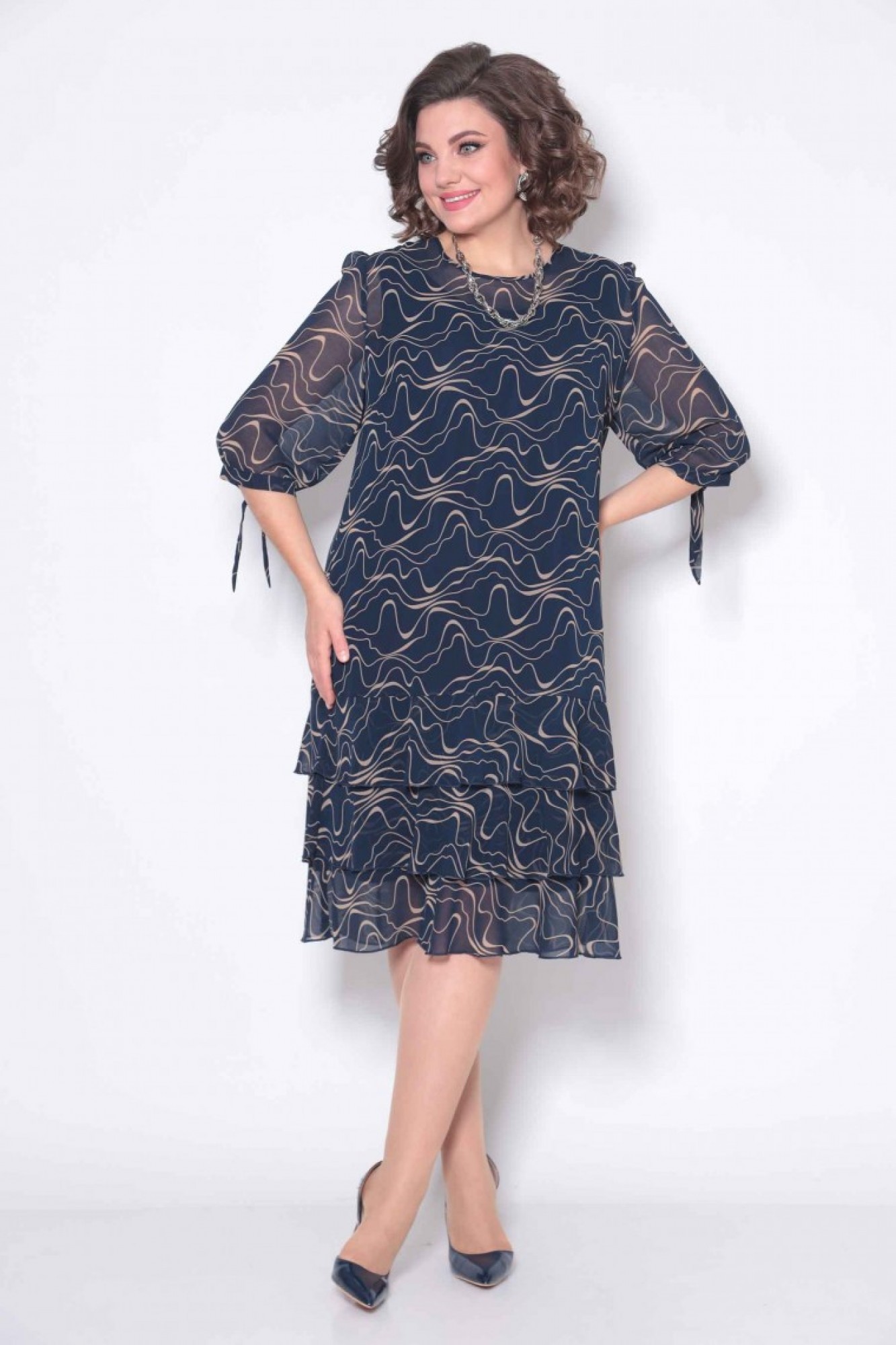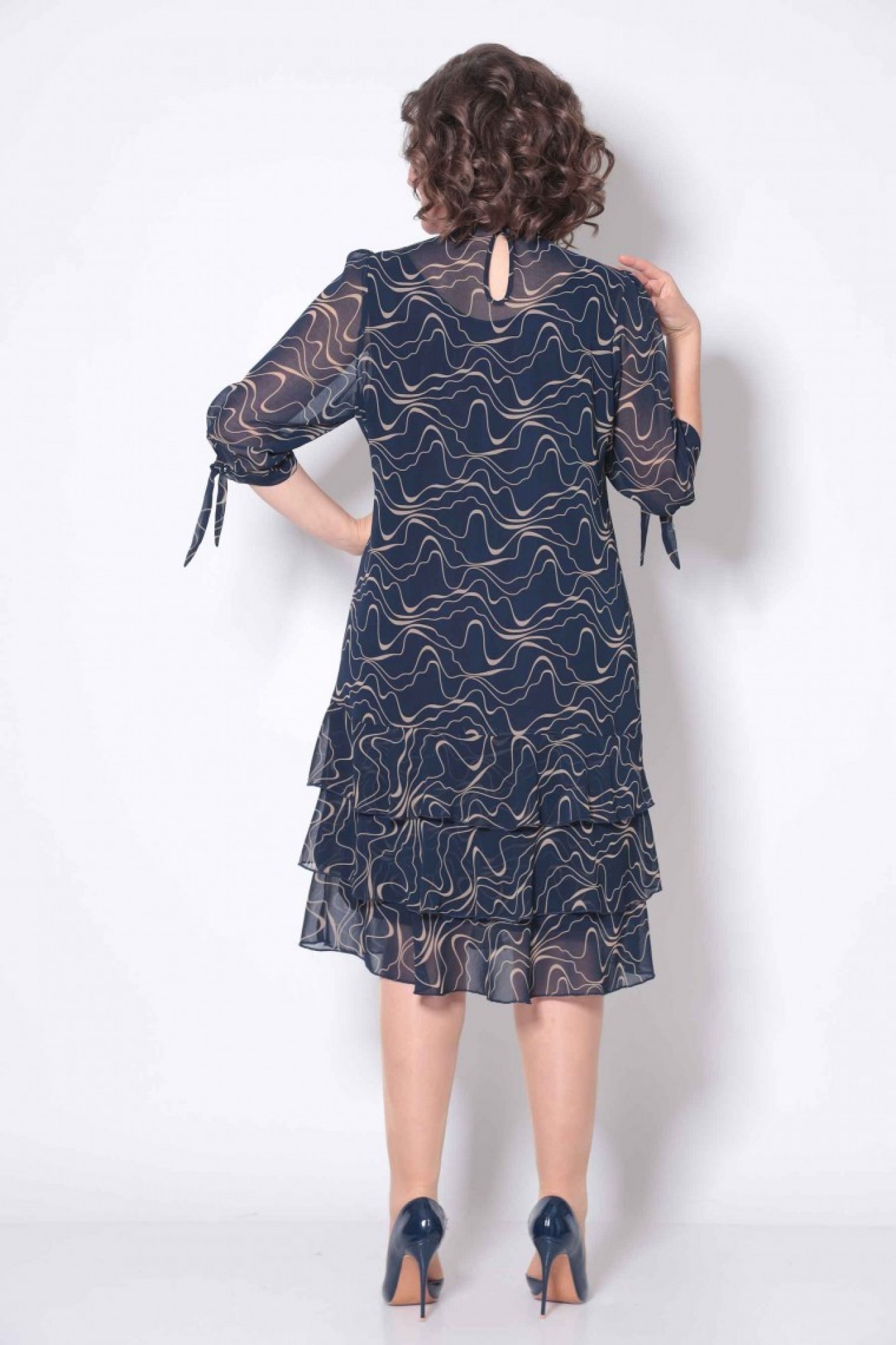 Платье женское, свободного силуэта, из шифона. Горловина круглая, обработана руликом. На спинке застёжка-капелька на петлю-пуговицу. Рукав три четверти на манжете с завязкой. Рукав расширен к низу. Перед с нагрудными вытачками из бокового шва. Спинка без вытачек. По низу платья три ряда расклёшенных воланов. Платье на подкладке.