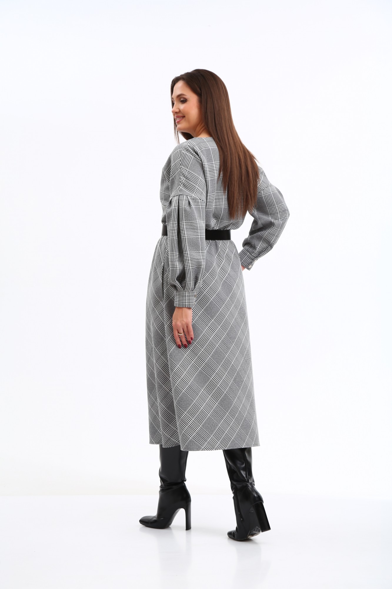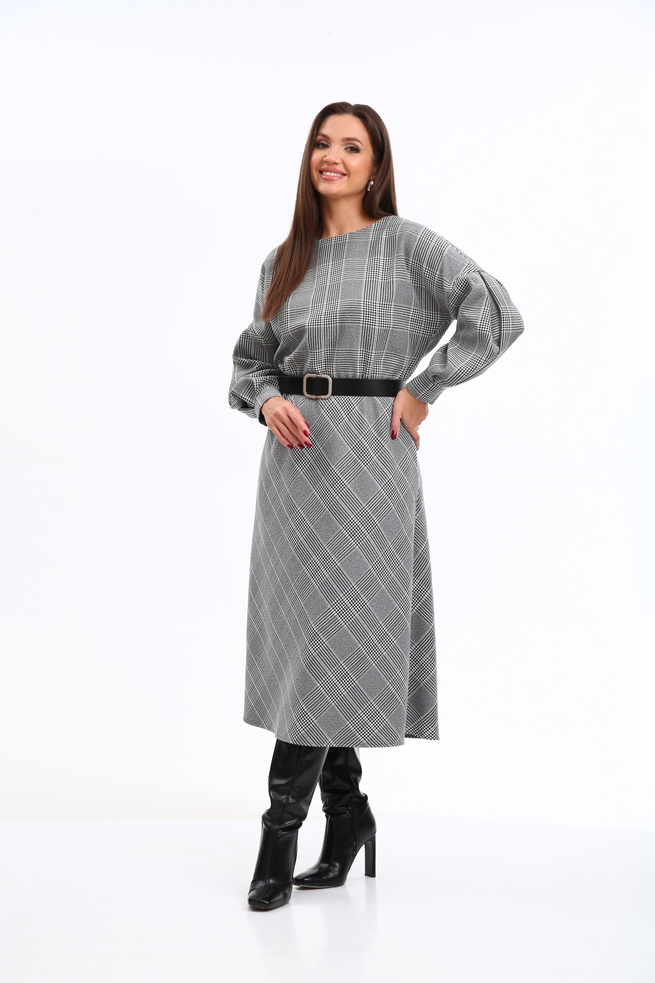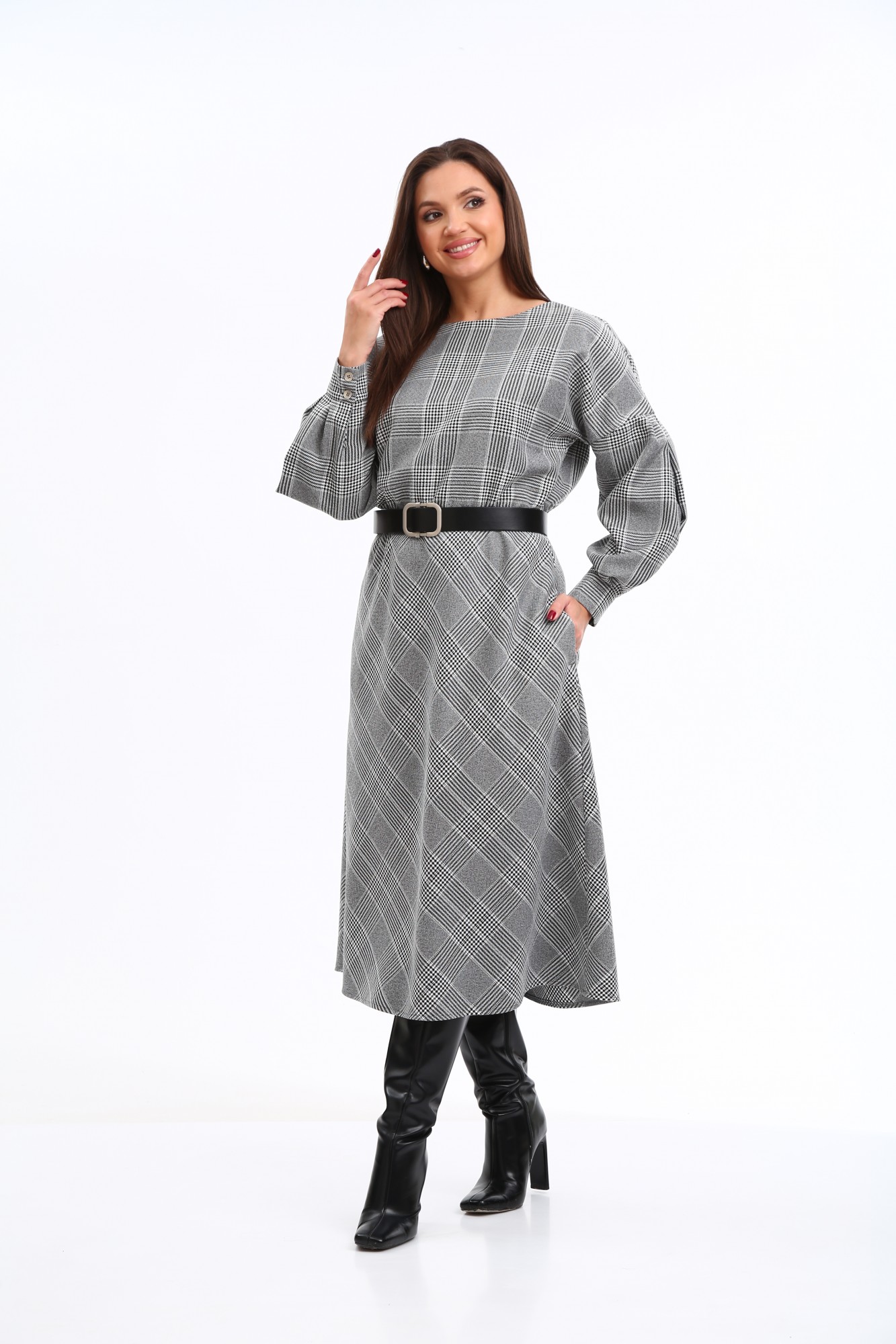 Стильное платье в клетку в трендовой расцветке, безусловно, станет фаворитом в Вашем гардеробе. Изделие выполнено из высококачественной ткани, приятной к телу. Платье А-образного силуэта, отрезное по линии талии. Рукава спущенные с активными защипами, полной длины, с притачными манжетами с застежкой на петли-пуговицы. Горловина мягкой округлой формы. Нижняя часть платья покроя трапеция. В боковых швах предусмотрены функциональные карманы. В области талии платье присобрано на эластичную тесьму. Платье дополнено стильным съёмным ремнем. Данное изделие легко можно использовать в повседневной жизни – оно также идеально впишется в деловой образ современной женщины.