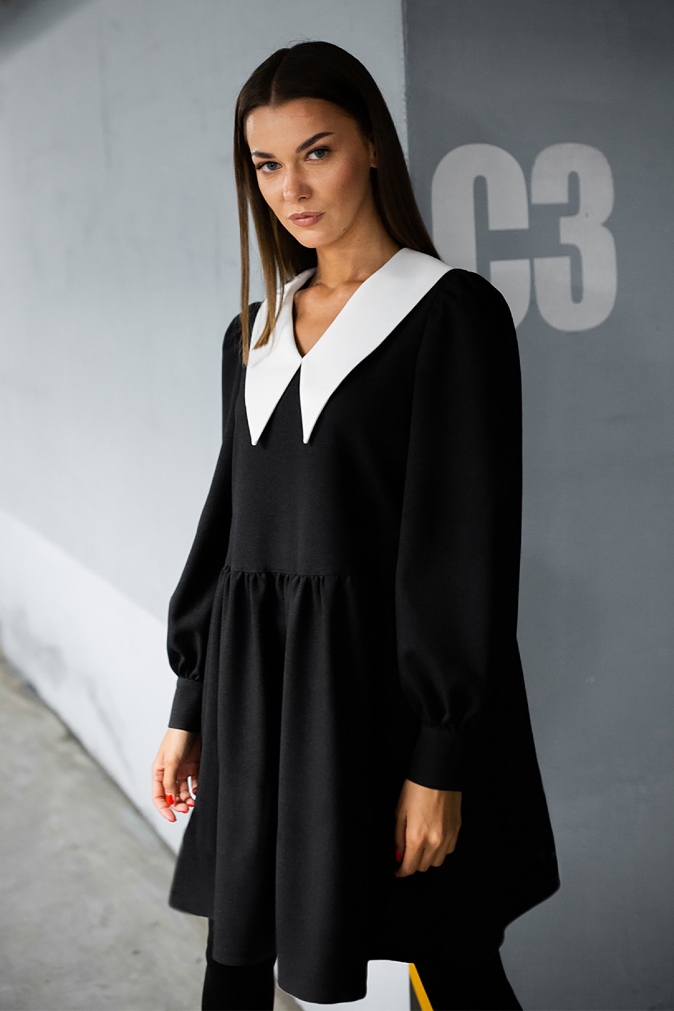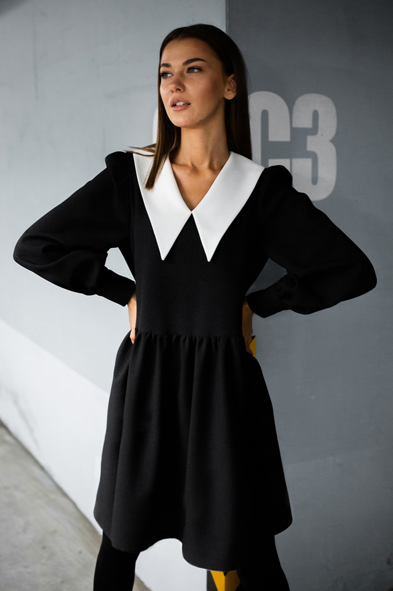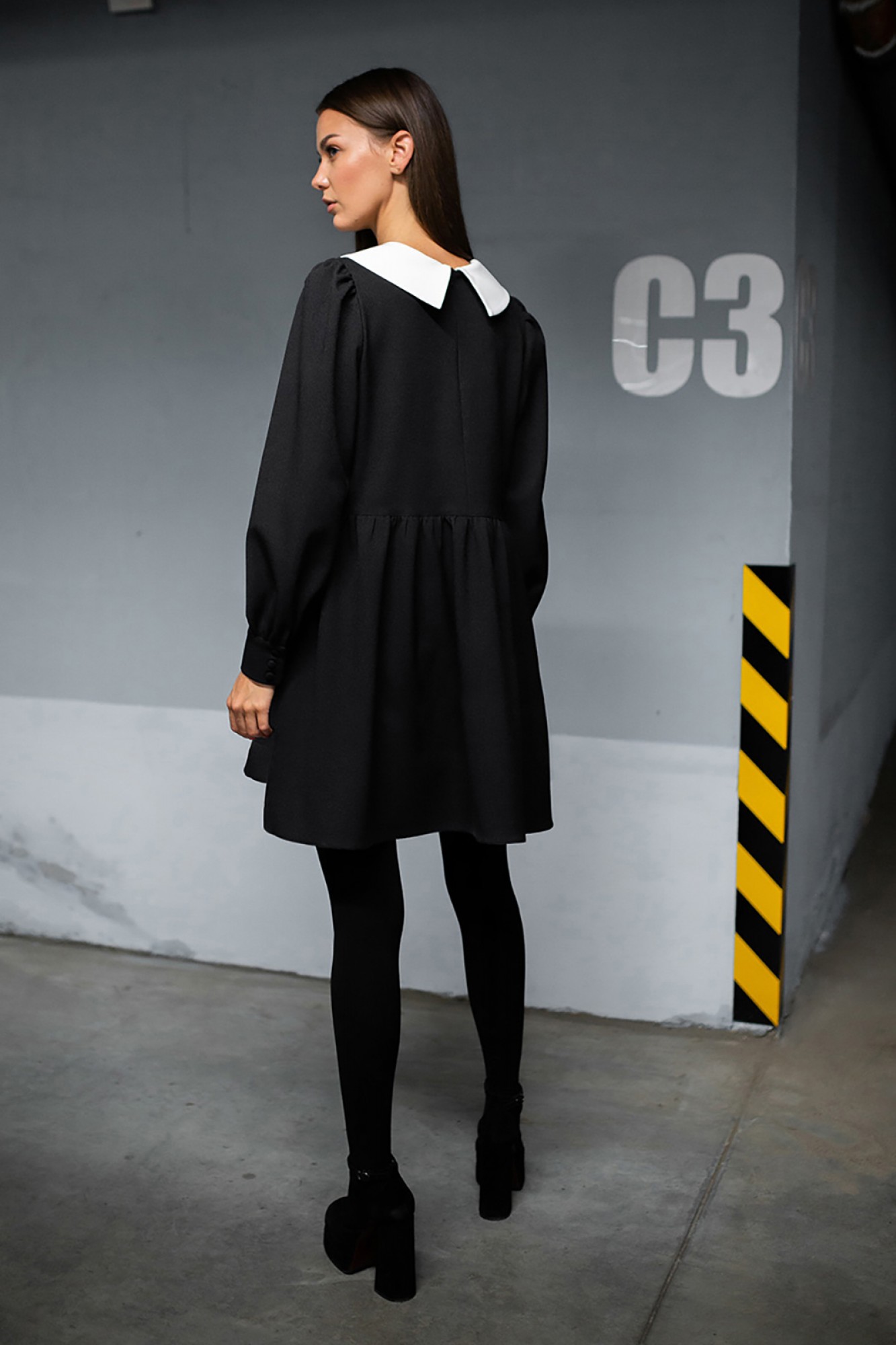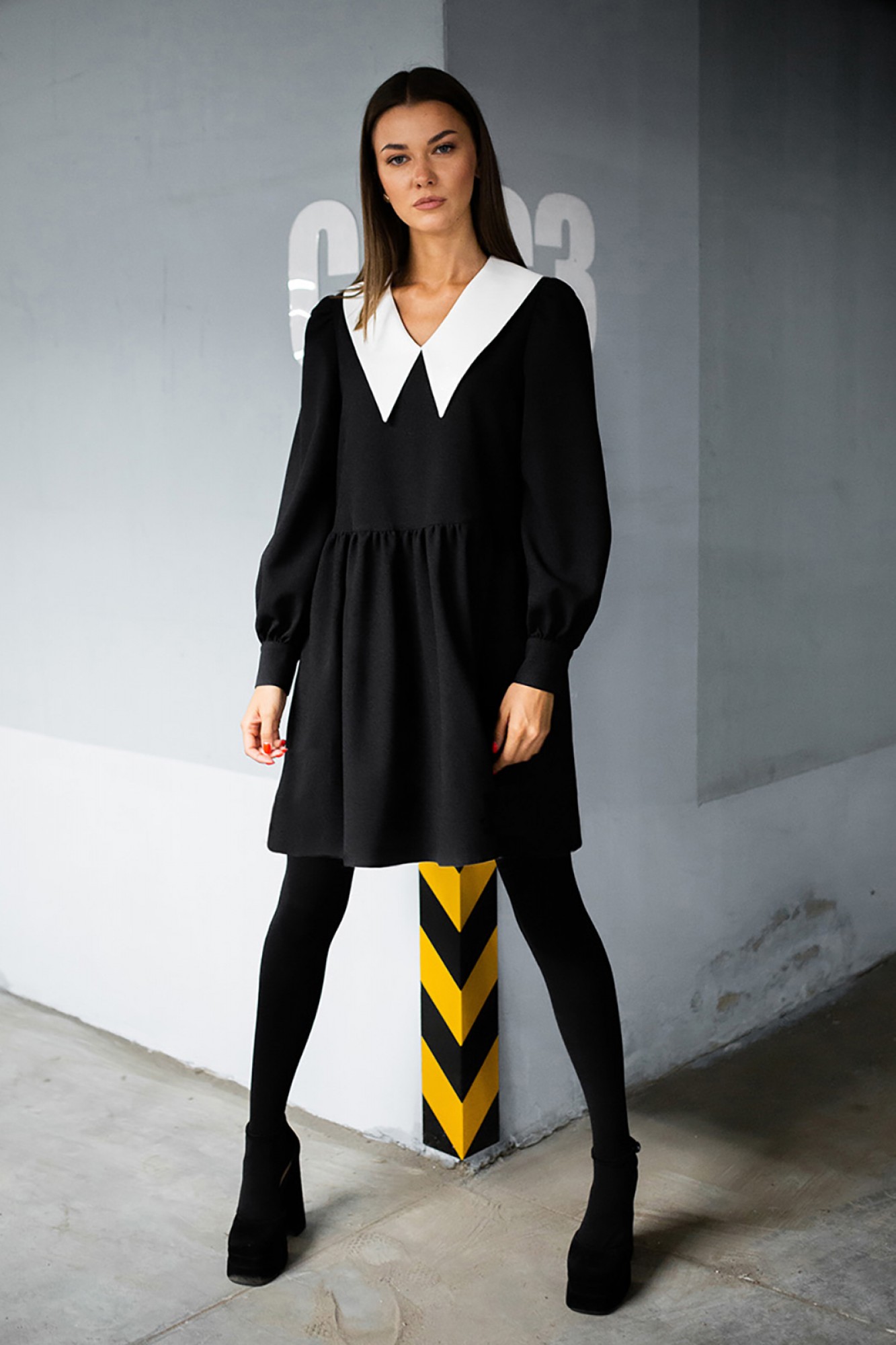 Платье отрезное чуть выше линии талии, расширенного силуэта. Рукав втачной со сборкой по окату и по шву притачивания манжеты. Лиф спинки со средним швом, в котором обработана застёжка на потайную молнию. Воротник съемный выполнен из отделочной ткани.