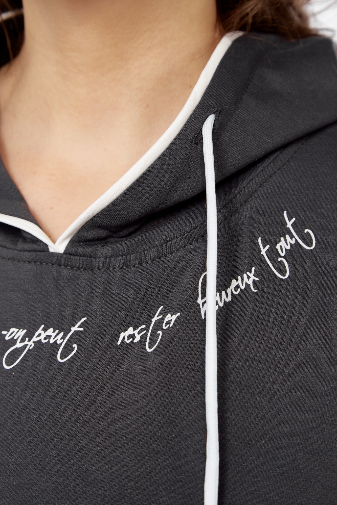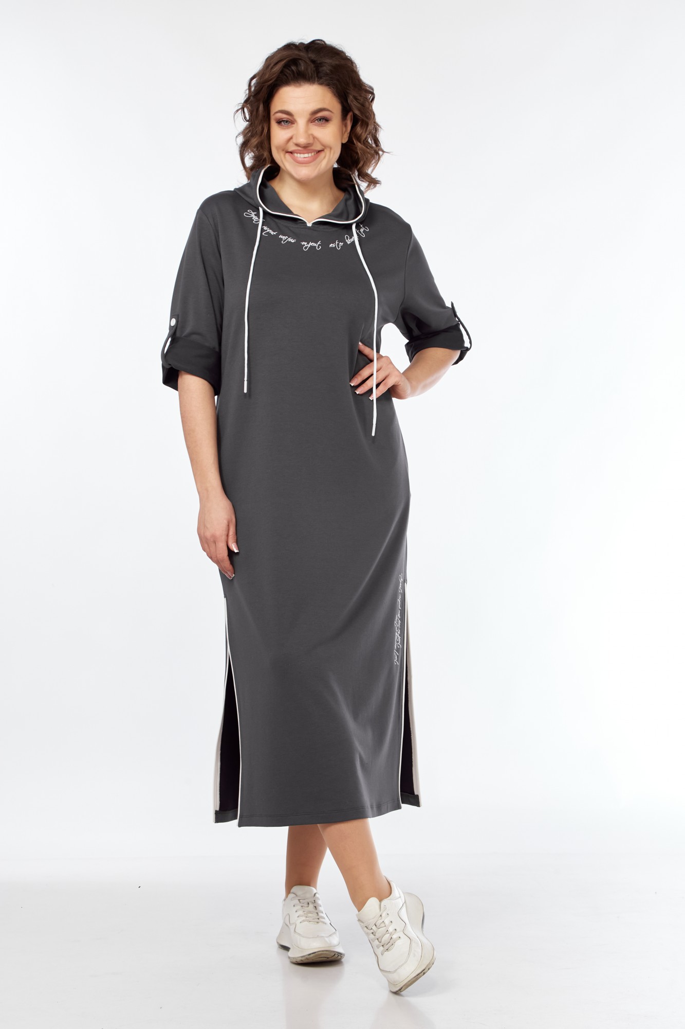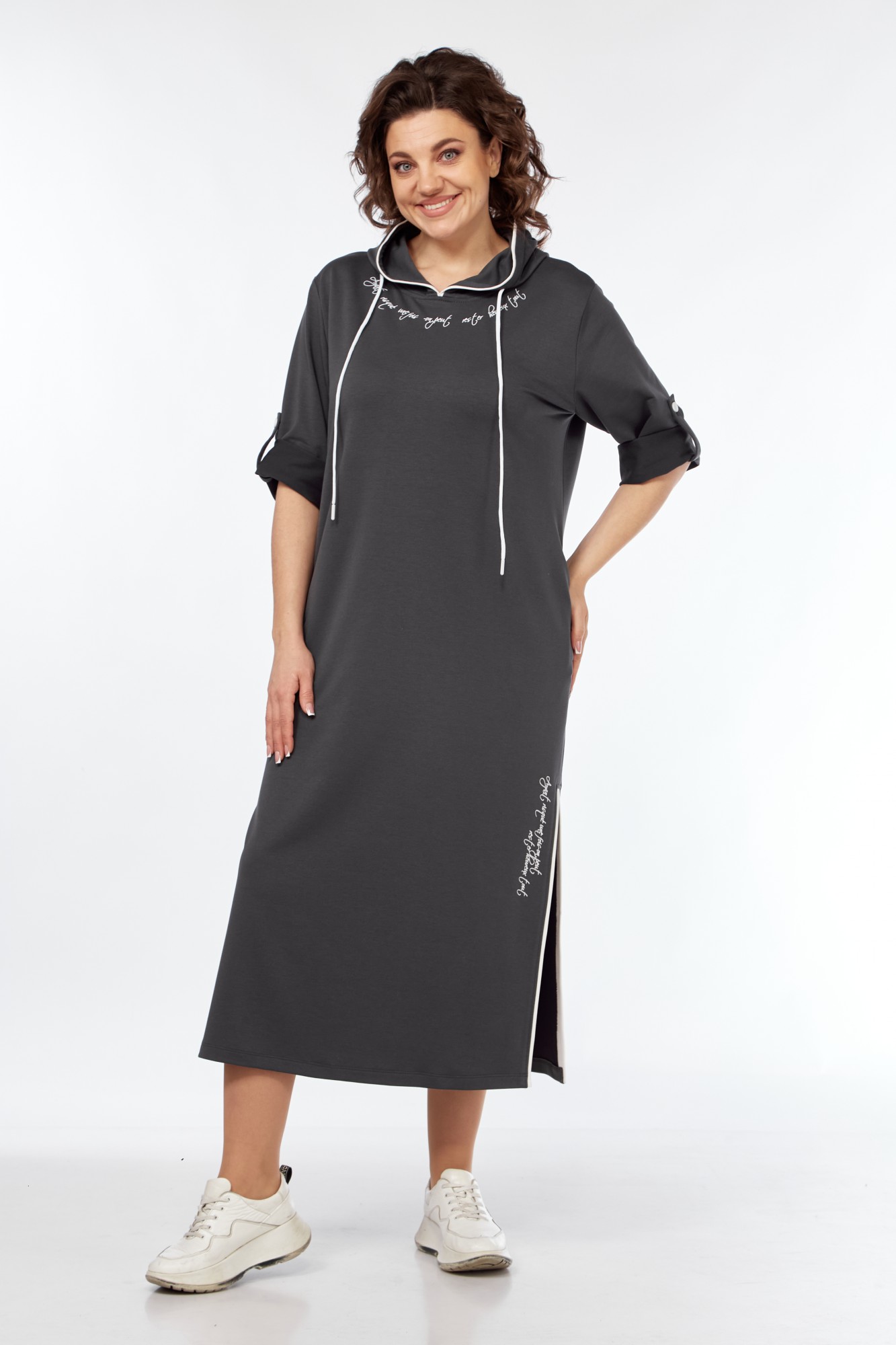 Платье женское полуприлегающего силуэта. Спинка со средним швом. Перед с печатью в виде надписей вдоль горловины и левого бока внизу. Рукав длиной 3/4 с отворотом и хлястиком. Воротник-капюшон с кулисой и шнурком. По внешнему краю кант из отделочной ткани. По боковым швам обработаны разрезы так же с кантом из отделочной ткани.