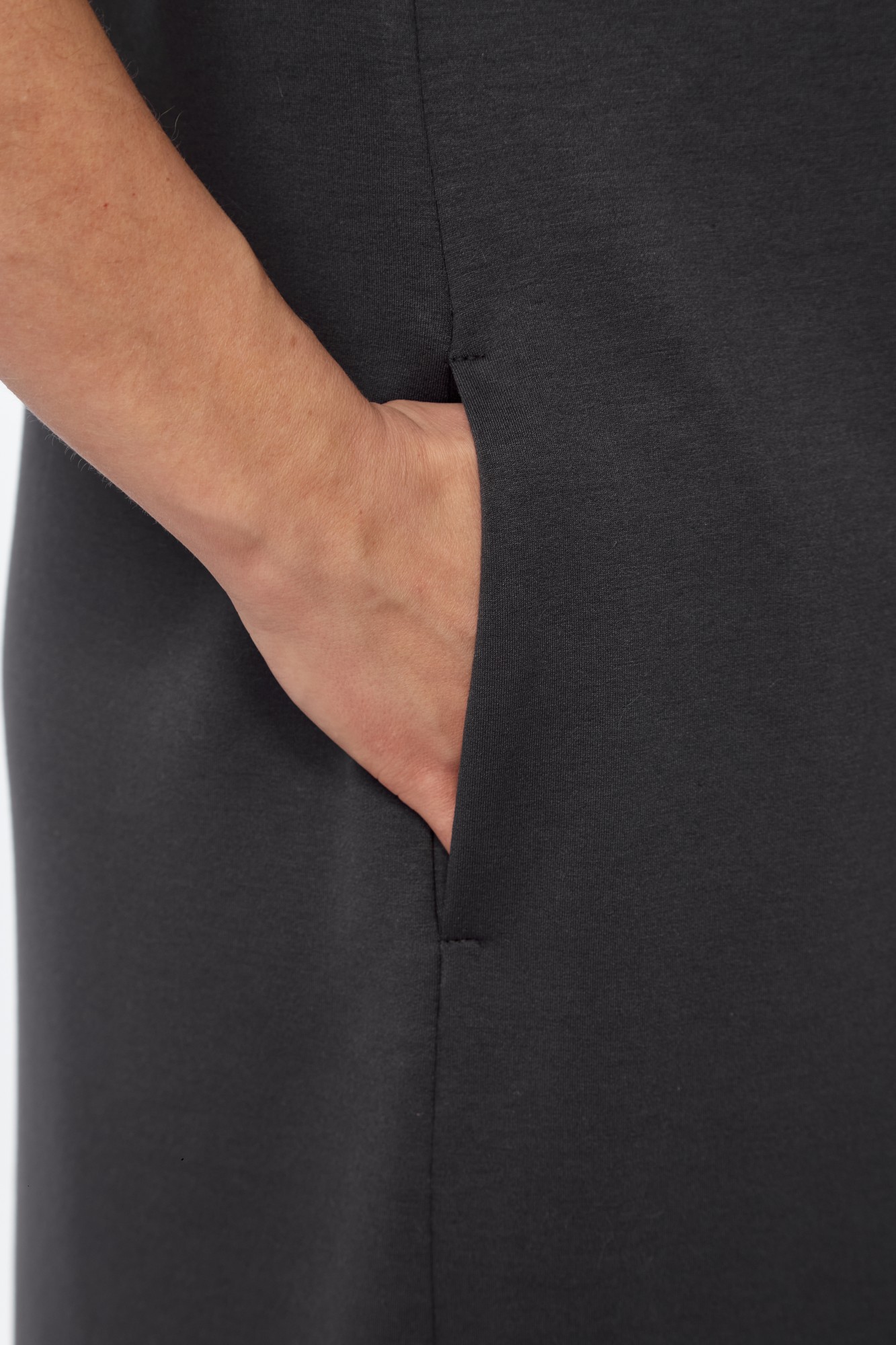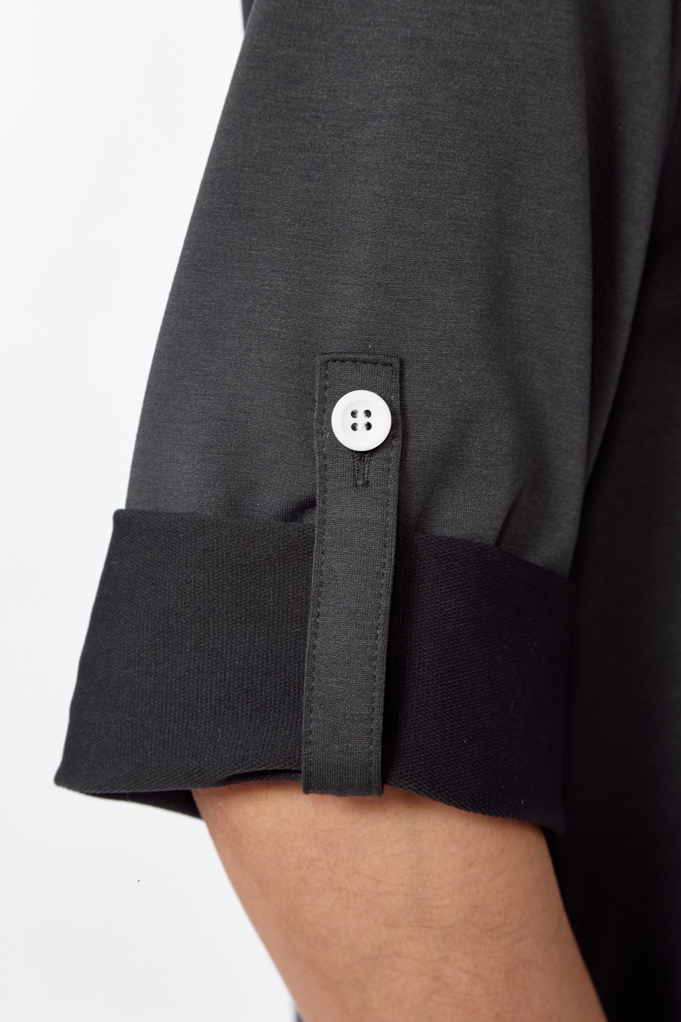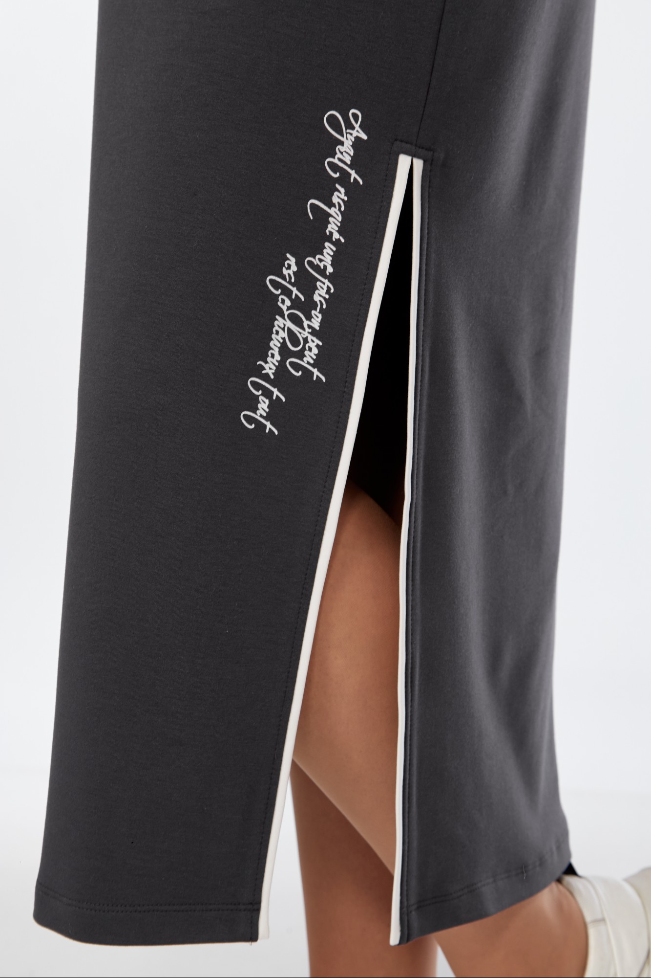 Платье женское полуприлегающего силуэта. Спинка со средним швом. Перед с печатью в виде надписей вдоль горловины и левого бока внизу. Рукав длиной 3/4 с отворотом и хлястиком. Воротник-капюшон с кулисой и шнурком. По внешнему краю кант из отделочной ткани. По боковым швам обработаны разрезы так же с кантом из отделочной ткани.