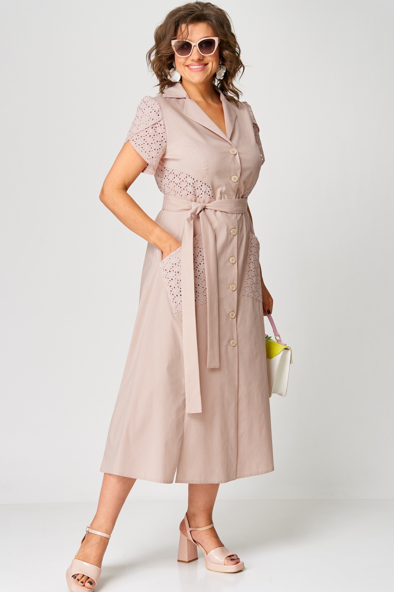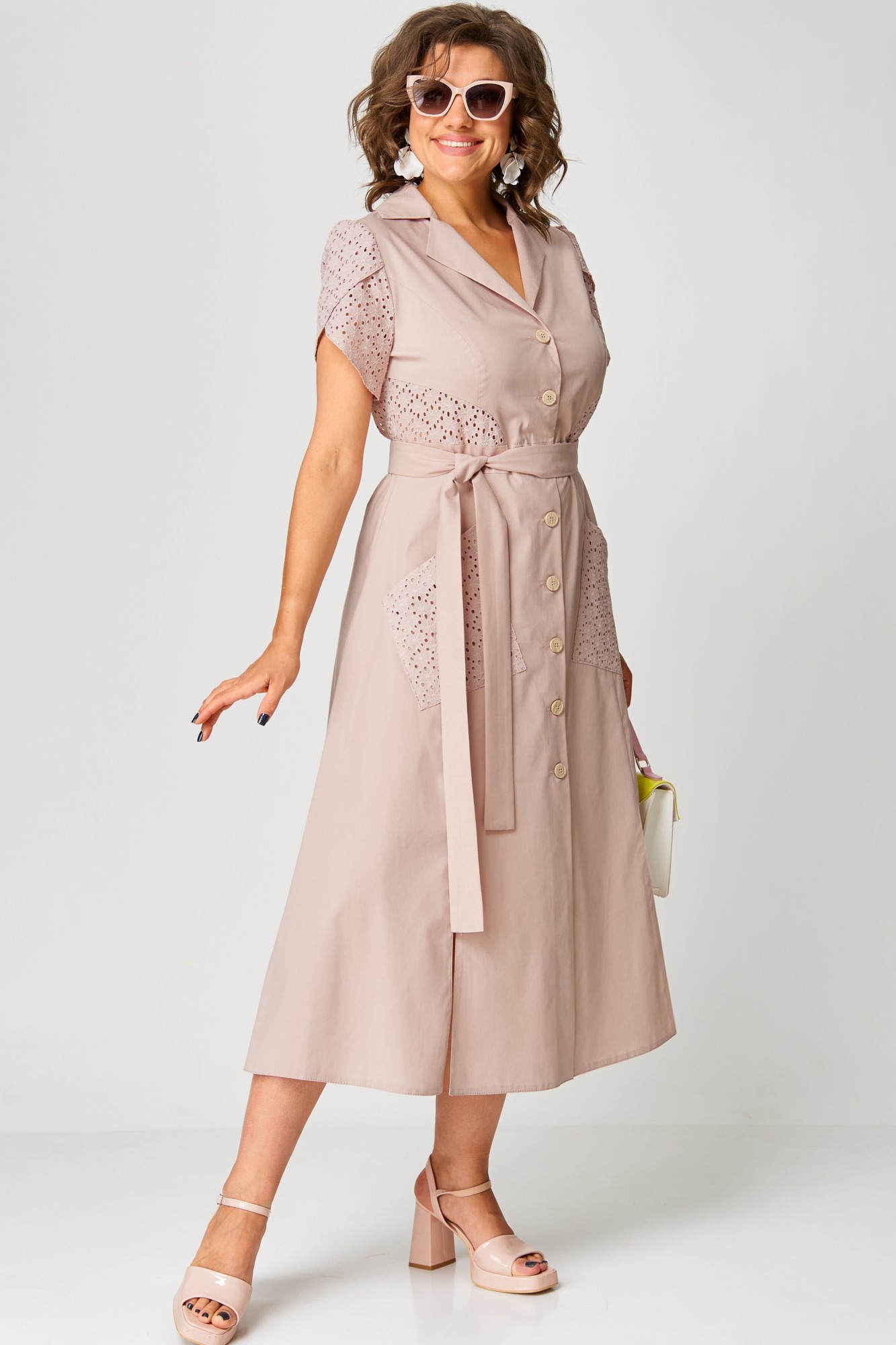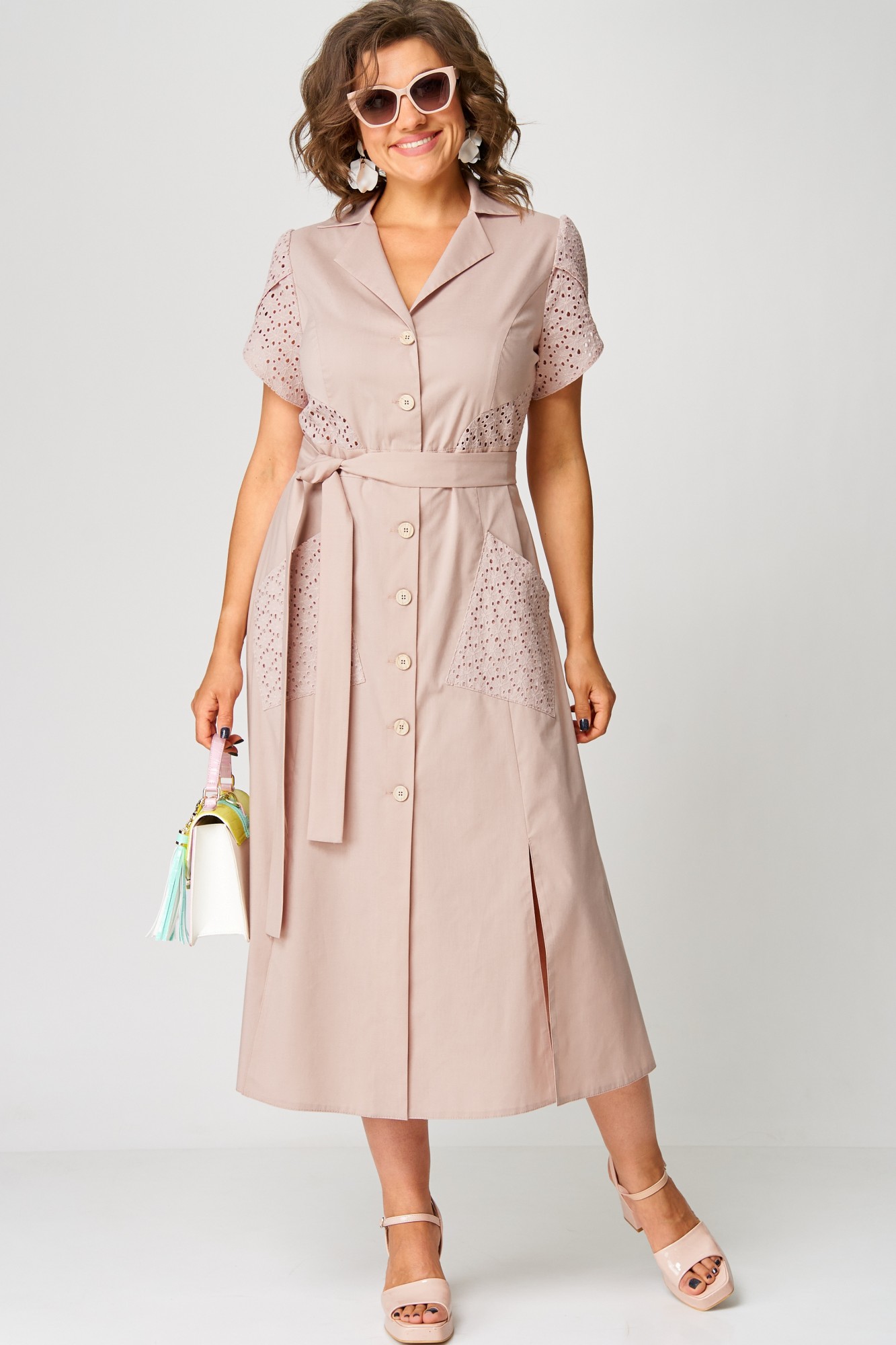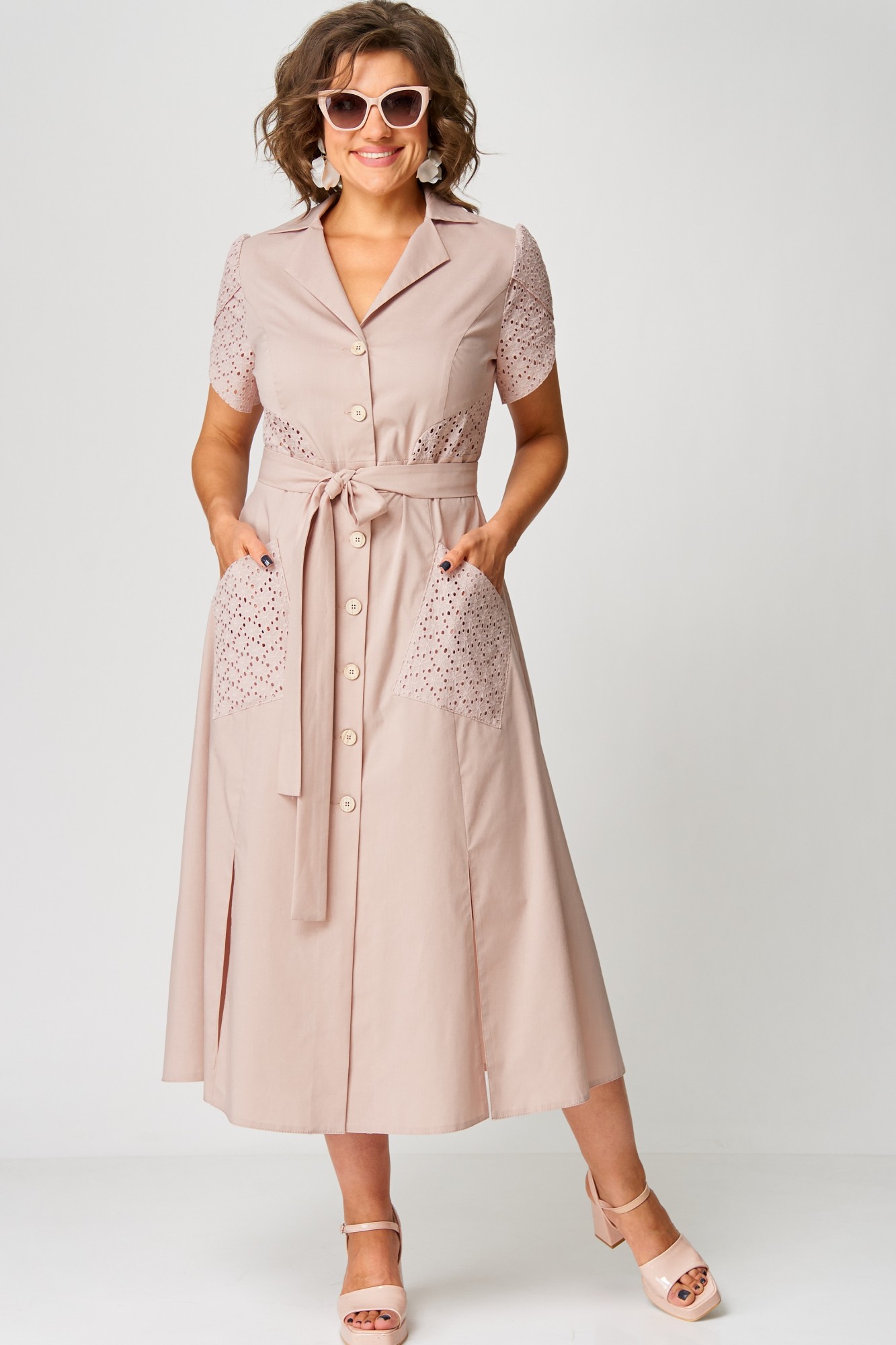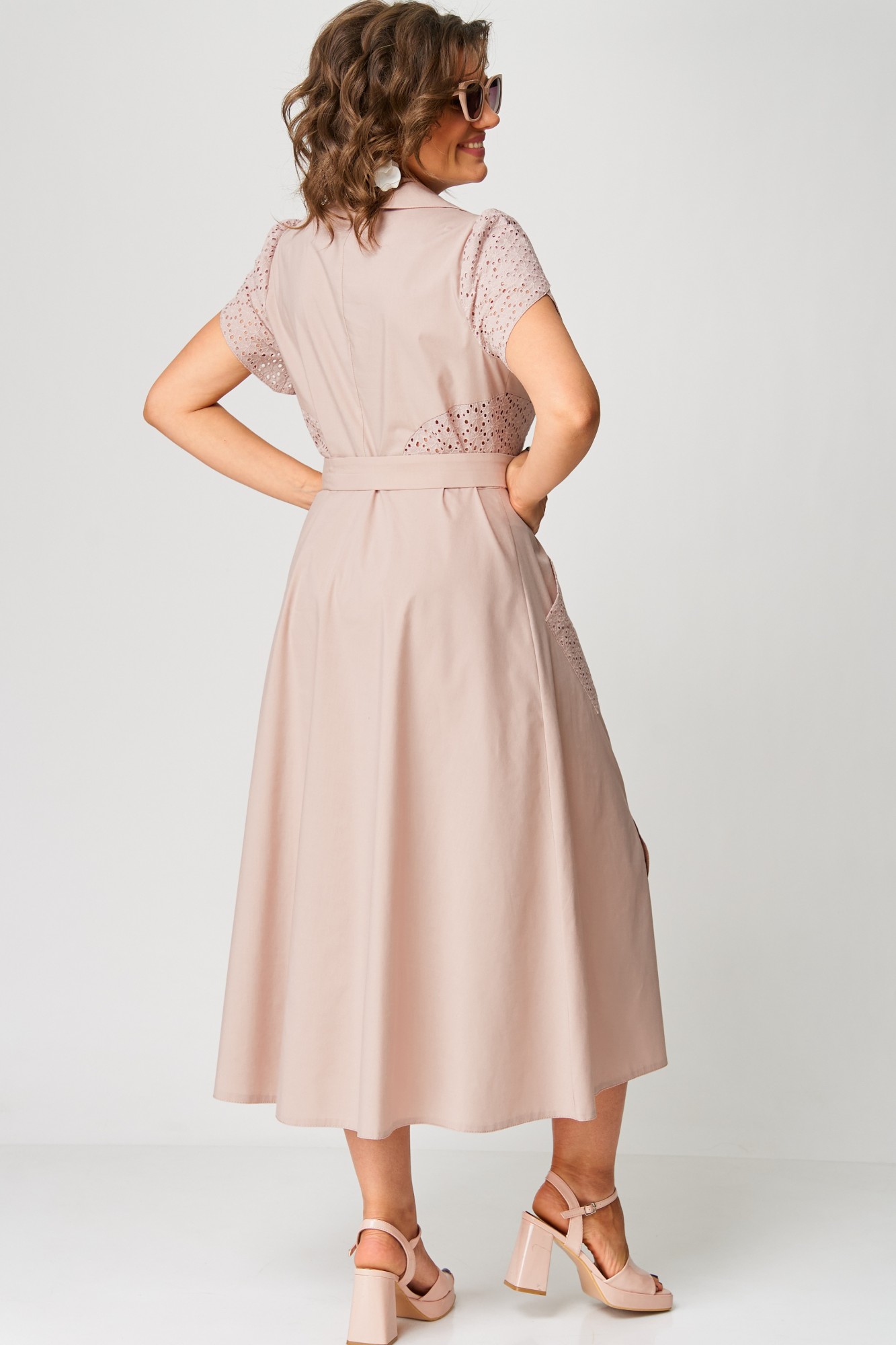 Платье женское нарядно-повседневное полуприлегающего силуэта слегка расширенное к низу, выполнено из хлопка в сочетании с отделочным кружевом(шитье). Платье отрезное по талии с застежкой на обметанные петли и отделочные пуговицы. Вырез горловины отложной воротник и подборт, рукав фентези. По переду платья накладные карманы и разрезы. Декором платья служат вставки по спинке и полочке из отделочной ткани и пояс из основной ткани.
