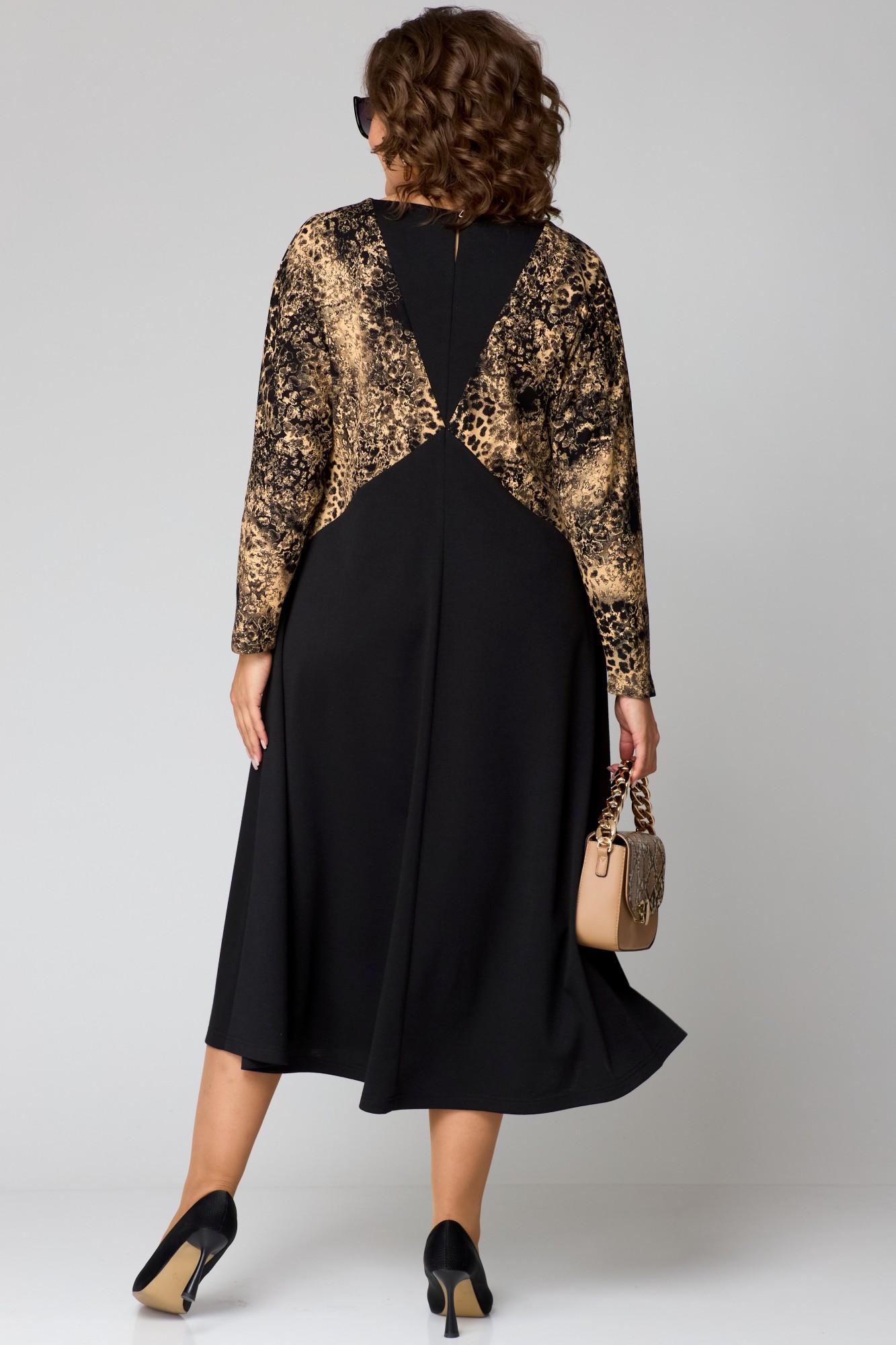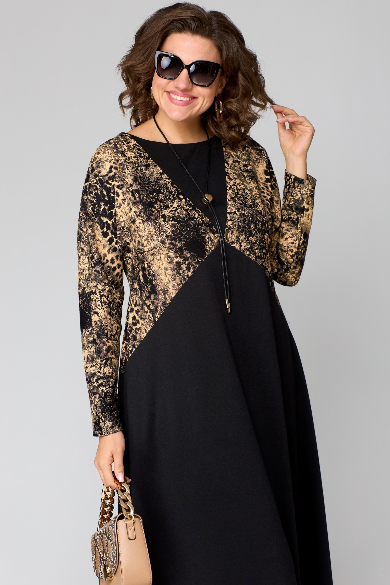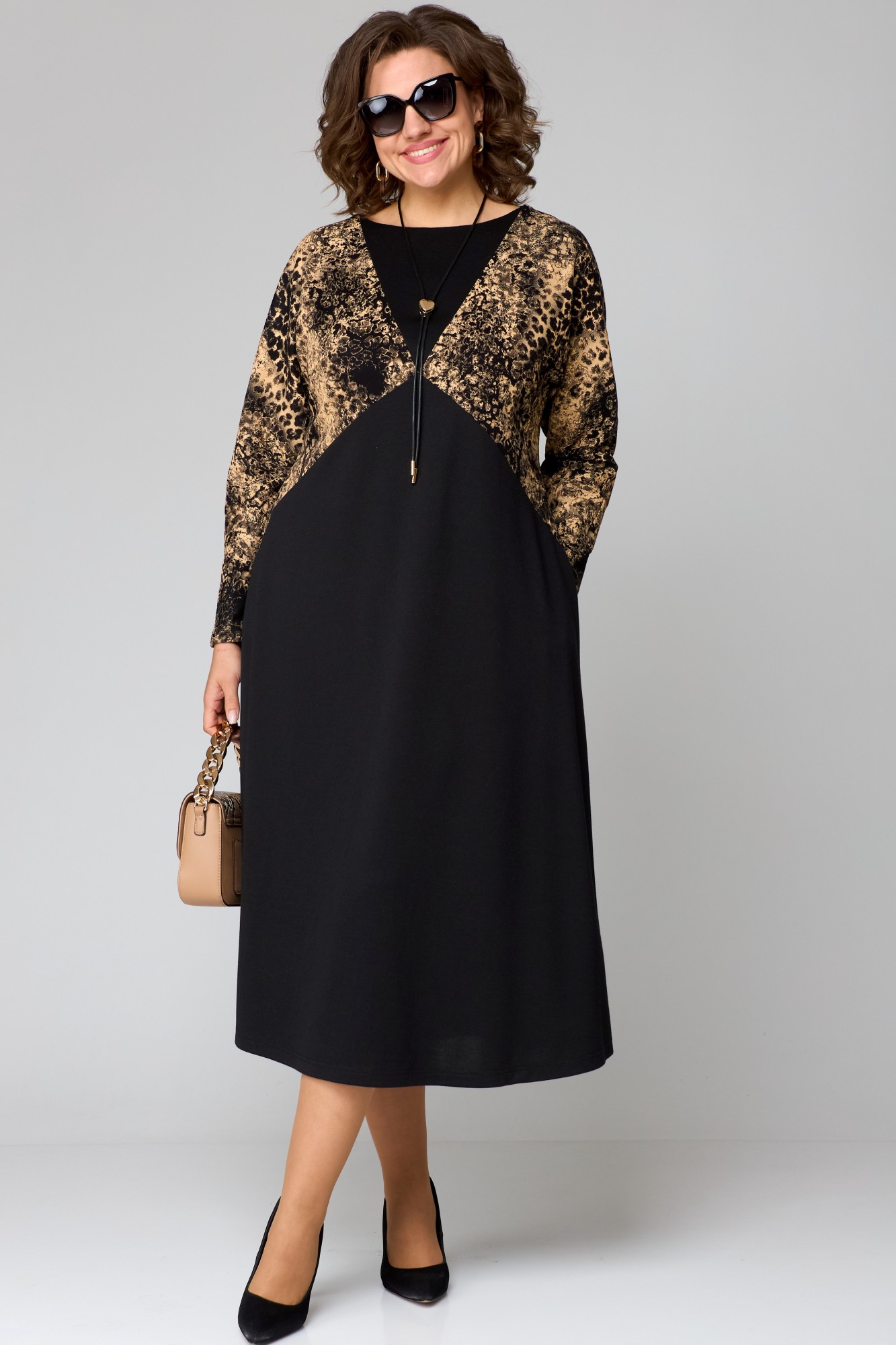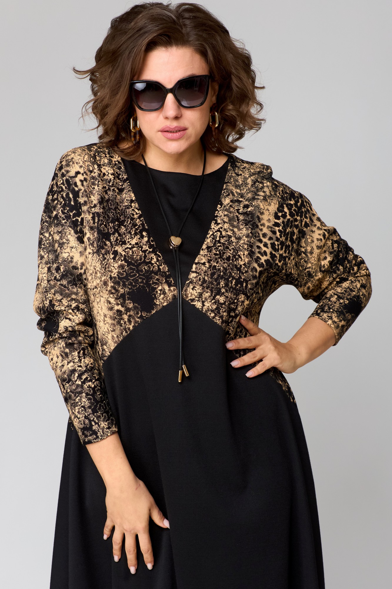 Платье женское повседневное полуприлегающего силуэта расширенное к низу, выполнено из трикотажного полотна в сочетании двух дизайнов. Вырез горловины круглый обработан обтачкой, рукав цельнокроеный реглан, по полочке и спинке фигурные подрезы. В боковых швах обработаны карманы. Декором платья служит дизайн трикотажного полотна.