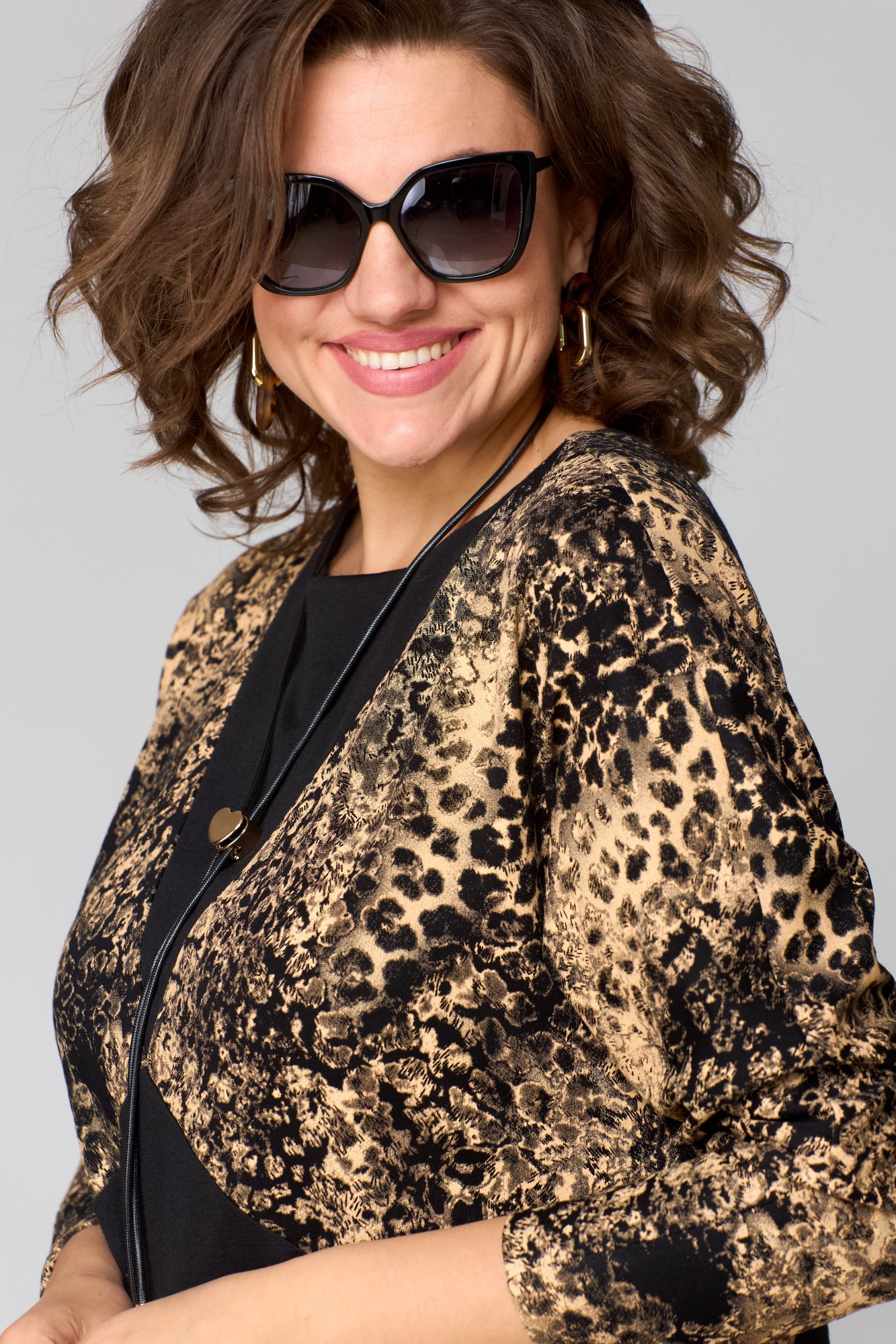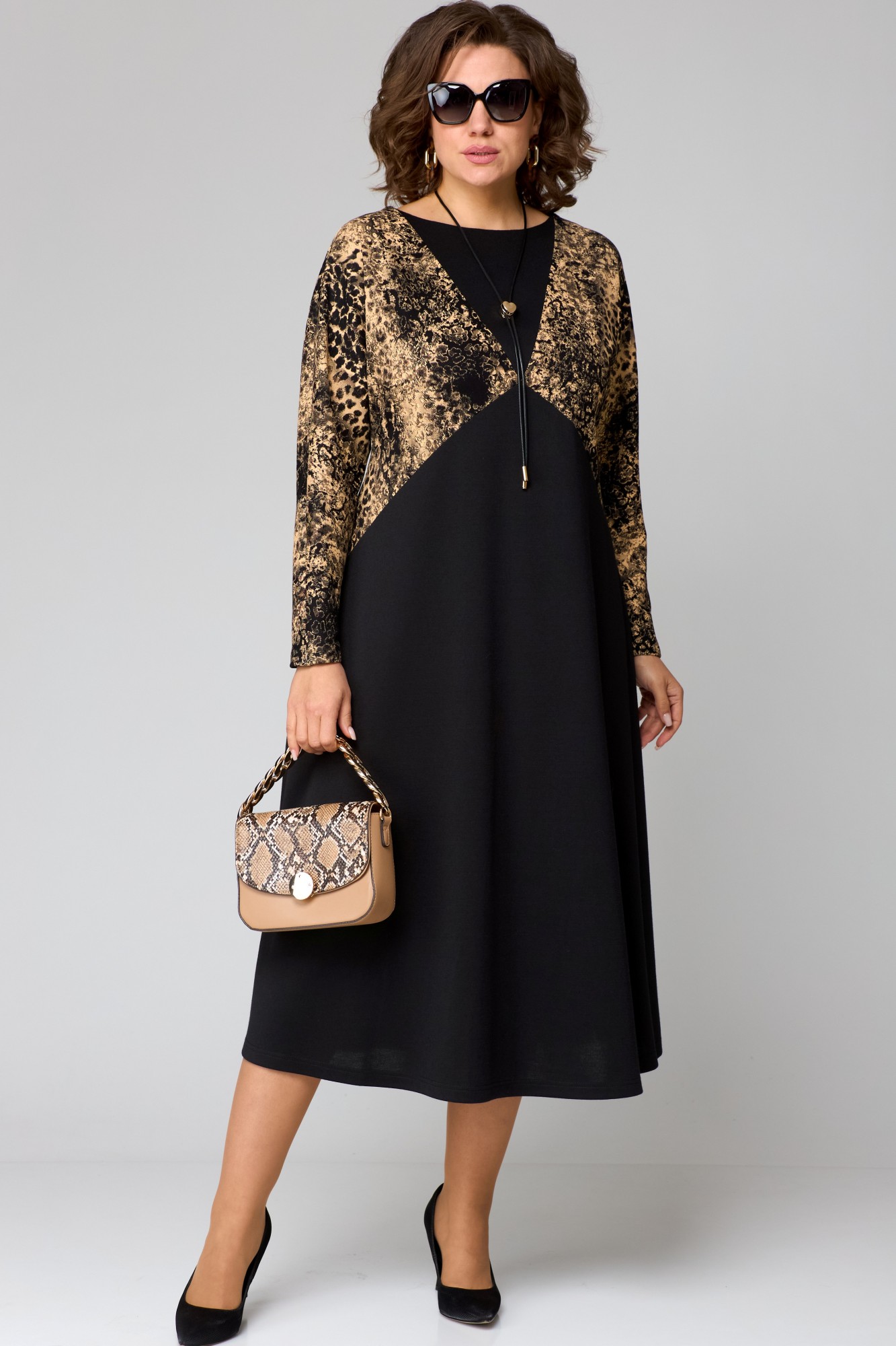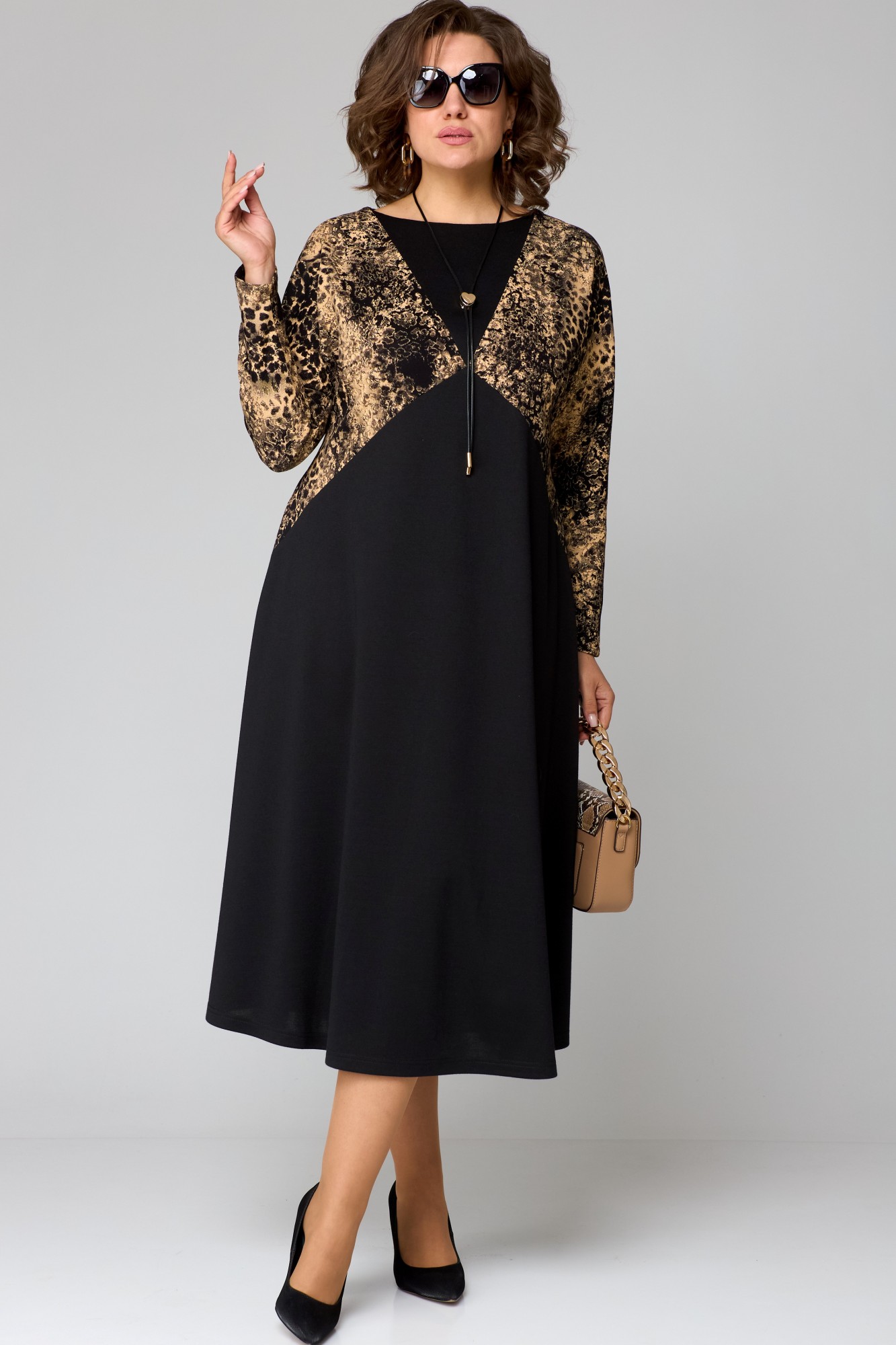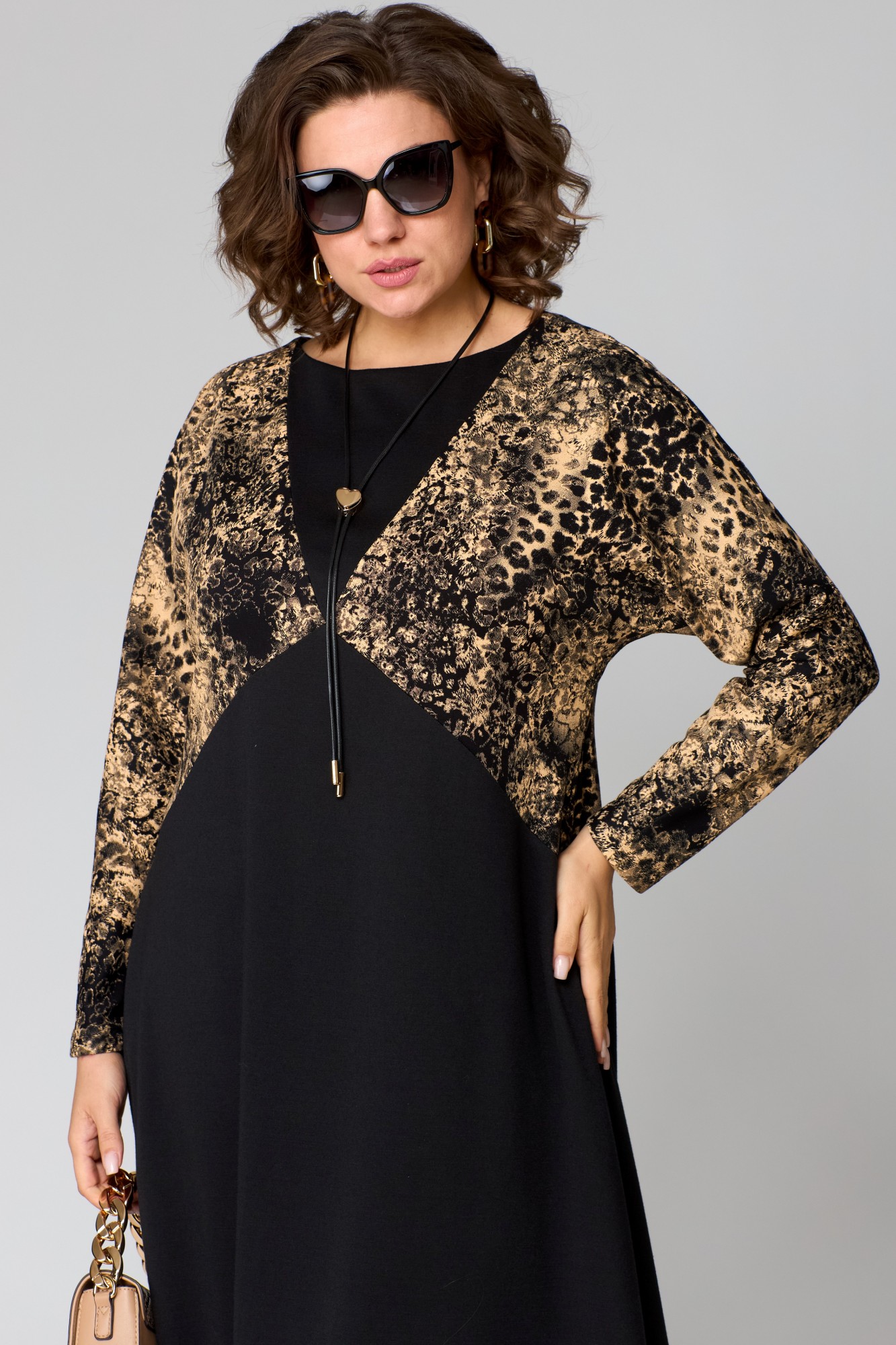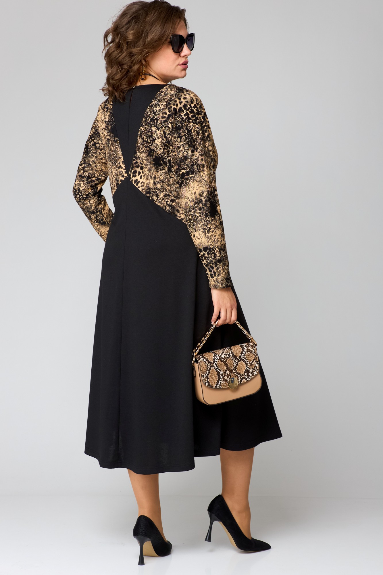 Платье женское повседневное полуприлегающего силуэта расширенное к низу, выполнено из трикотажного полотна в сочетании двух дизайнов. Вырез горловины круглый обработан обтачкой, рукав цельнокроеный реглан, по полочке и спинке фигурные подрезы. В боковых швах обработаны карманы. Декором платья служит дизайн трикотажного полотна.
