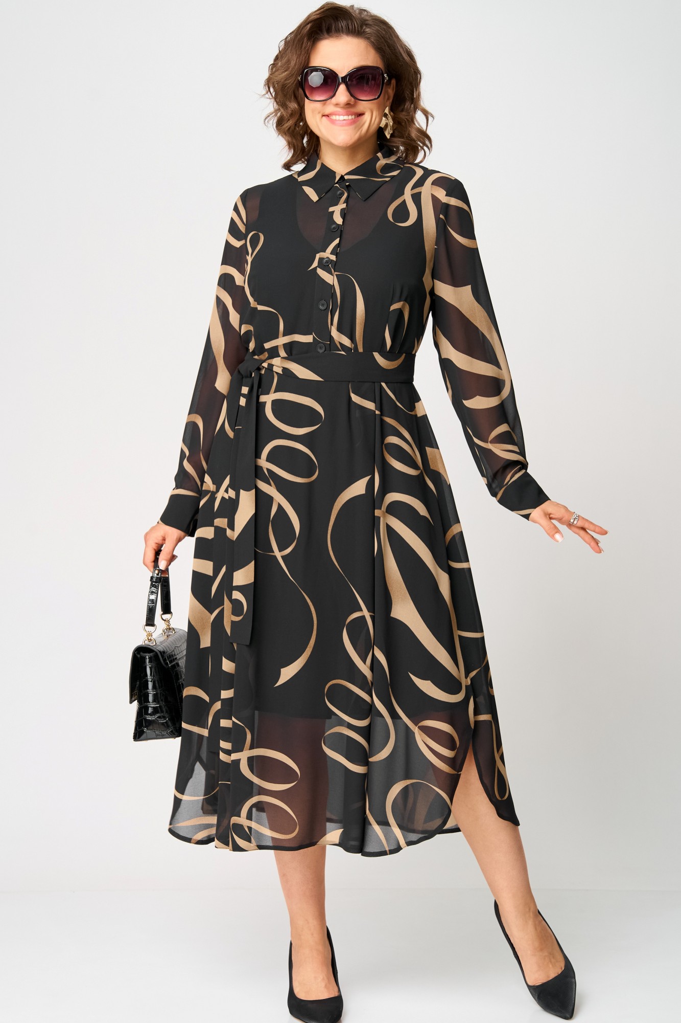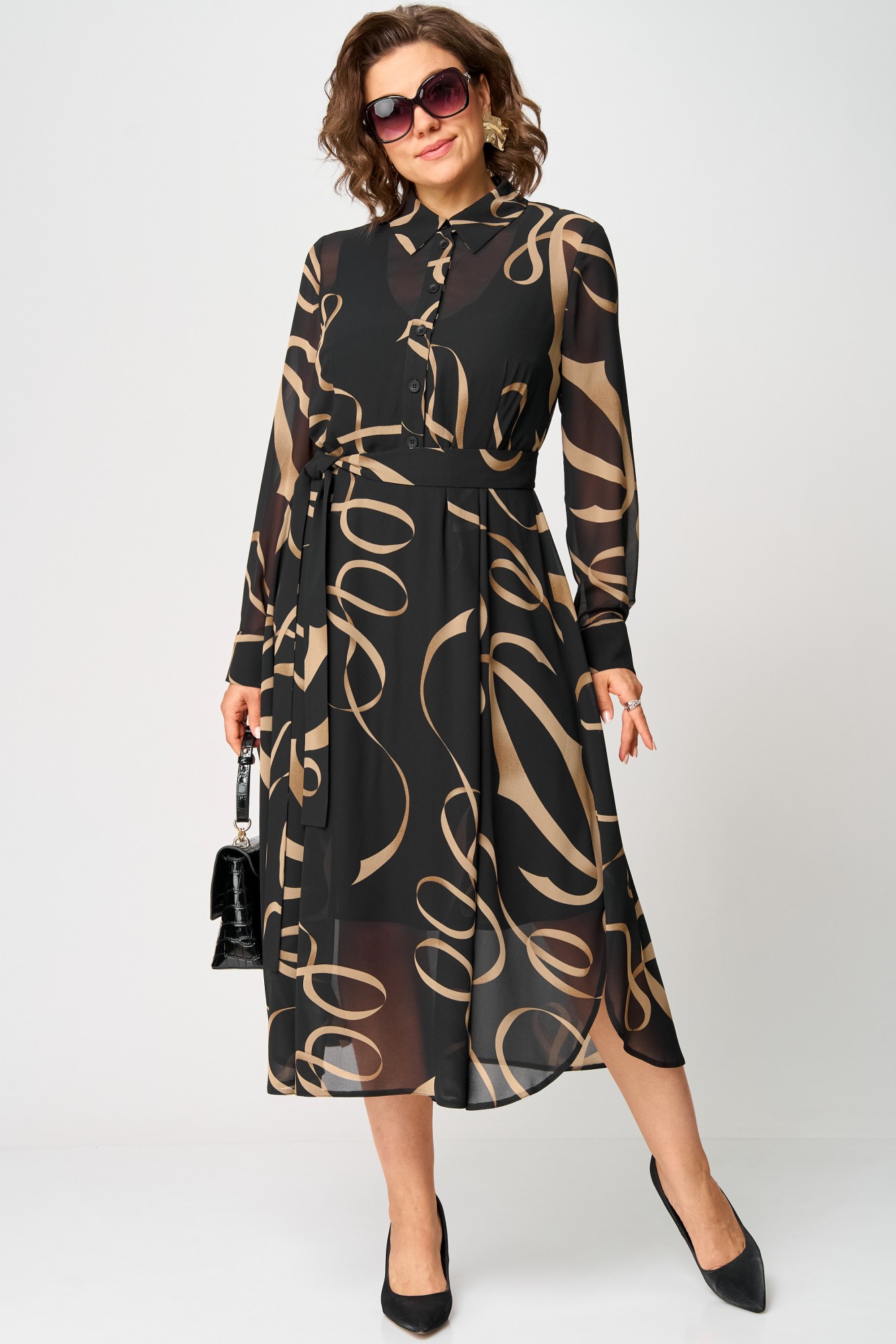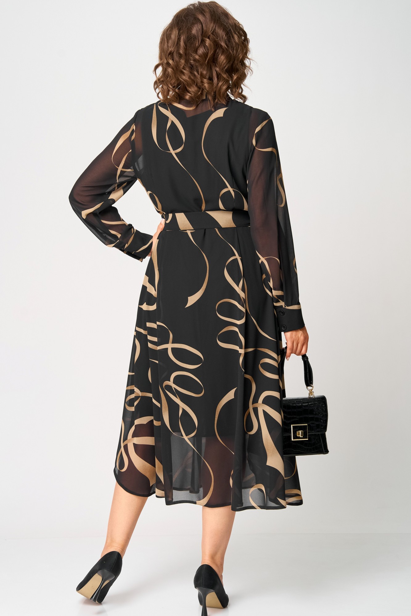 Платье женское нарядно-повседневное полуприлегающего силуэта до талии расширенное к низу. Платье отрезное по талии, выполнено из креп-шифона, врез горловины воротник на стойке рубашечного типа, рукав втачной по низу на притачной манжете. Низ платья фигурный, в боковых швах обработаны разрезы. По юбке платья от талии трикотажная подкладка. Декором платья служит съемный пояс и принт самой ткани.