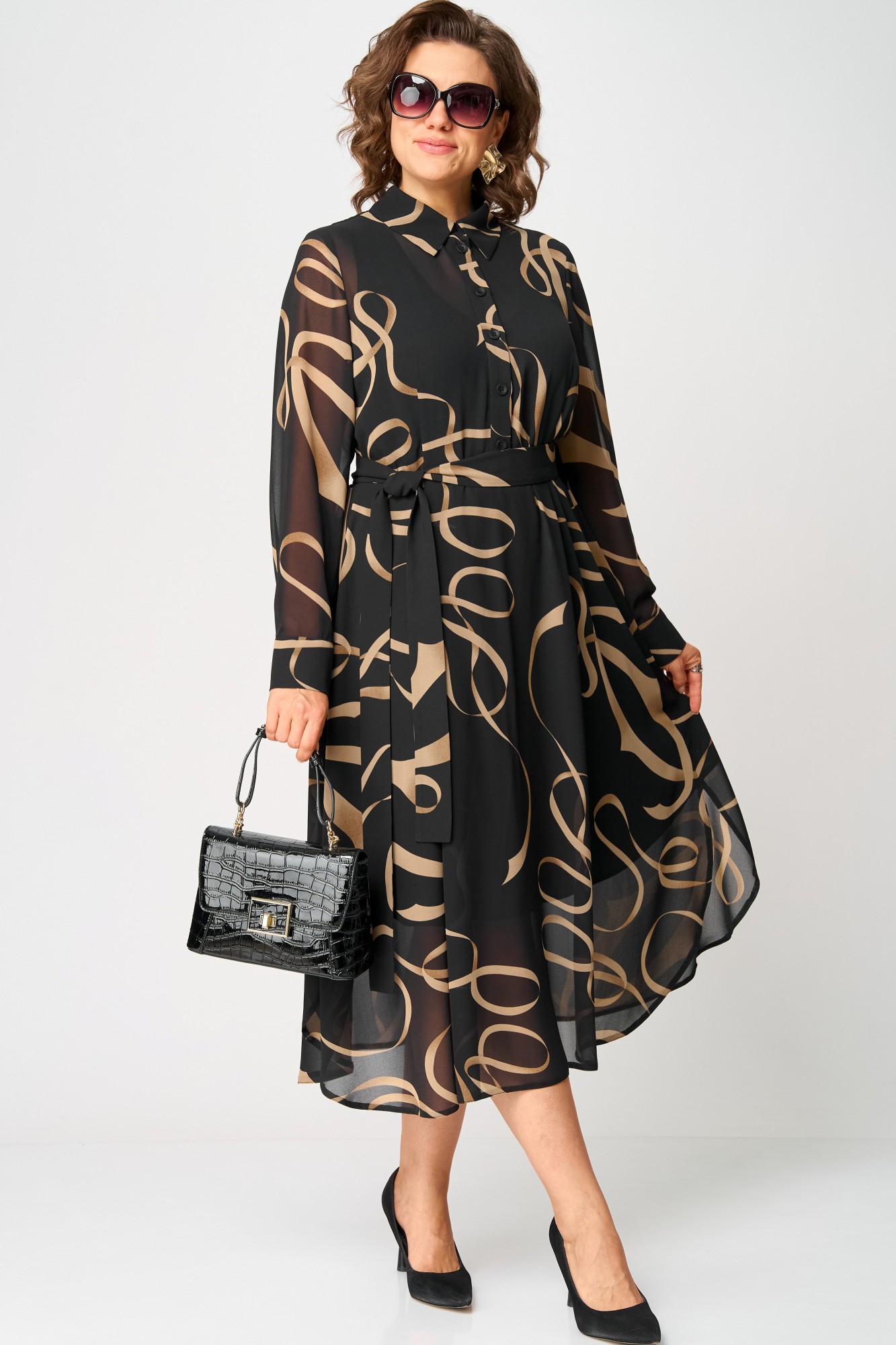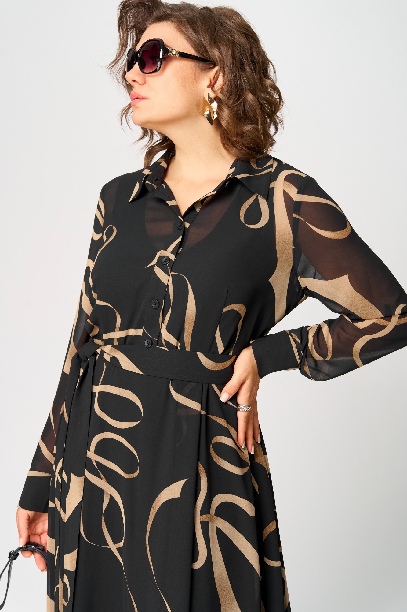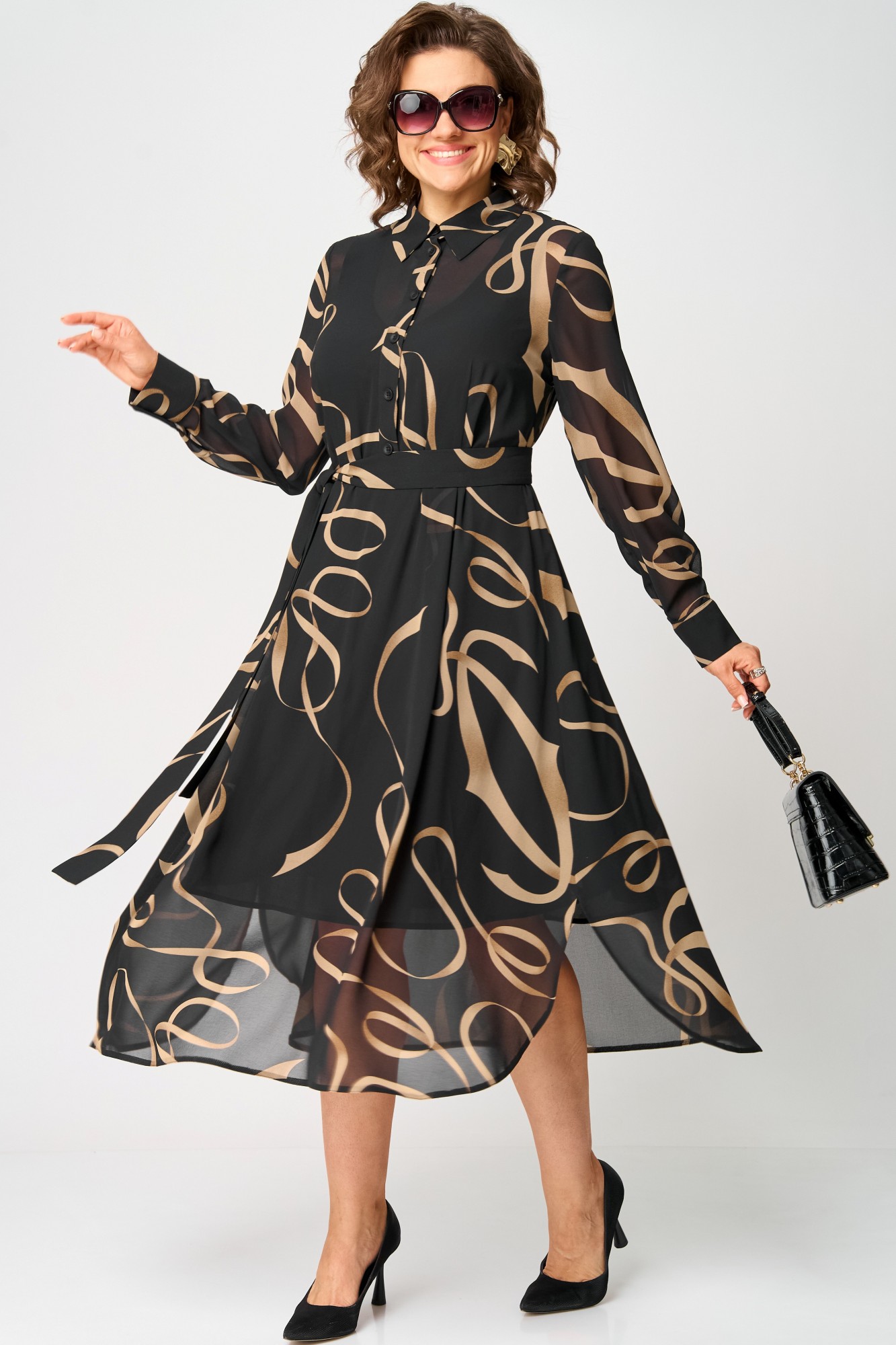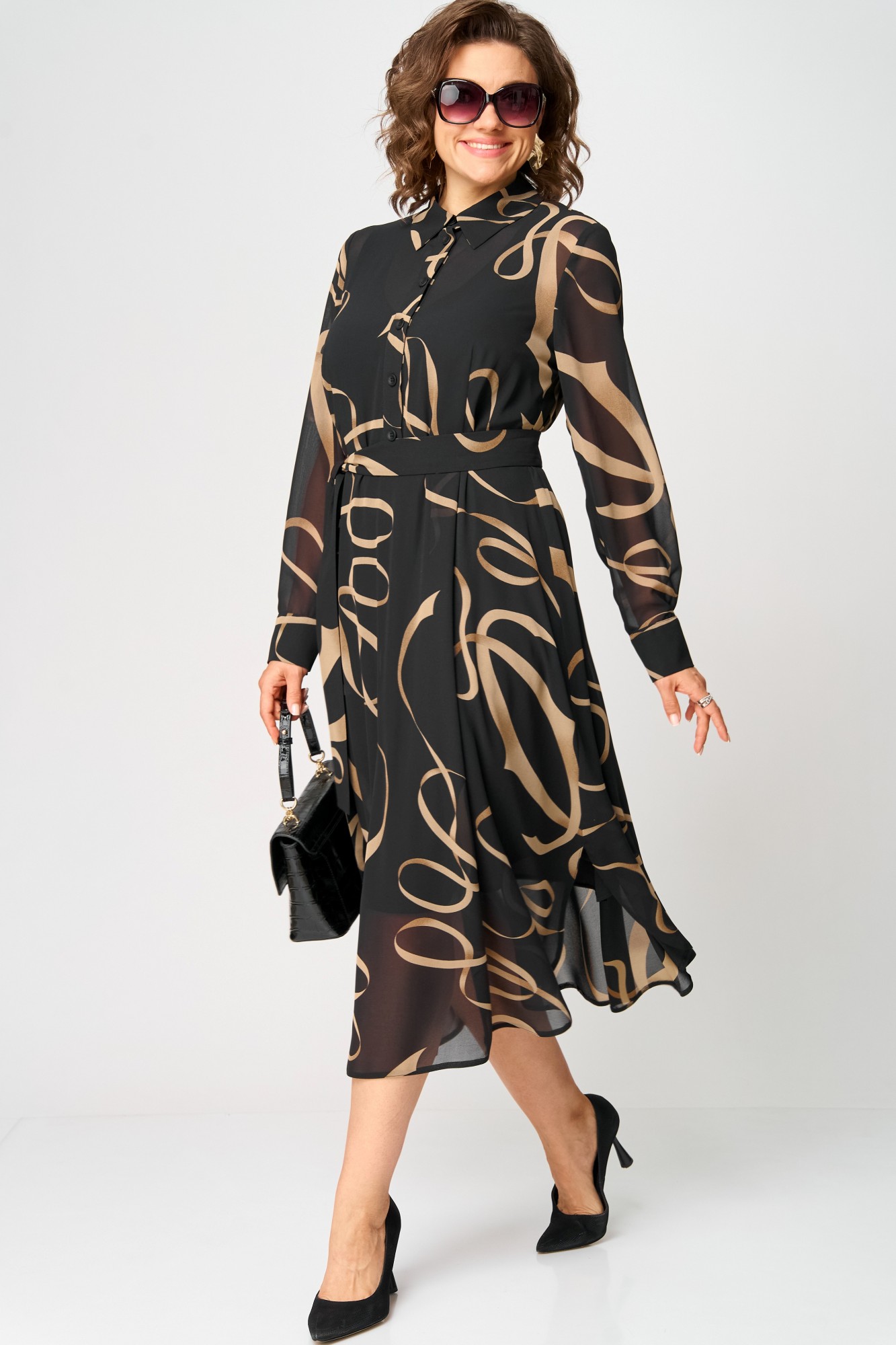 Платье женское нарядно-повседневное полуприлегающего силуэта до талии расширенное к низу. Платье отрезное по талии, выполнено из креп-шифона, врез горловины воротник на стойке рубашечного типа, рукав втачной по низу на притачной манжете. Низ платья фигурный, в боковых швах обработаны разрезы. По юбке платья от талии трикотажная подкладка. Декором платья служит съемный пояс и принт самой ткани.