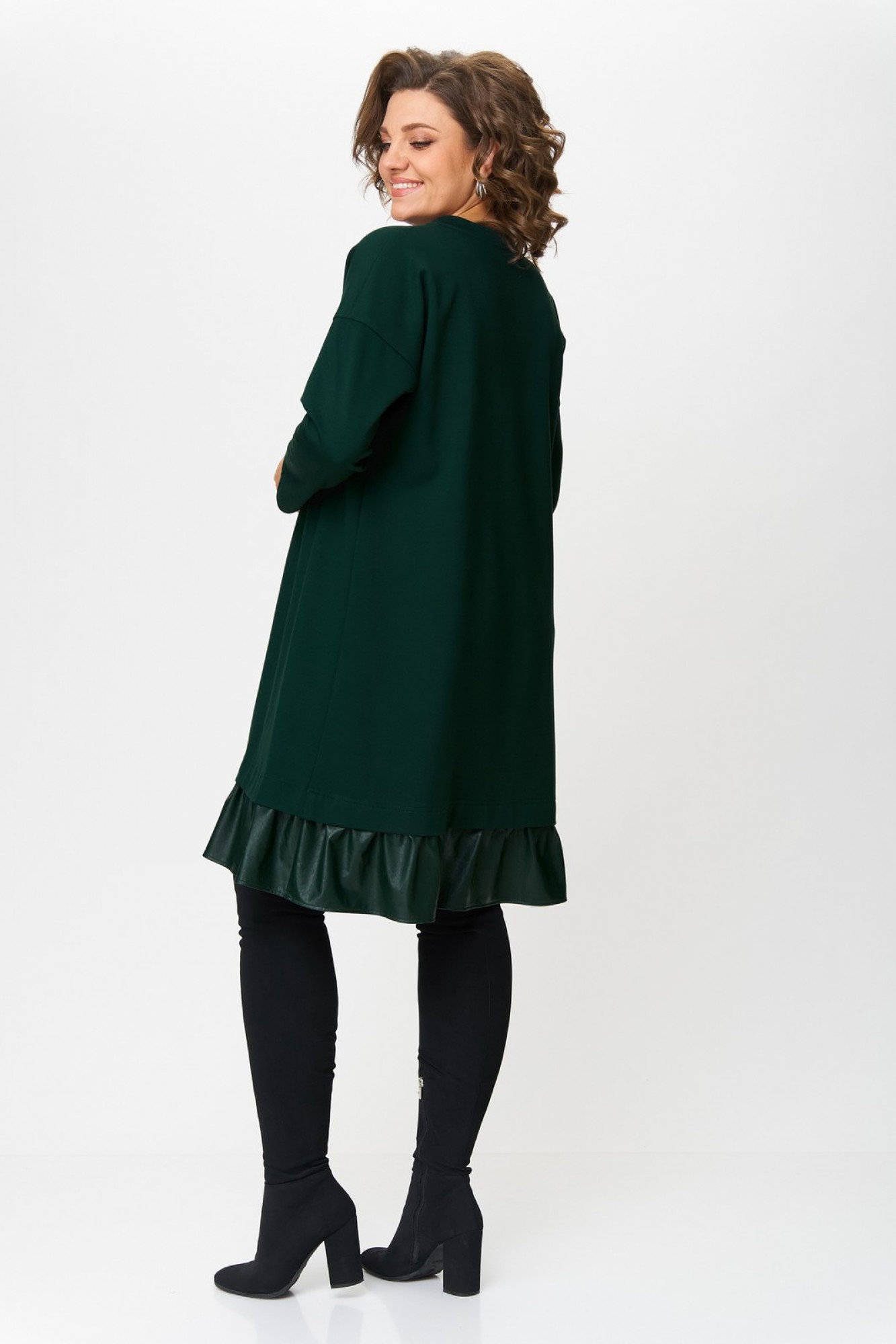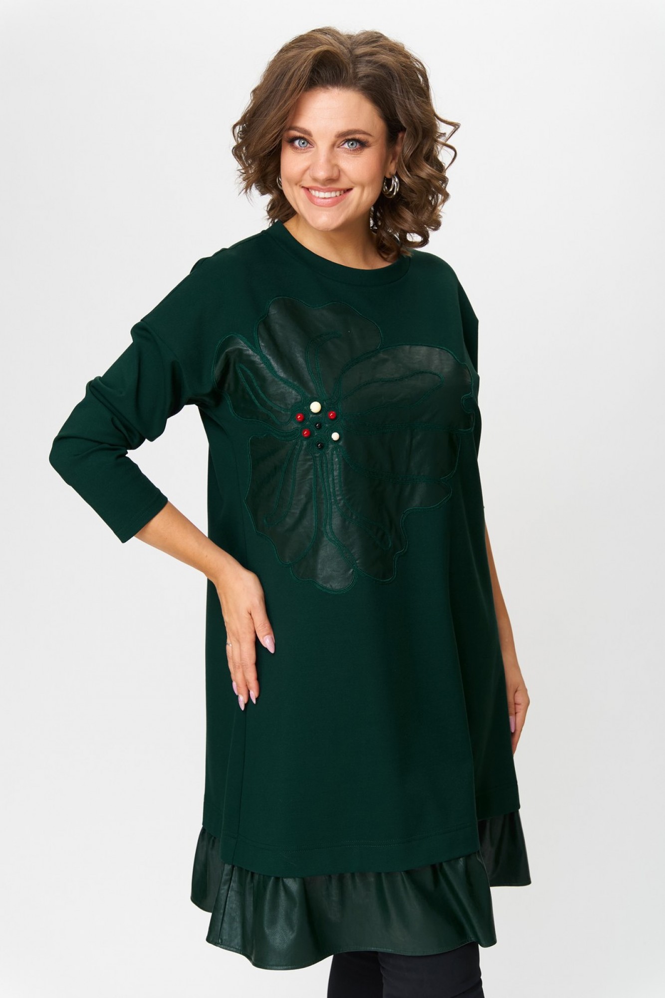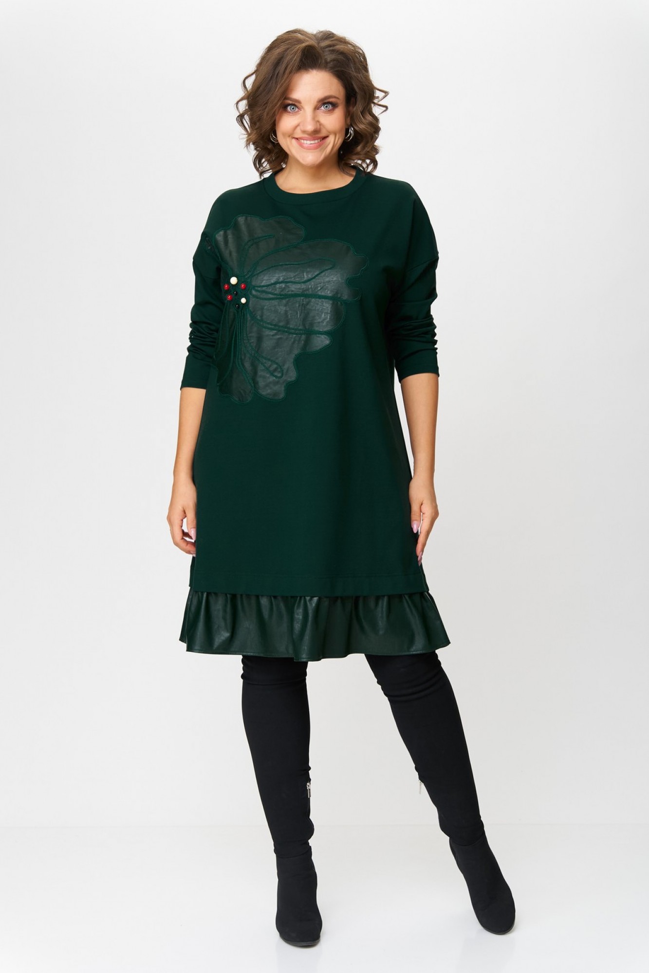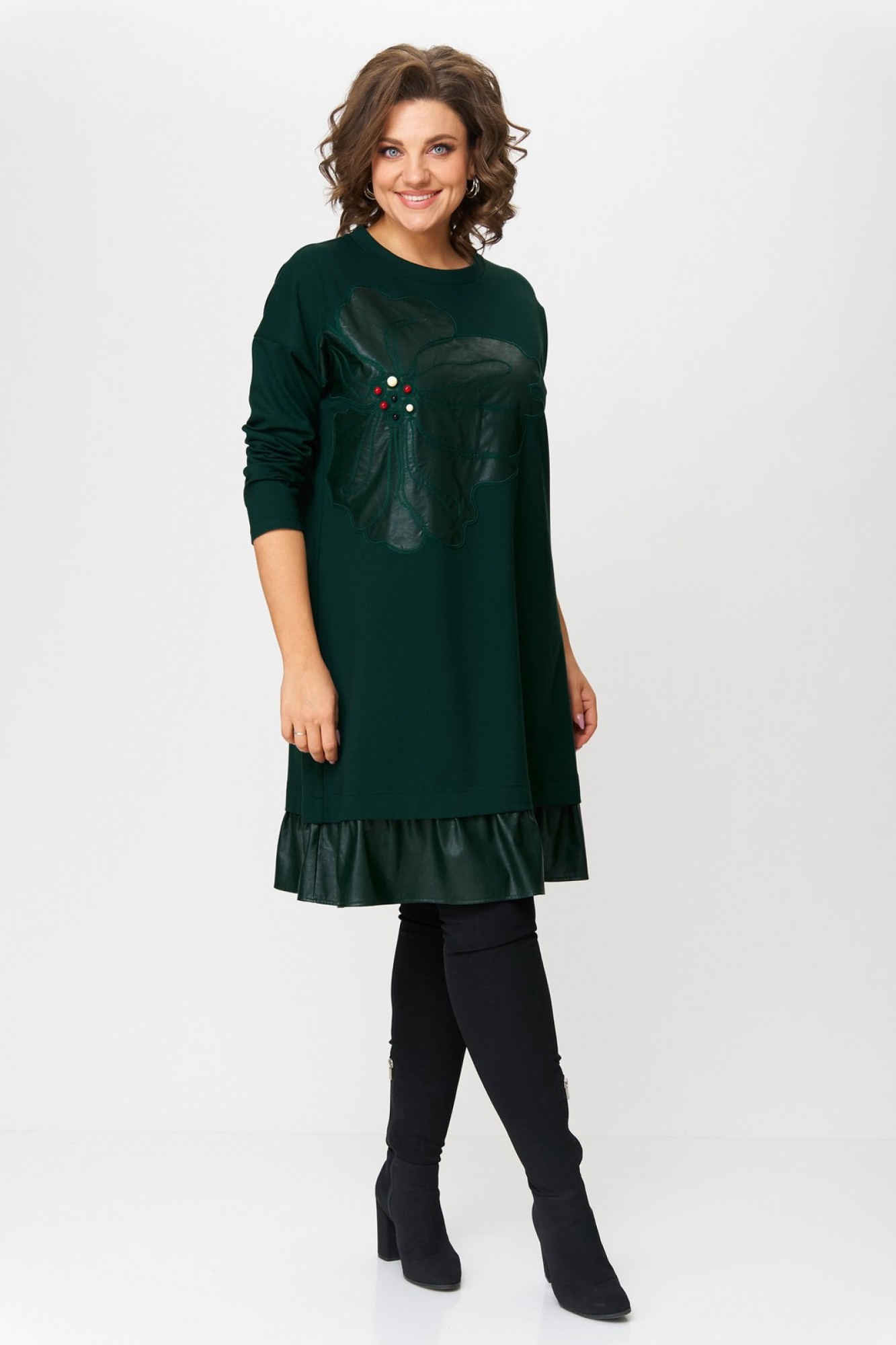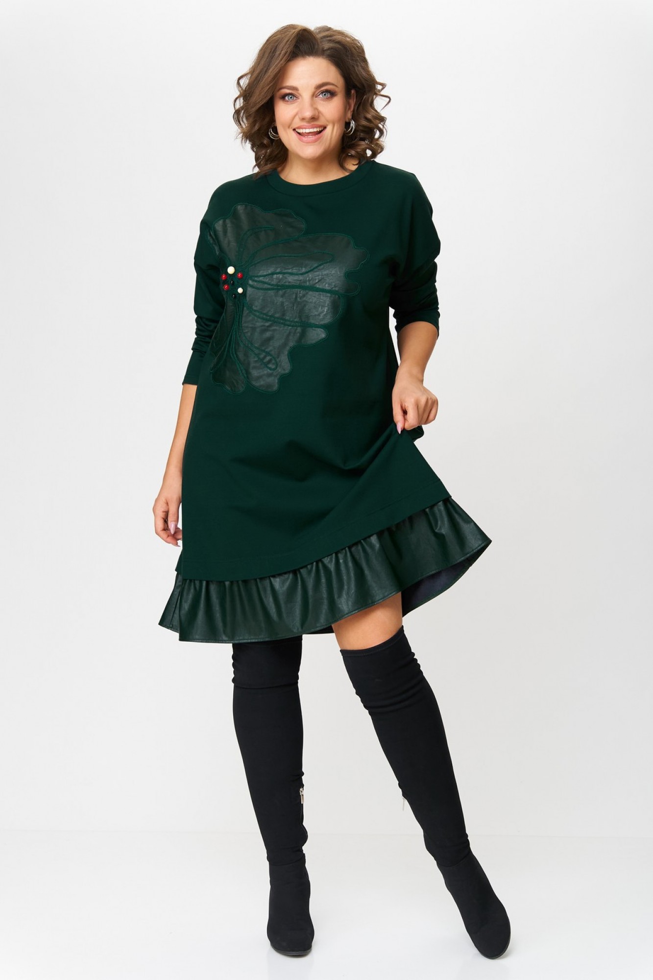 Платье свободного А-образного силуэта. Вырез горловины округлый, рукав спущенный, длинный. По низу изделия рюши из экокожи. Платье без застежки. Декором является аппликация-вышивка с пришивными бусинами из экокожи.