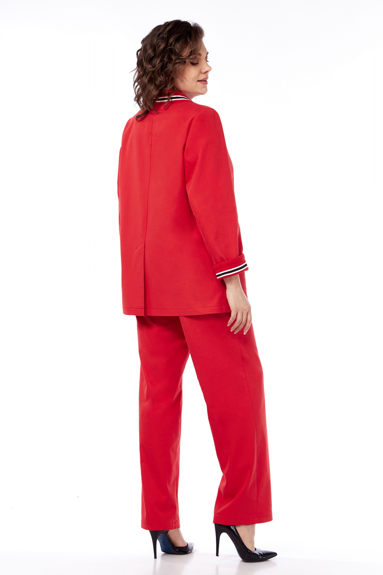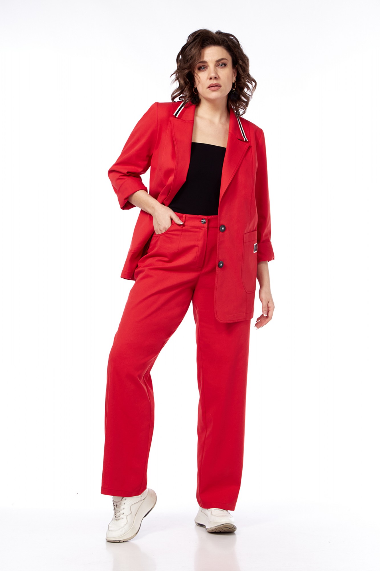 Костюм брючный 2х — предметный, состоит из жакета и брюк, из костюмной ткани. Жакет прямого силуэта с воротником пиджачного типа, застежка однобортная на две петли с пуговицами. По переду обработаны рельефы и накладные карманы. Спинка со средним швом, в котором обработана шлица. Рукава втачные, двухшовные, дополнены отложной манжетой из отделочной ткани. Брюки средней посадки, прямые от бедра. Пояс притачной с застежкой на петлю и пуговицу. По передним деталям брюк обработаны карманы, которые дополнены декоративными элементами. Задние детали брюк на кокетке, имеются фигурные накладные карманы. Костюм по швам декорирован отделочными строчками.