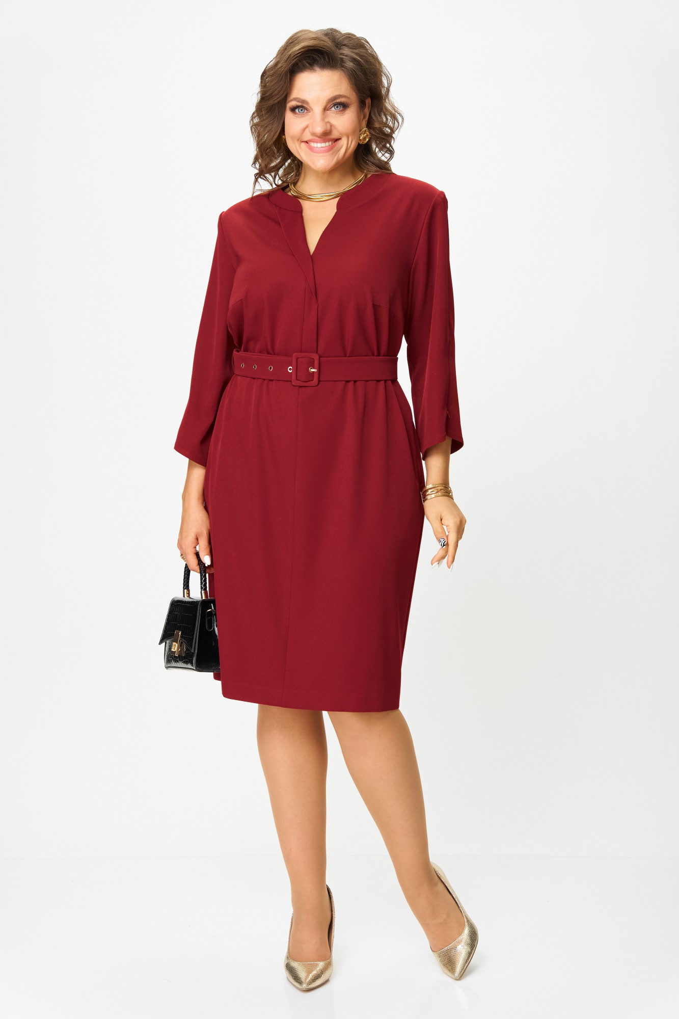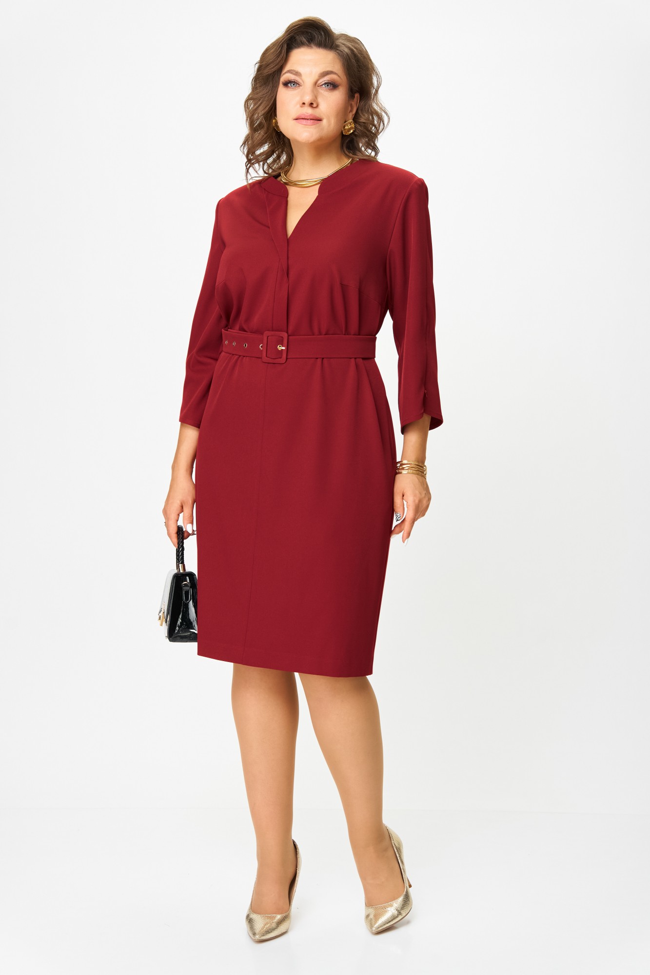 Платье женское. Без подкладки. Выполнено из плательной ткани средней плотности. Силуэт прямой. Рукав втачной. В рукаве в среднем шве вставлена потайная молния. Низ рукава фигурный. Вырез горловины обработан небольшим воротником и планкой. Спинка прямая со среднем швом без особенностей . Пояс в комплекте.