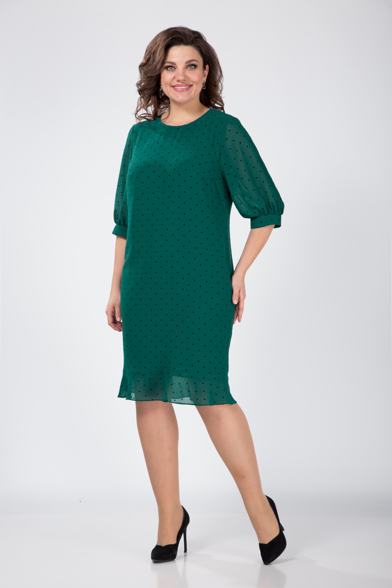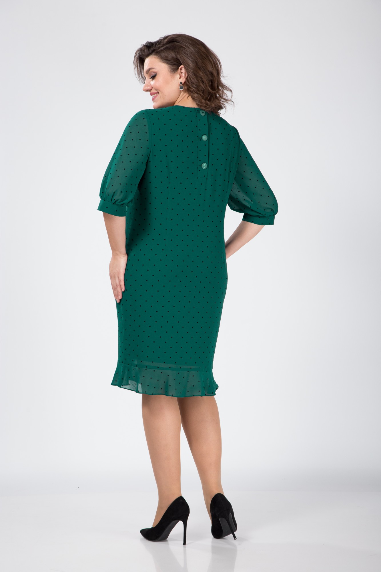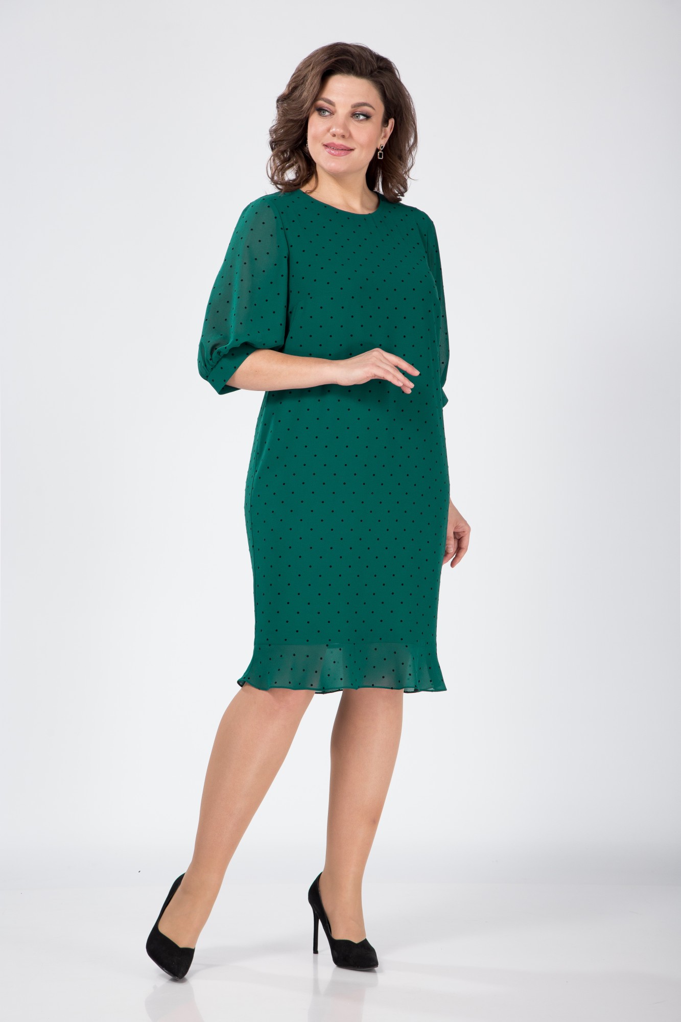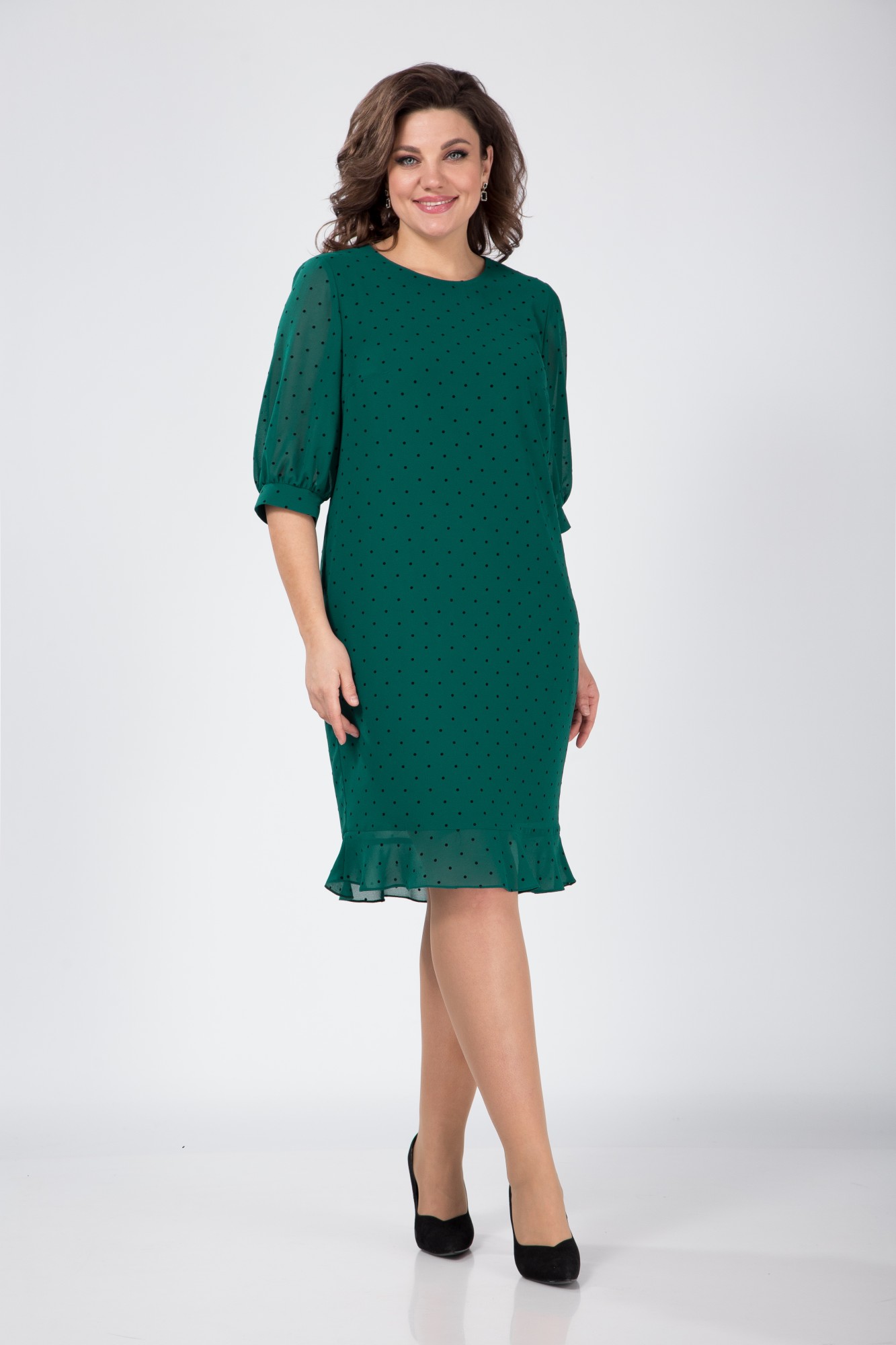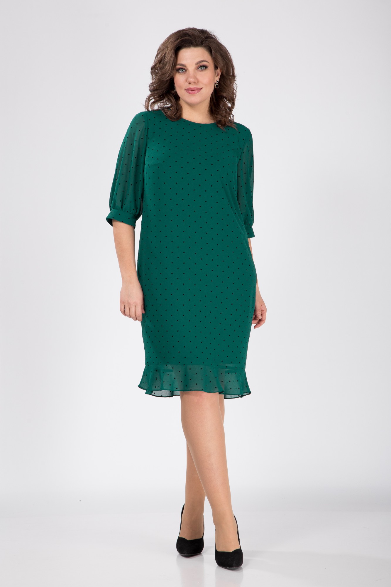Платье женское на подкладке полуприлегающего силуэта с округлым вырезом горловины и притачным воланом по низу. По спинке застежка на планку с пуговицами. Рукав втачной одношовный с манжетой по низу. Длина платья 104 см , длина рукава 42 см , ширина рукава 24 см.