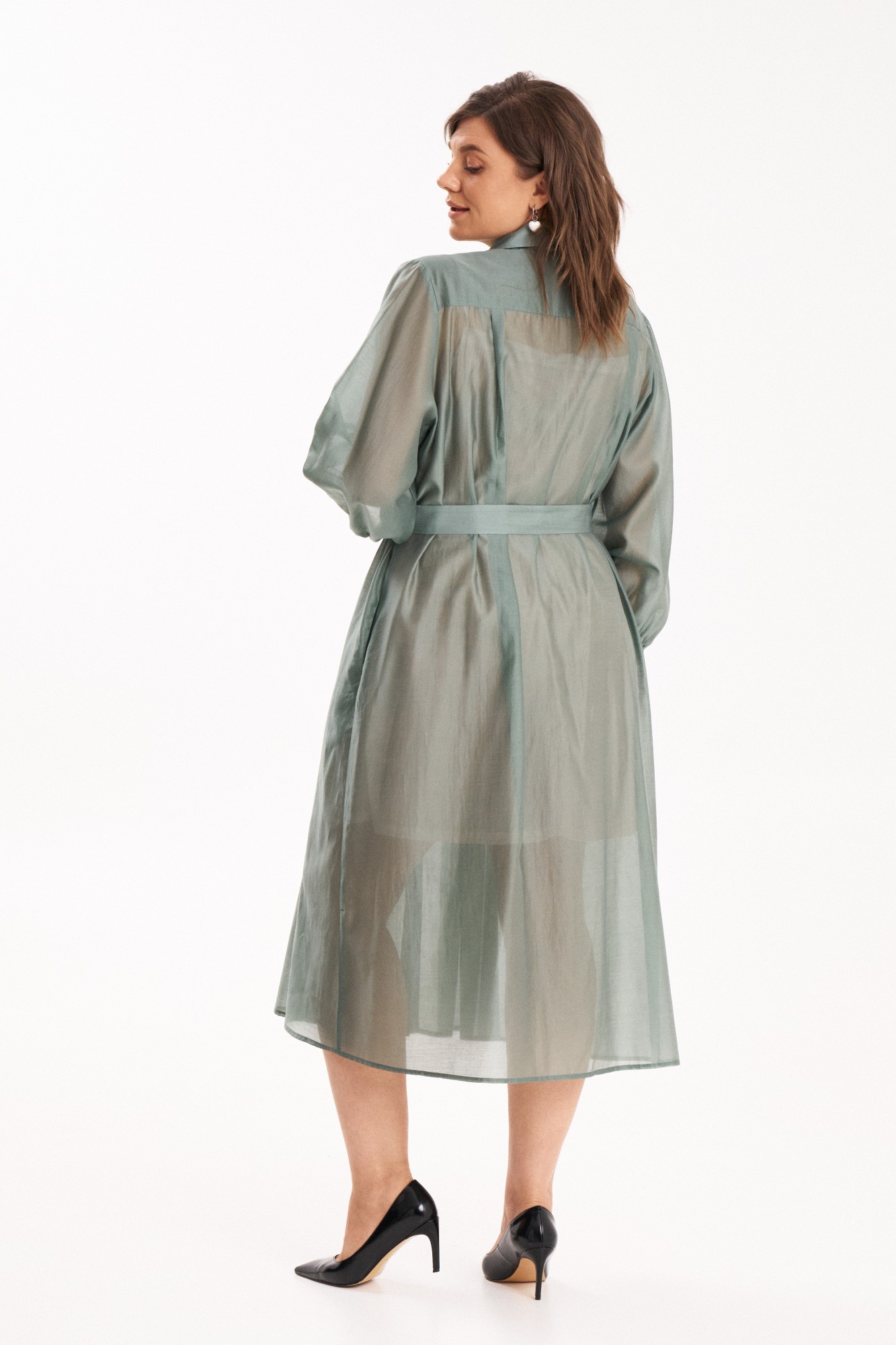 -платье А-силуэта из лёгкой вискозной вуали с рубашечным воротником и застёжкой на планку с пуговицами. По переду от плеча к талии заложены складки декорированные золотыми пуговками. Рукав длиной 7/8 на манжете. Комплектуется нижним платьем-комбинацией.