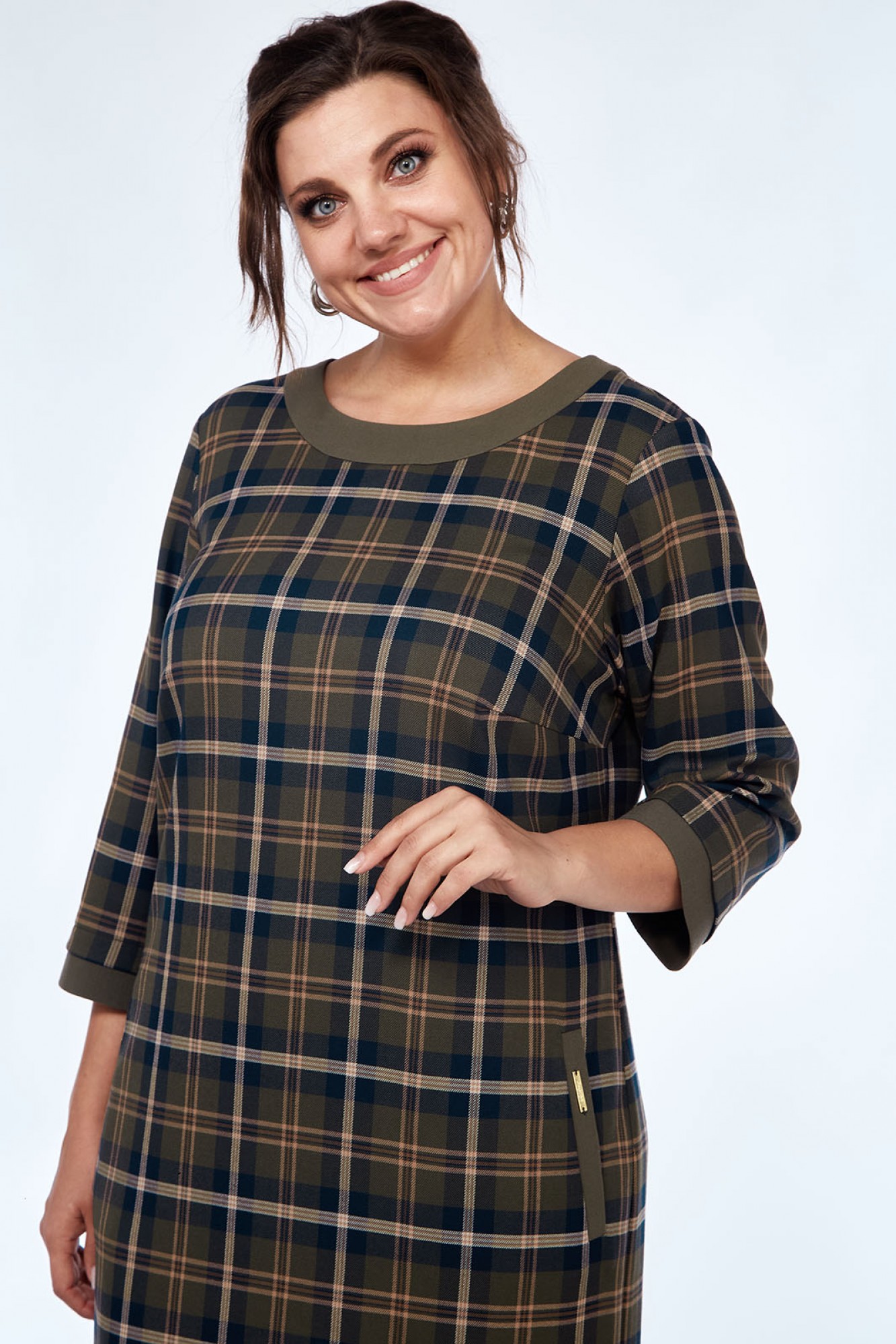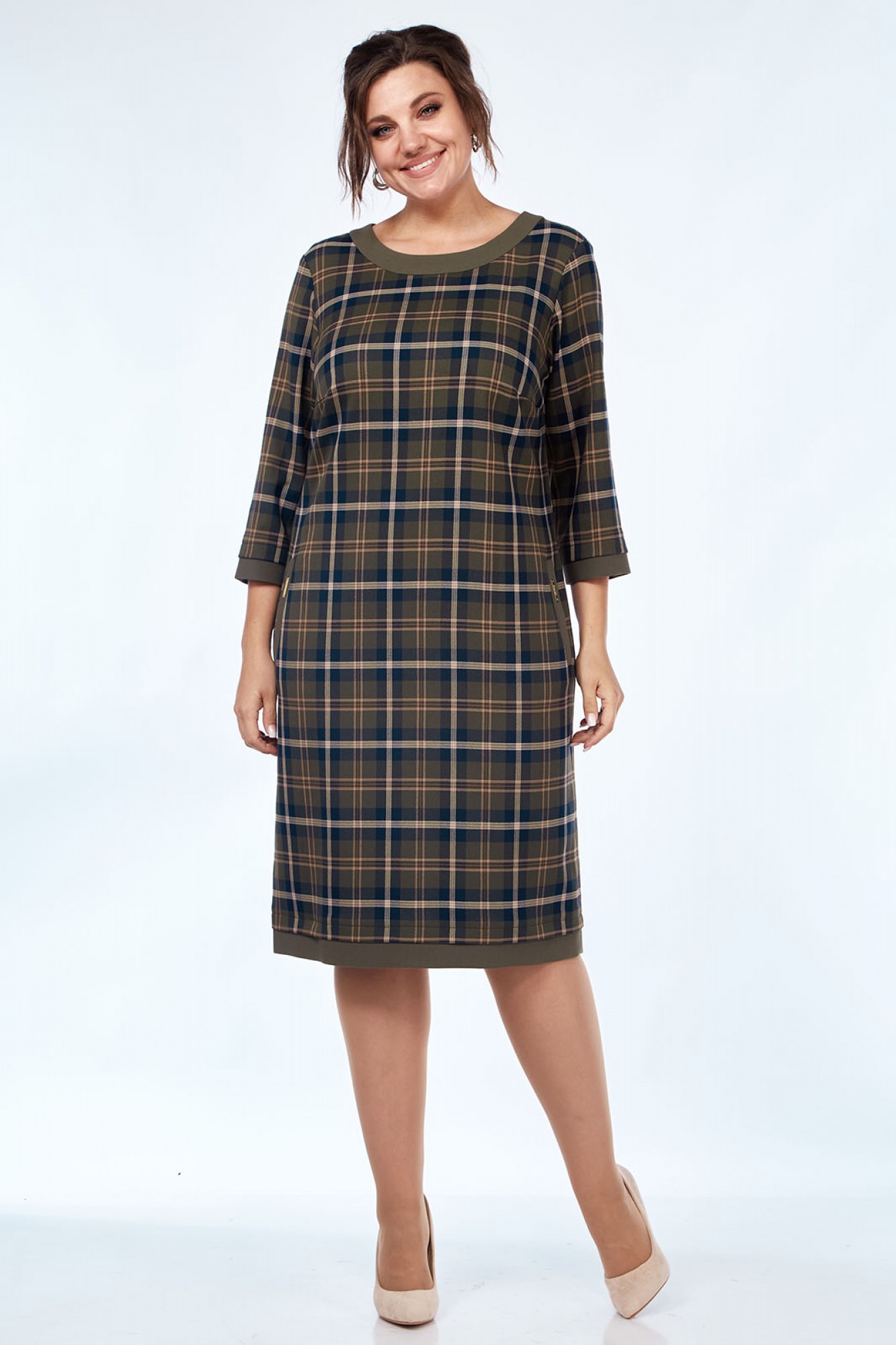 Платье прямого силуэта с круглым вырезом горловины и отрезной деталью по горловине. Перед с нагрудными вытачками и прорезными карманами с листочками. На листочках пришиты отделочные пластинки. Спинка со средним швом, в шве металлическая тесьма - молния. По низу платья отрезная деталь из отделочной ткани. Рукава втачные, одношовные, длинной 3/4. По низу рукавов притачные манжеты.