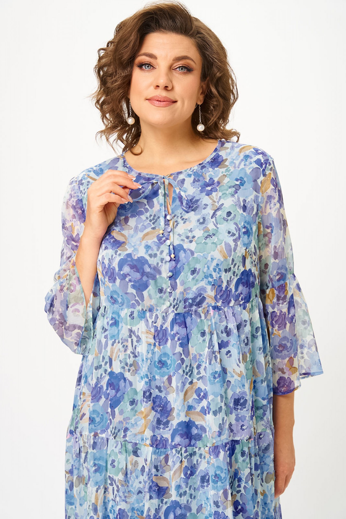 Платье А-силуэта, с круглым вырезом горловины, с завязками. Перед с нагрудными вытачками, пуговицами по среднему шву. Юбка платья состоит из 3-х воланов со сборками. Рукава втачные, одношовные, с воланами со сборкой, длиной 3/4. Платье на трикотажной подкладке.