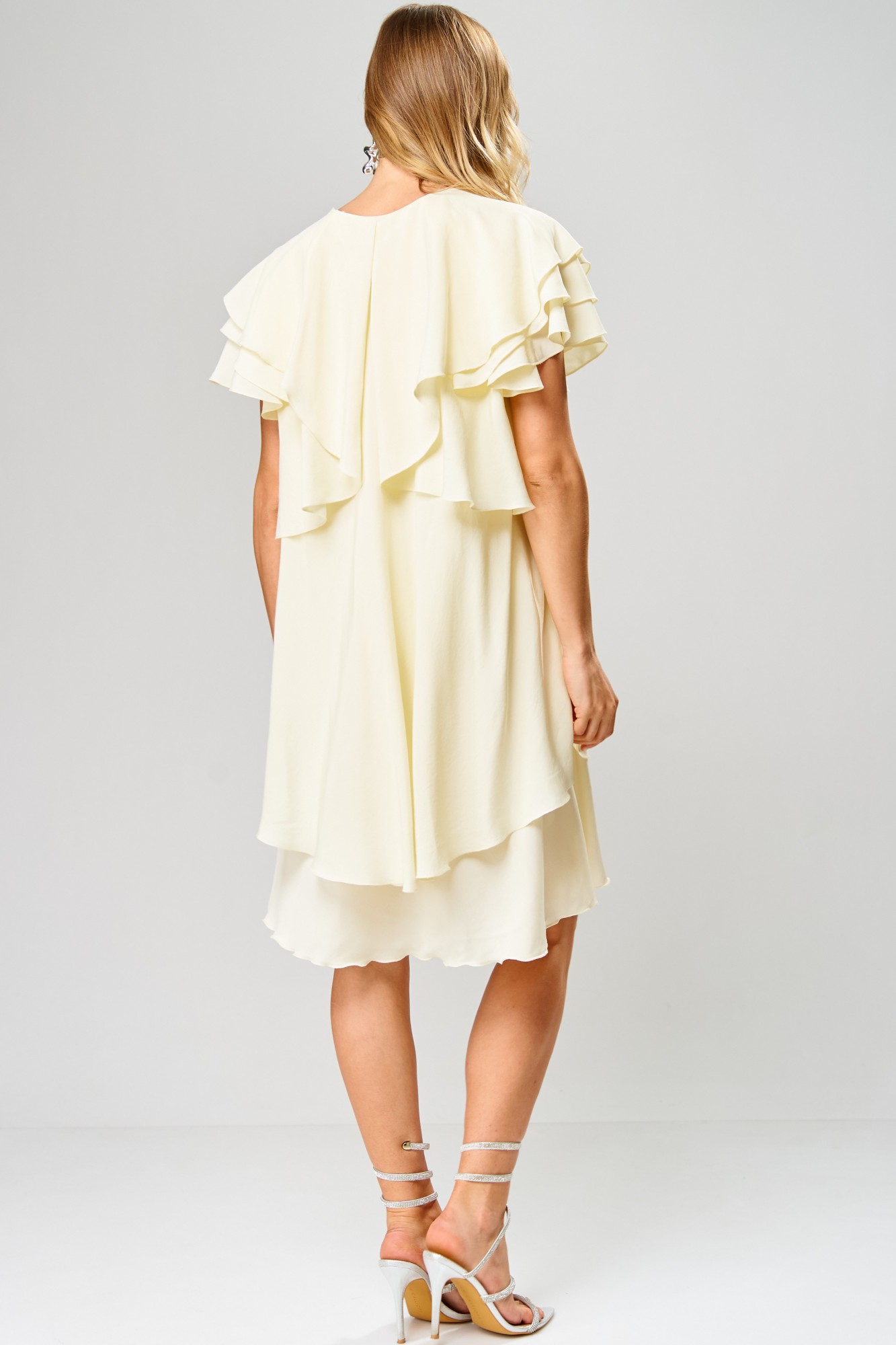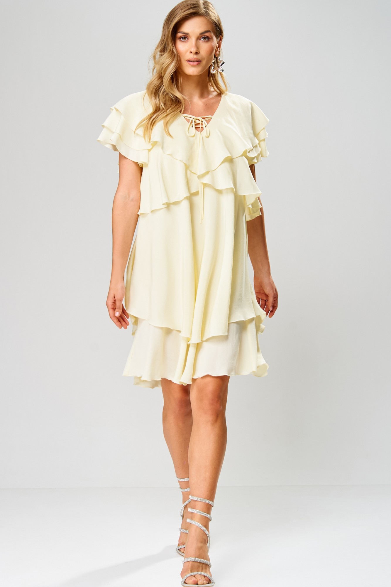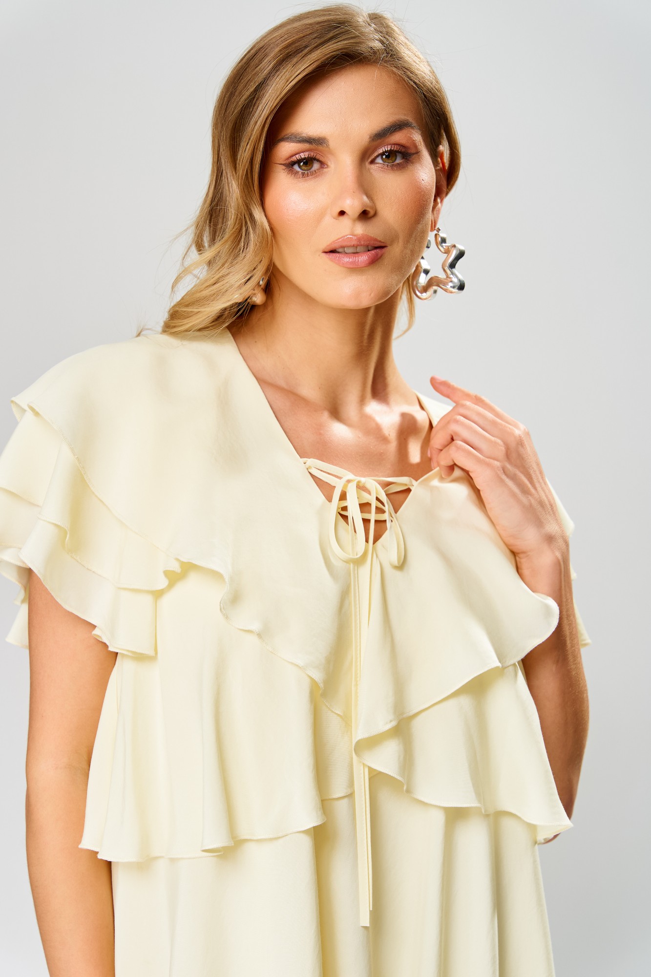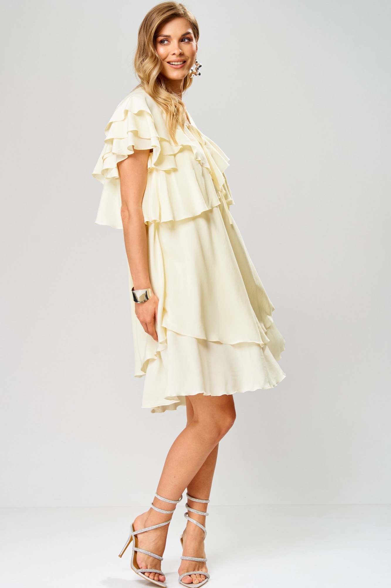 Платье женское, двухслойное, свободного силуэта, расширенное книзу, длиной до коленей, с втачными рукавами («воланы»). Детали переда и спинки с кокетками, в швах вставлен волан. По горловине вставлены отлетные воланы. Вырез горловины платья «V-образной» формы, по переду горловины вставлены 4 навесные петли для протяжки шнура.