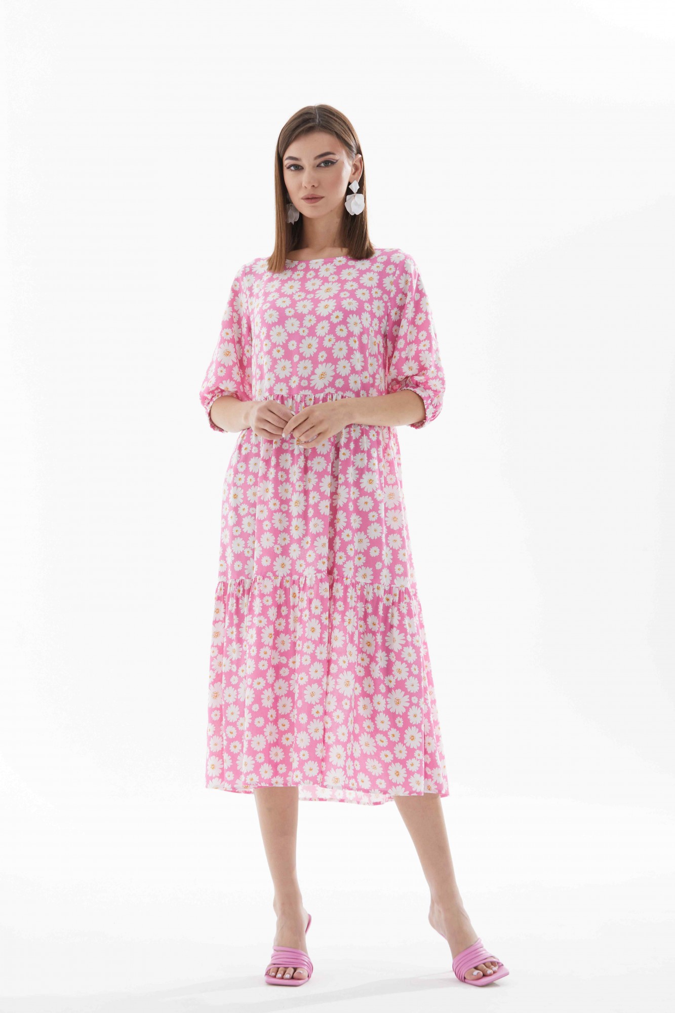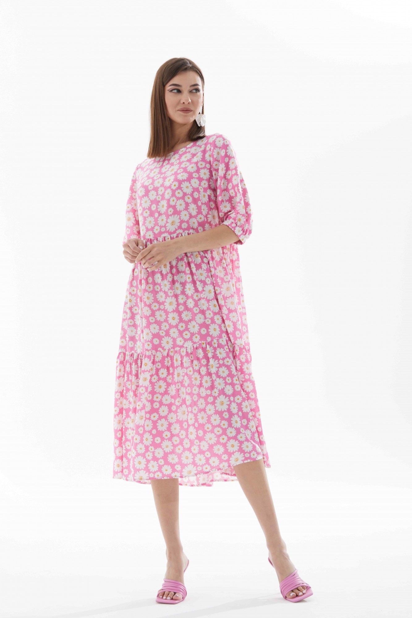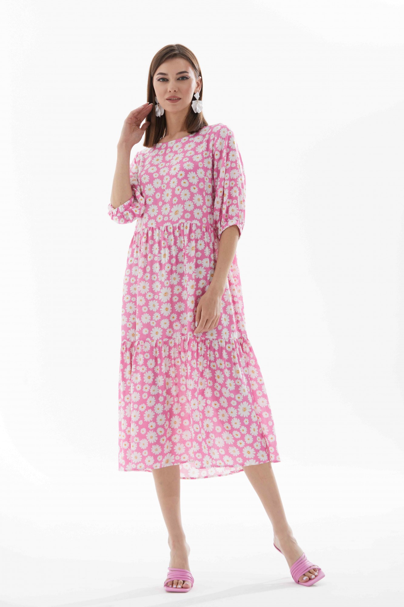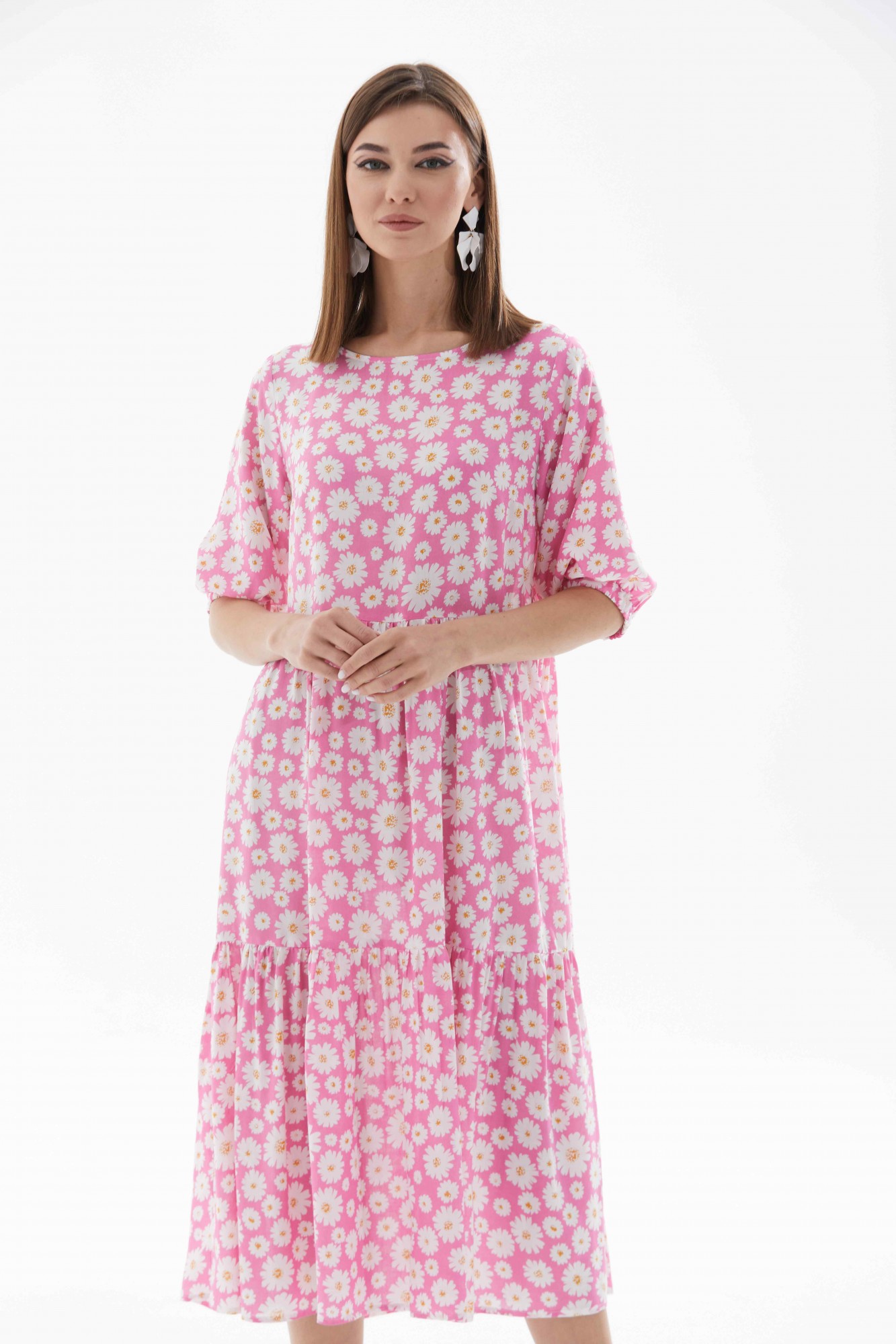 Платье свободного покроя, расширенное книзу из штапеля с цветочным принтом. Горловина округлая, на спинке завязки. Рукав втачной со сборкой по окату и резинкой по низу. Платье отрезное выше линии талии. По переду и спинке расположены горизонтальные подрезы и воланы со сборкой. Рост 164-170