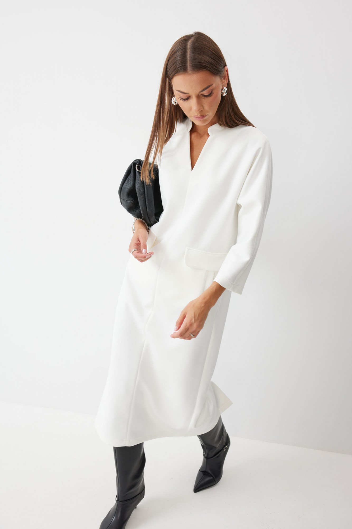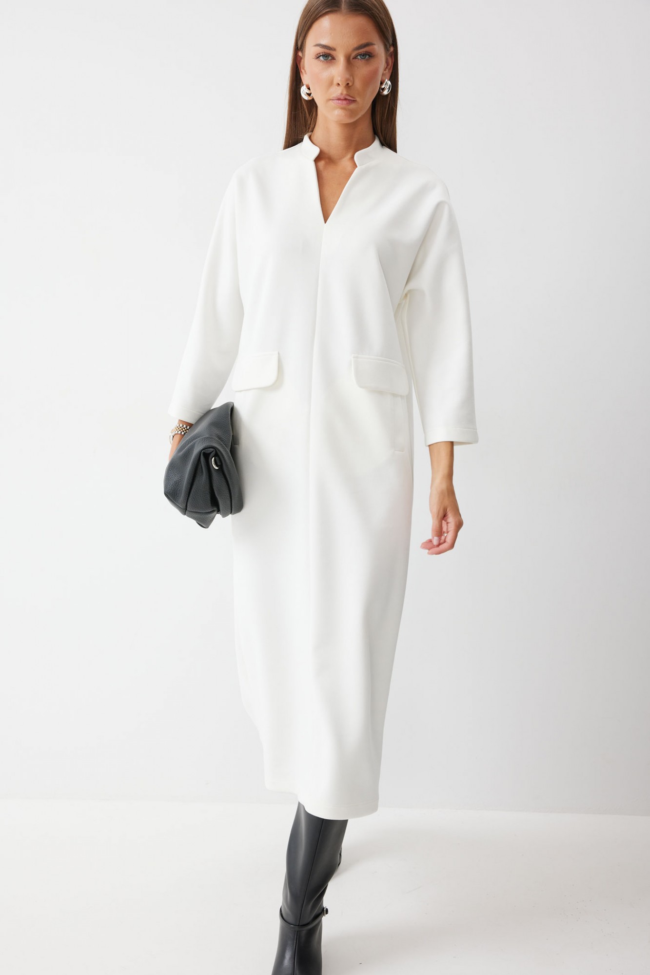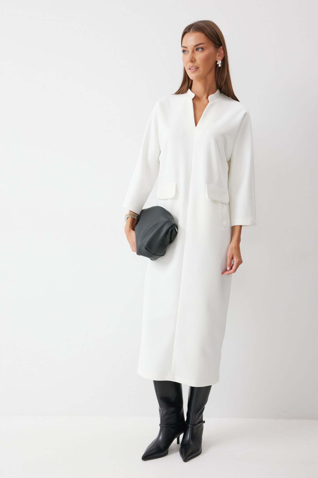 Платье прямого силуэта из трикотажного полотна длины миди. Рукав цельнокроеный, длиной ¾. Воротник-стойка. На передних половинках обработаны прорезные карманы с втачной листочкой и декоративным клапаном. По спинке расположен центральный шов с шпицей по низу.